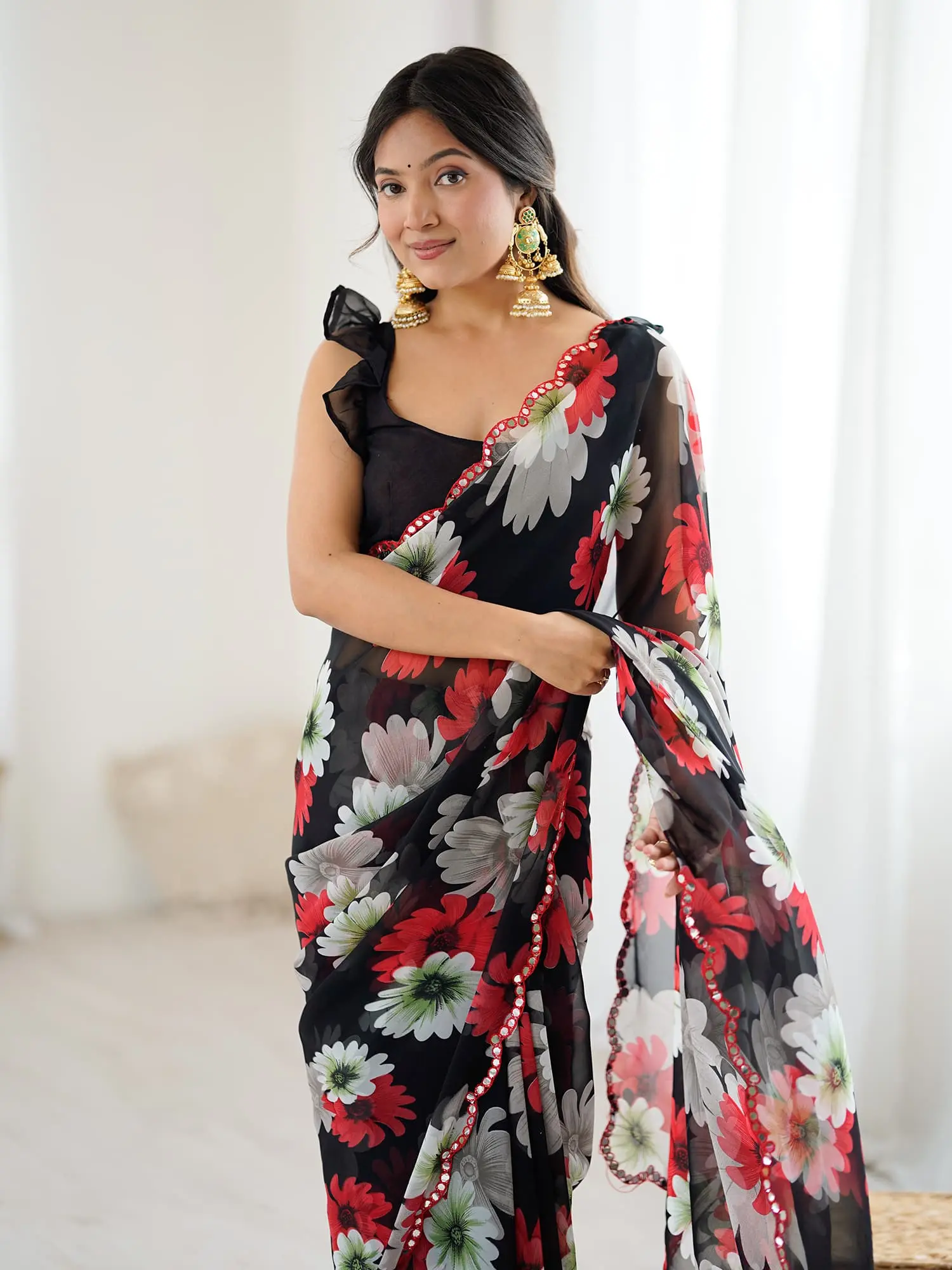 The captivating design features a dramatic floral motif set against a deep, rich base, creating a visually striking contrast. Each bloom bursts with life, rendered in vivid hues that exude both passion and grace. The fabric itself possesses a natural buoyancy, allowing it to cascade beautifully, enhancing your silhouette with every movement. The delicate scalloped border, often embellished with subtle detail, adds a final touch of refined artistry.