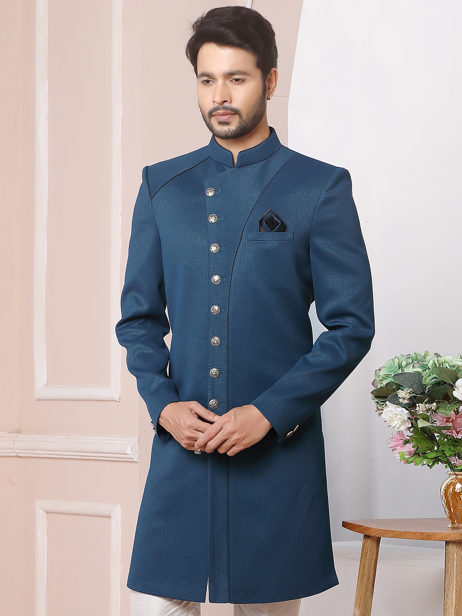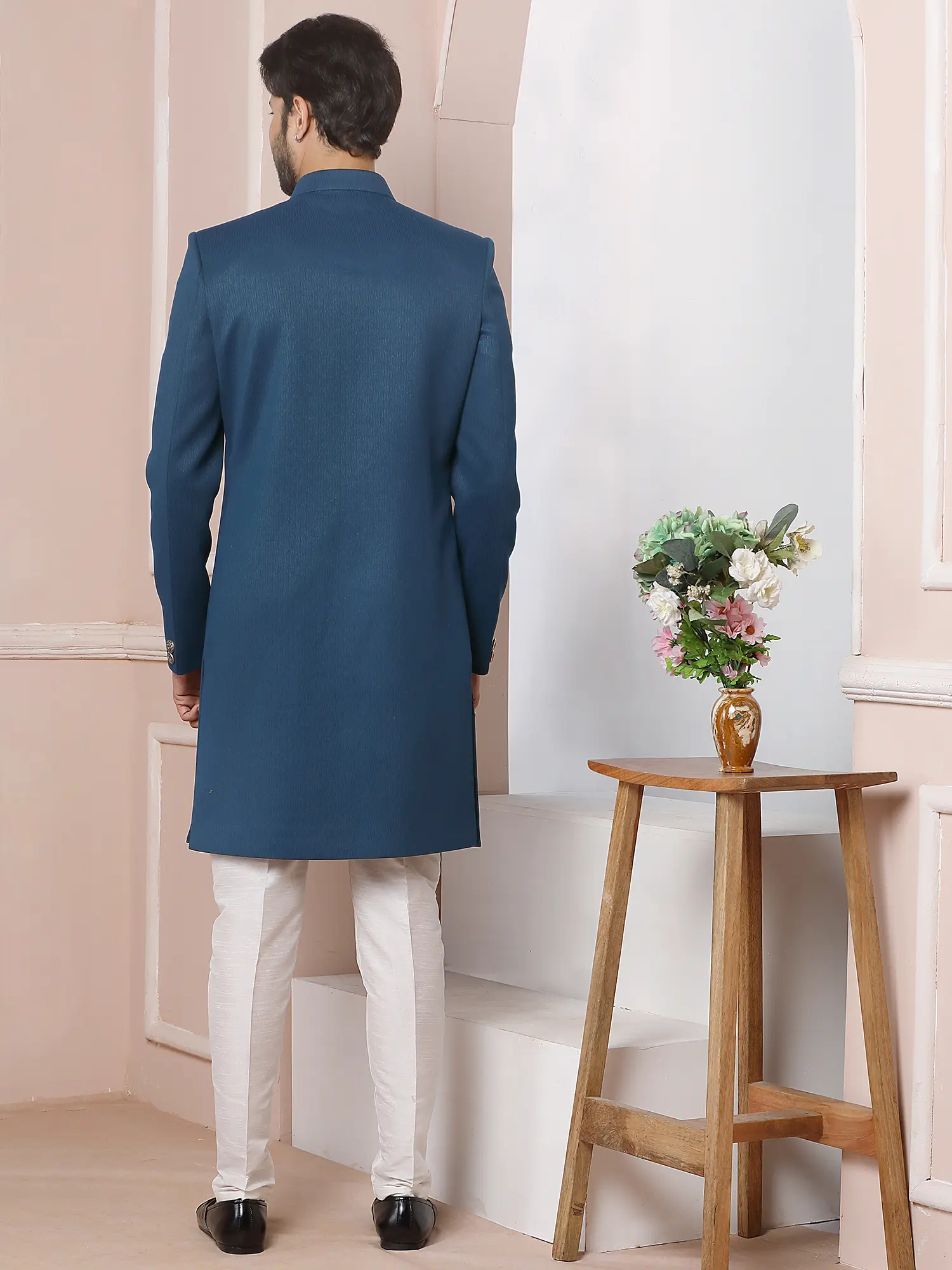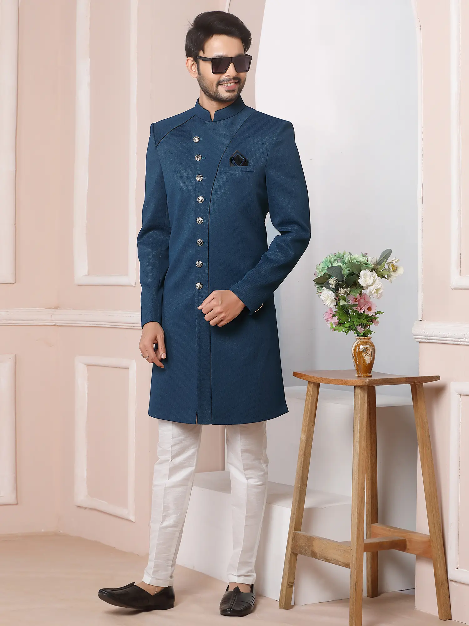 Imported Jacquard Silk Indo Western Sherwani With Dupion Art Silk Aligarhi Pant For Wedding Groom Men