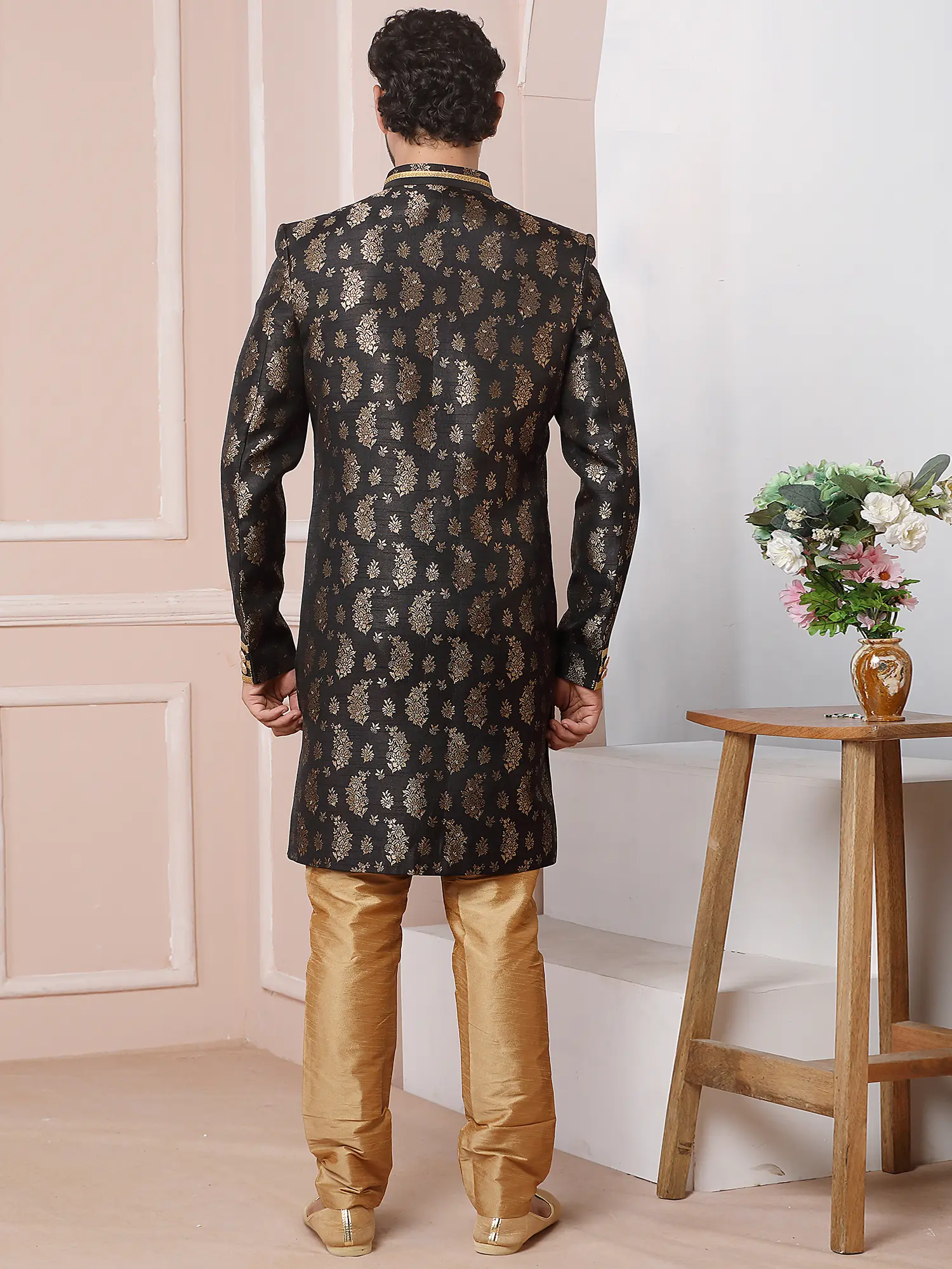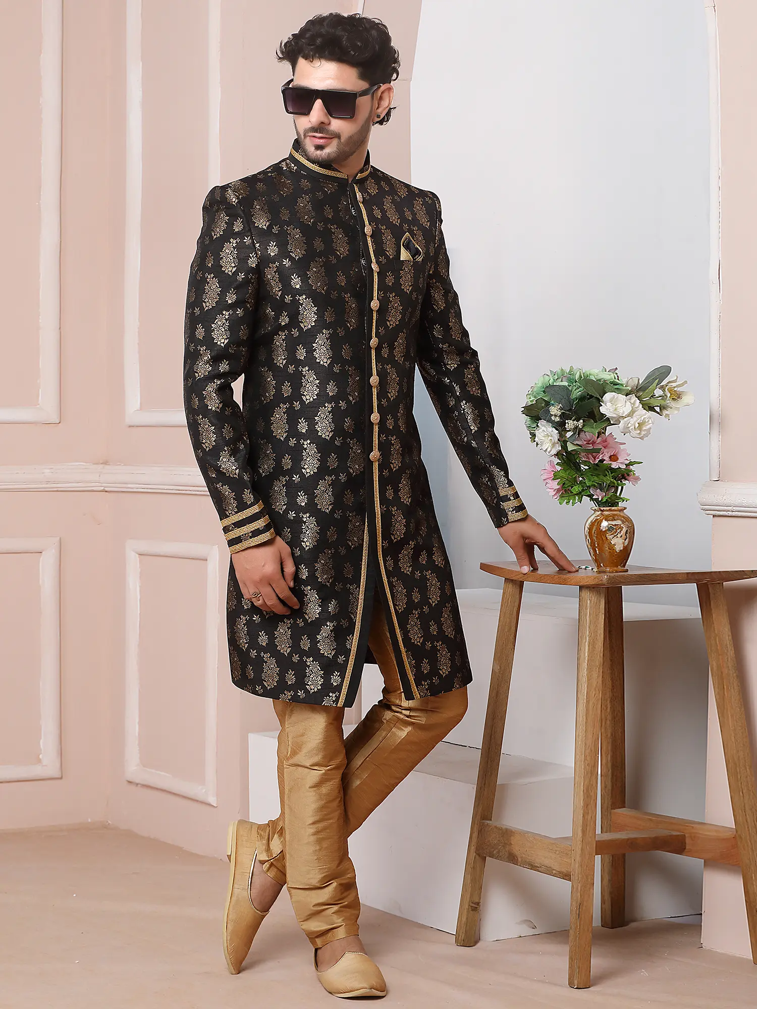 Elegant Jacquard Silk Indo Western Sherwani With Luxe Dupion Art Silk Aligarhi Pant For Wedding Sangeet Glam