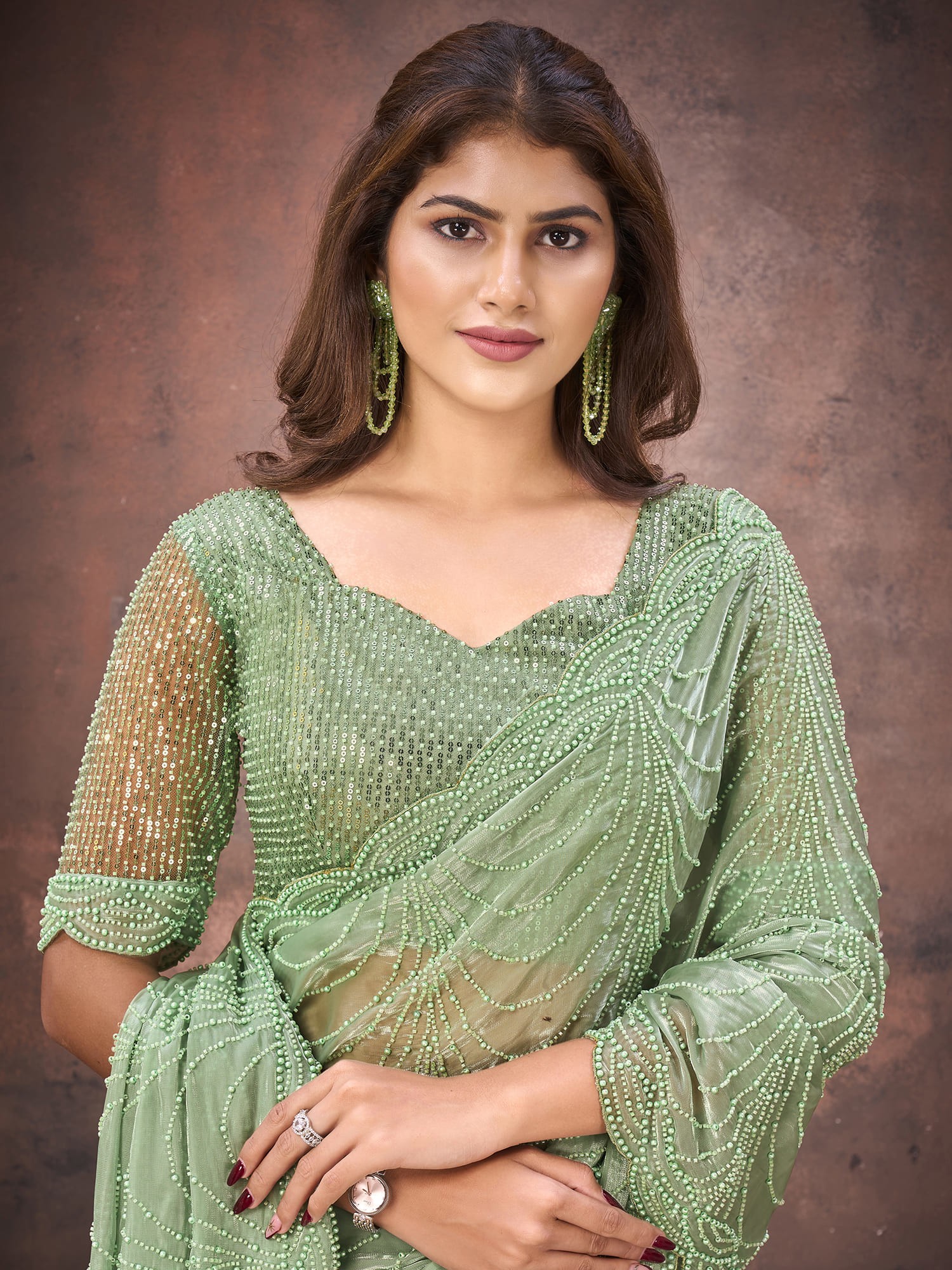 Gorgeous Fendy Satin Saree Adorned With Sequence Moti And Cutdana Embellishments Perfect For Designer Partywear