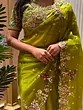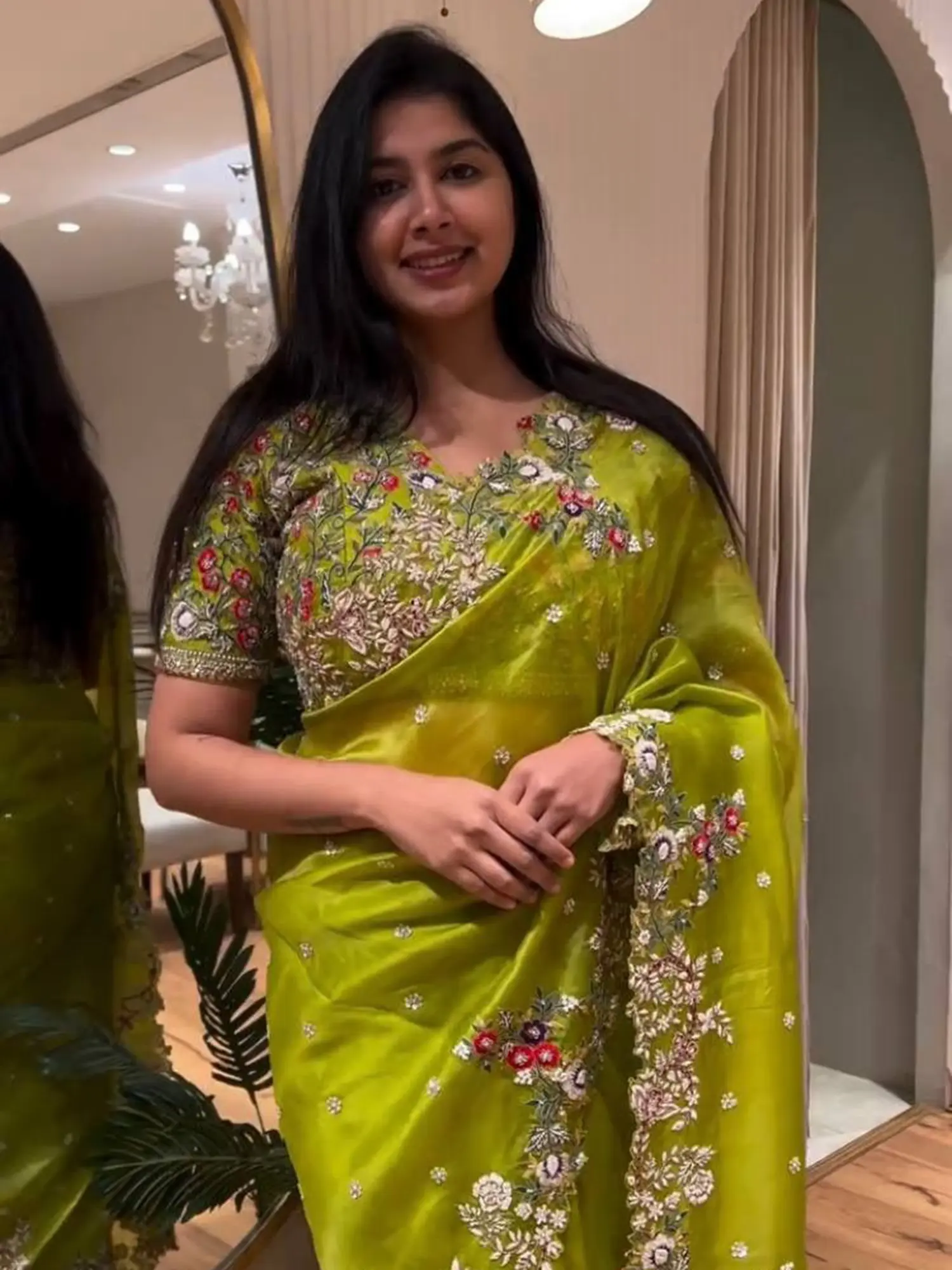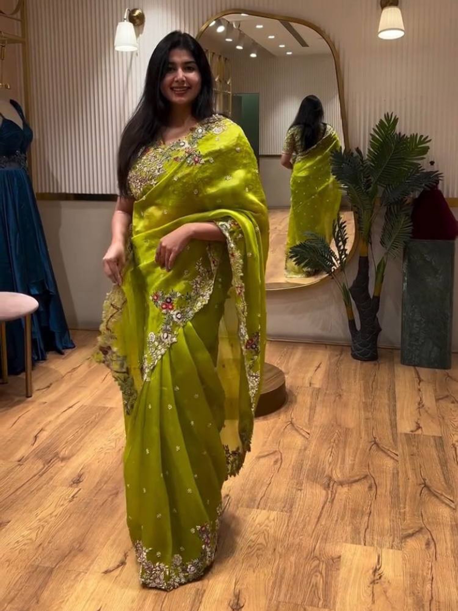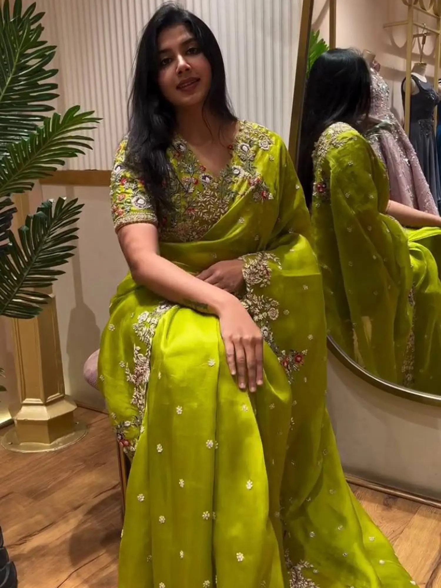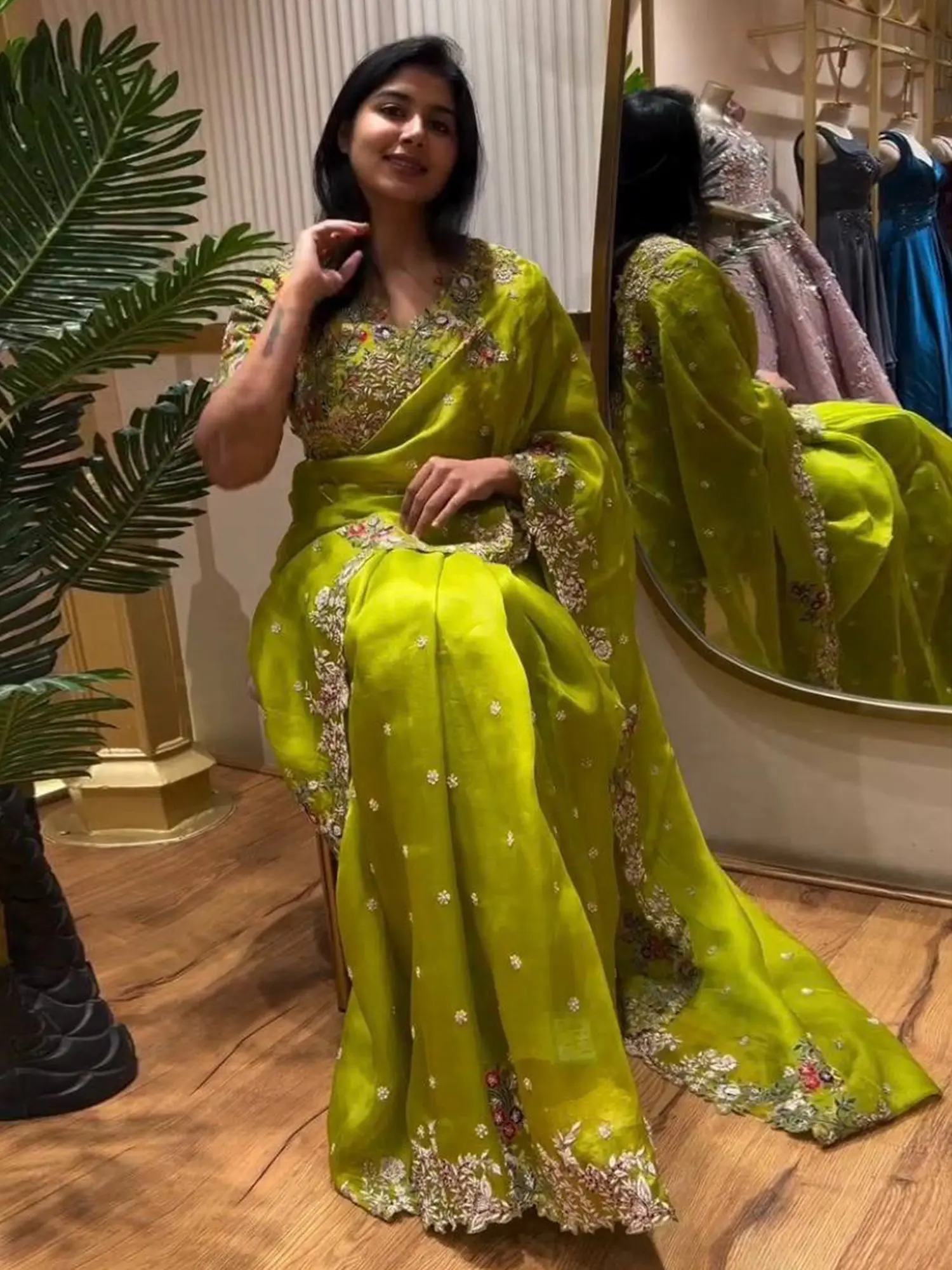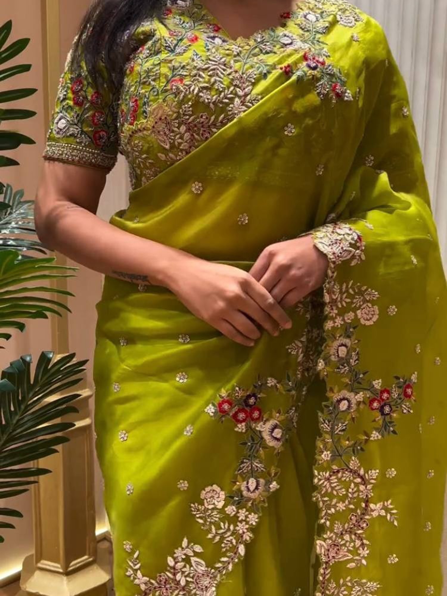 The vibrant hue of the silk provides a captivating canvas for the intricate hand-embroidery that graces its borders and pallu. Delicate sequences are artfully interspersed, catching the light with every graceful movement and adding a celestial shimmer. The tailored blouse complements the saree beautifully, offering a structured silhouette that enhances the overall aesthetic.
