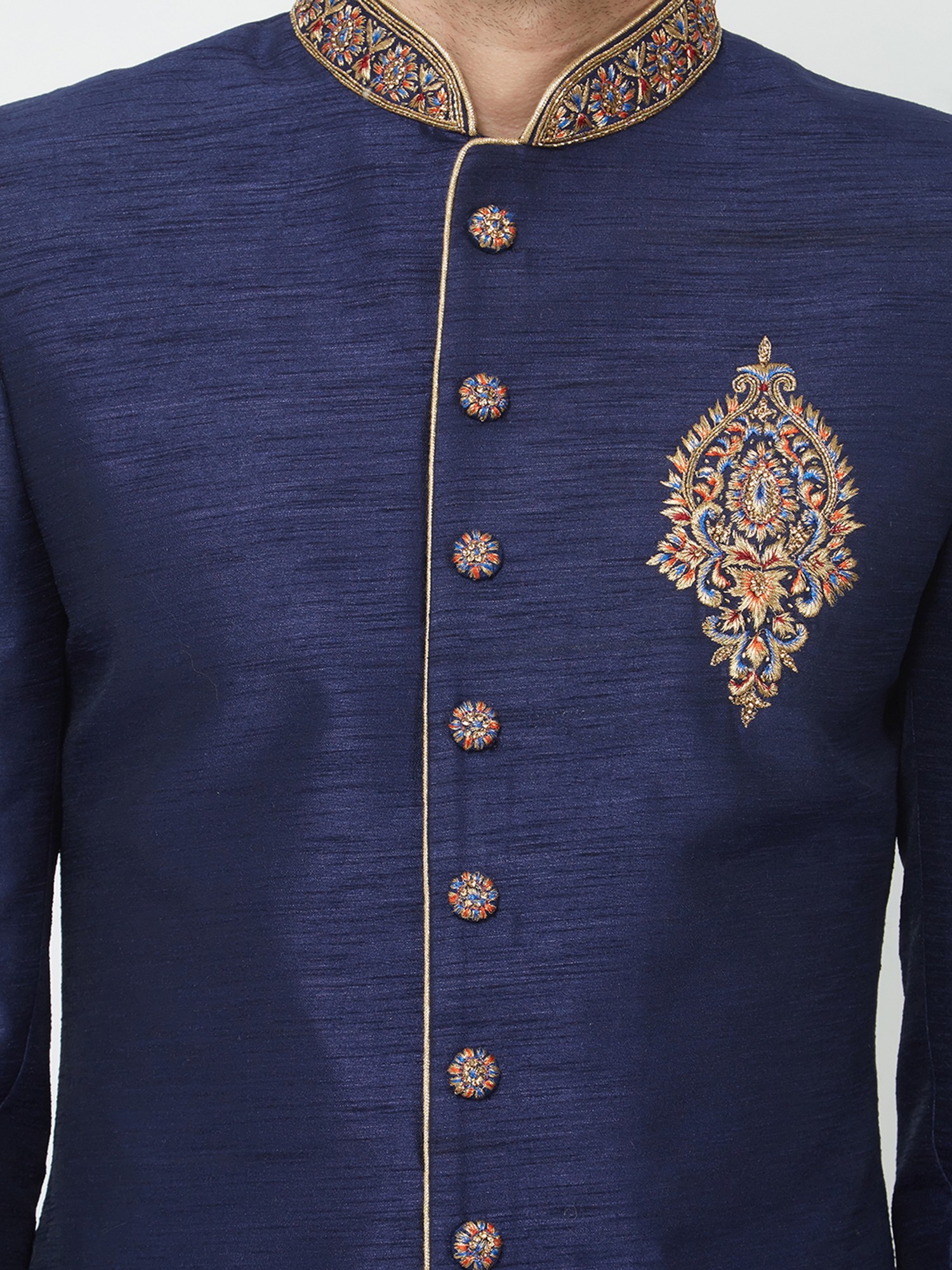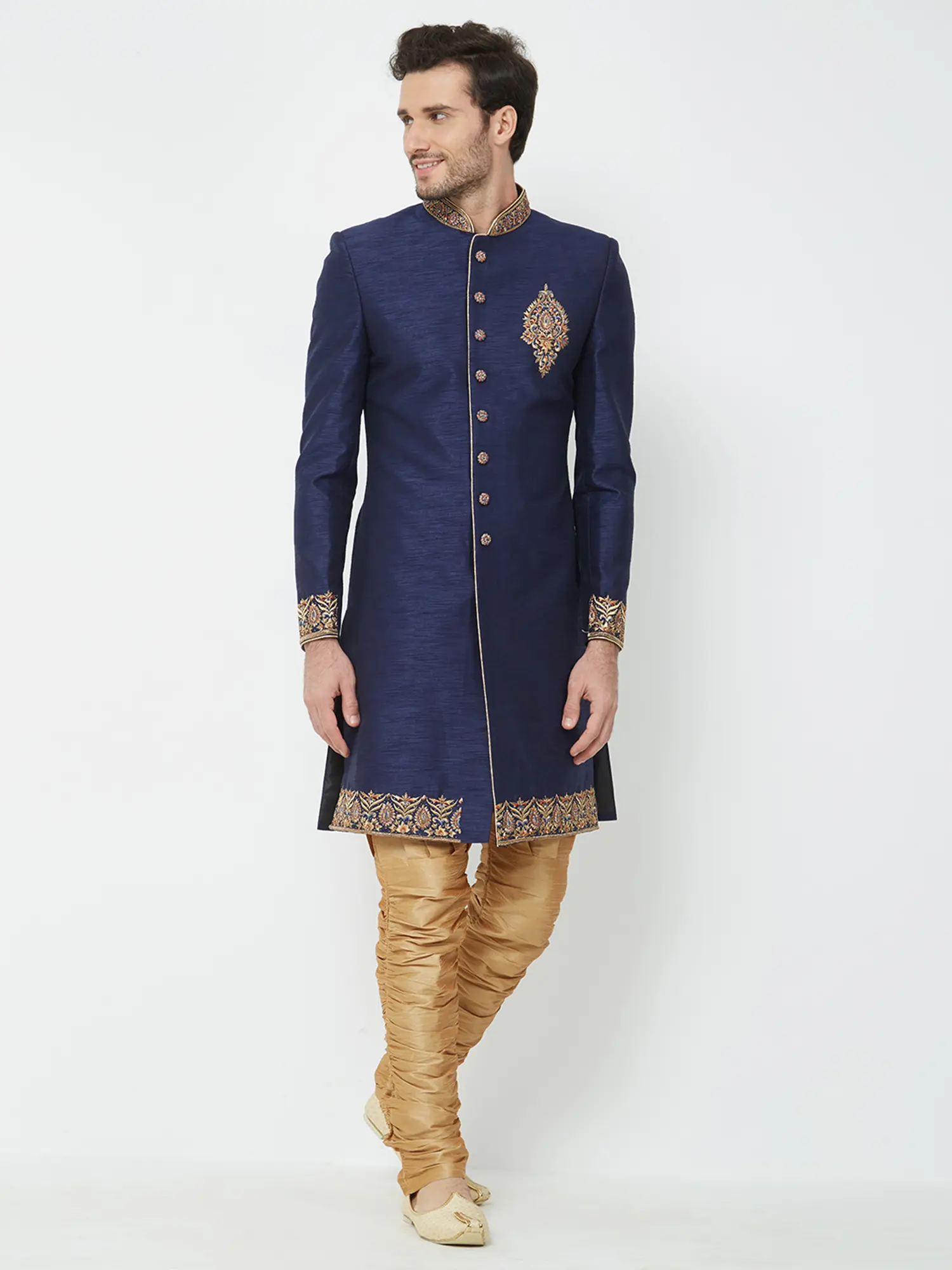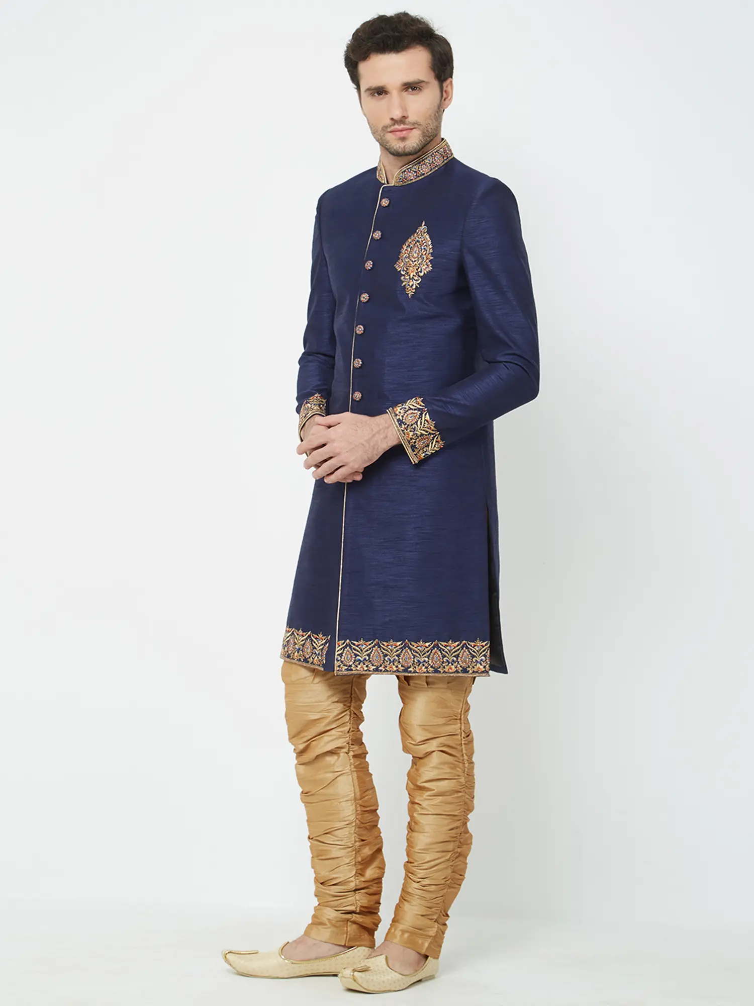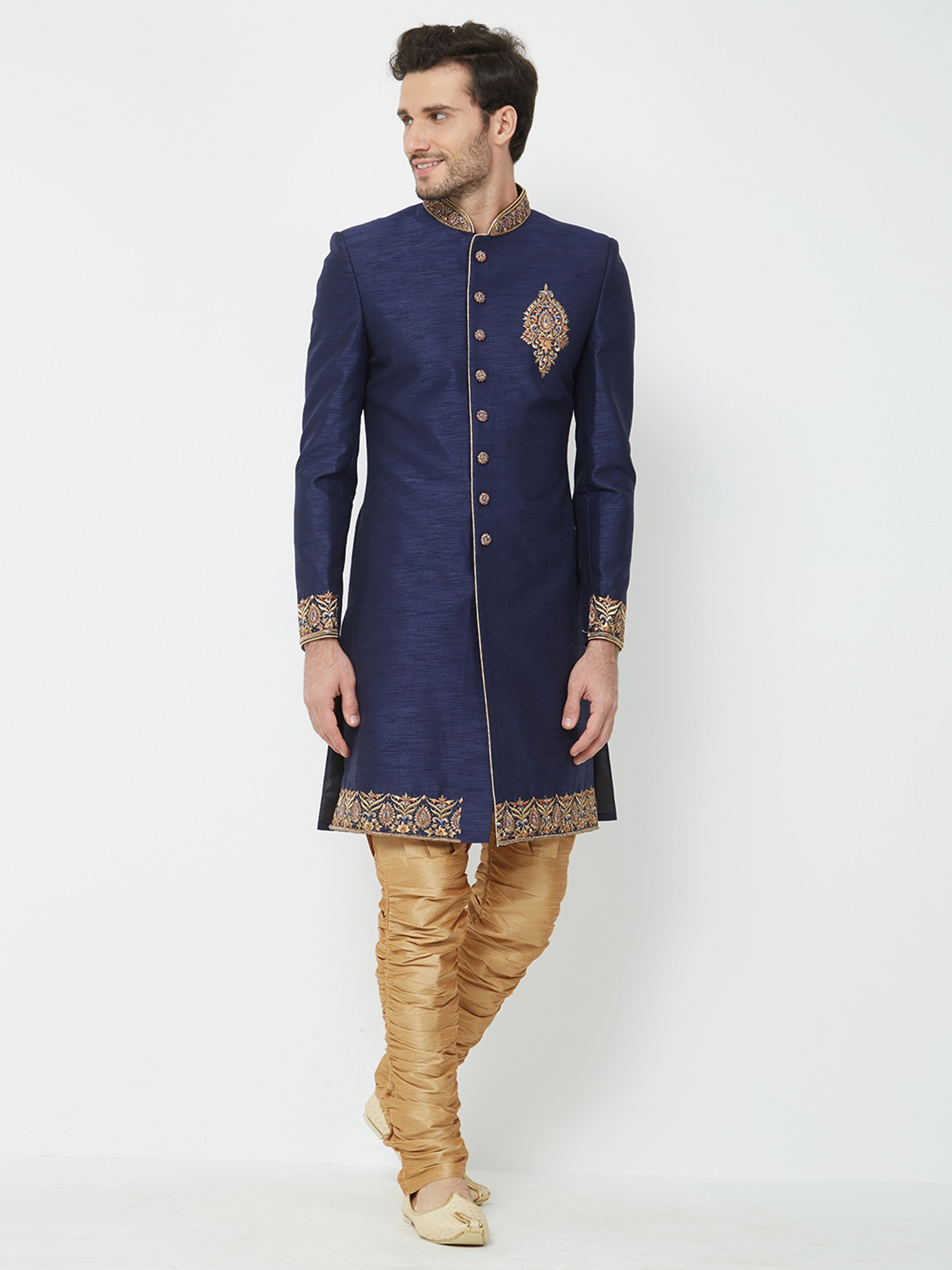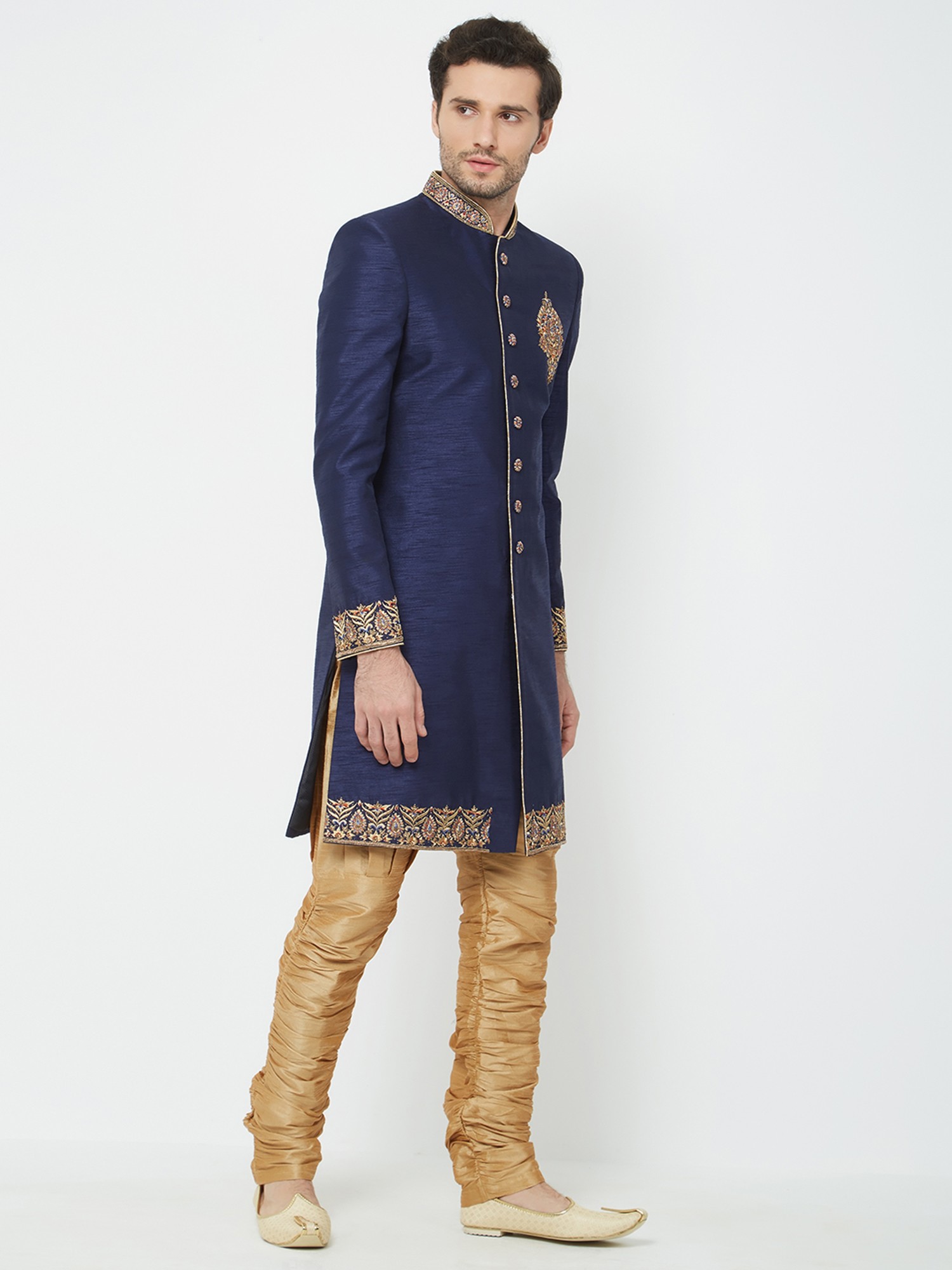 Features a rich navy blue art silk sherwani adorned with intricate gold hand embroidery on the collar, cuffs, and chest.