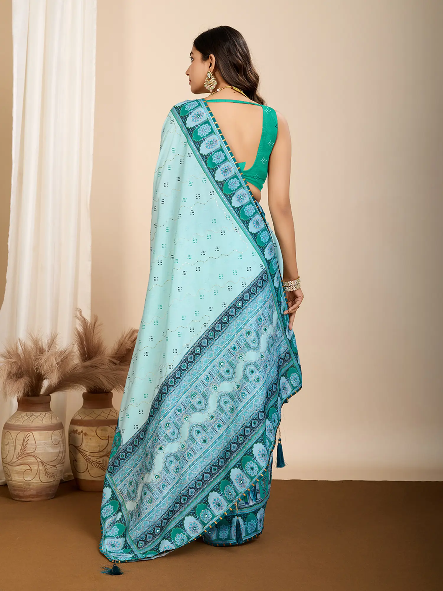 Lisbon-Brown Sequins Work Wide Border Polka Dots Elegant Chiffon Festive Wear Saree