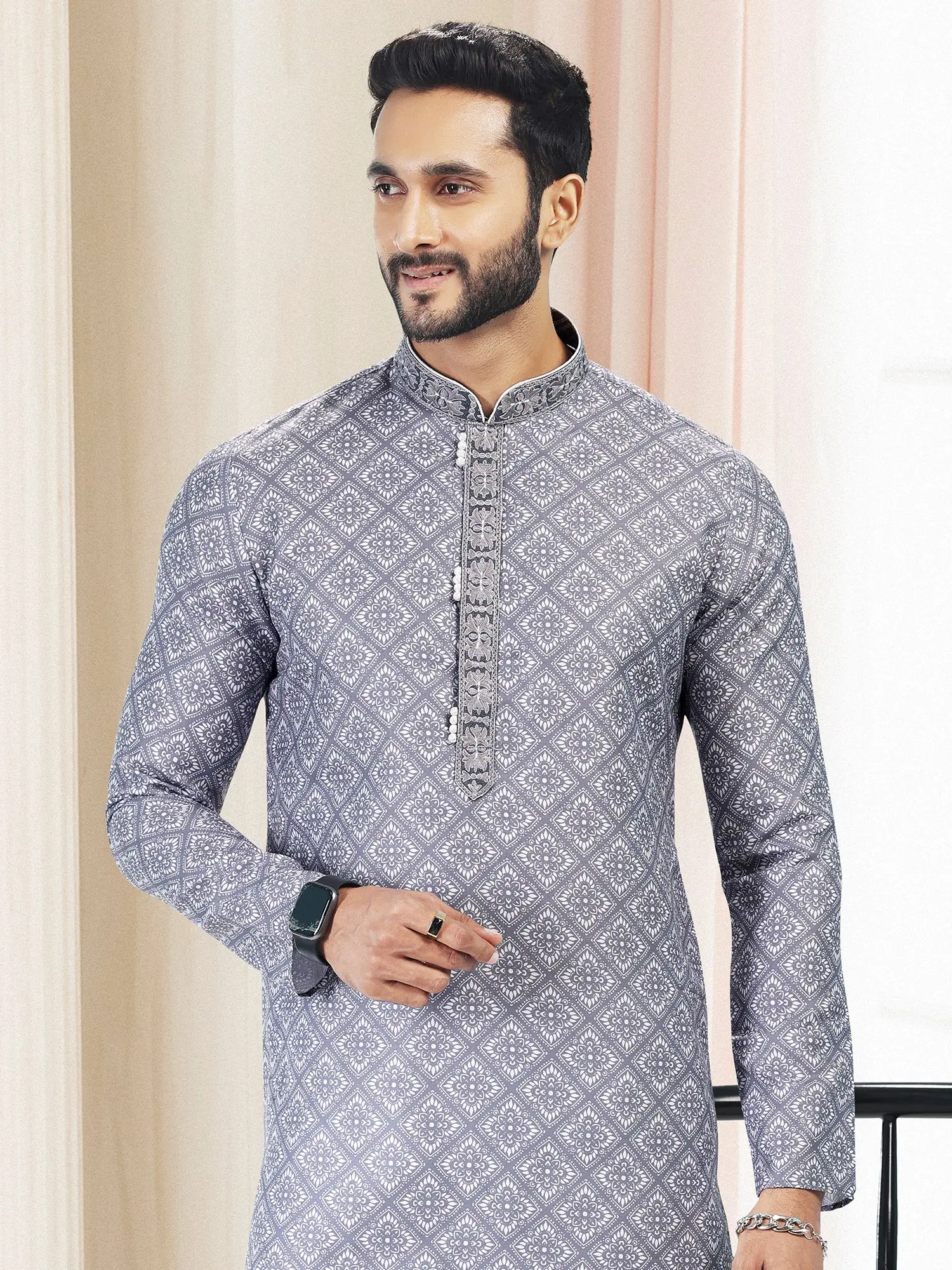 Adorn yourself in a captivating all-over geometric print that strikes a perfect balance between tradition and contemporary aesthetics. The intricate pattern, rendered in a subtle yet striking hue, draws the eye with its visual rhythm. Delicate embellishments grace the neckline, adding a touch of artisanal charm that elevates this piece from mere attire to a statement of discerning style. The accompanying lower garment provides a clean, complementary silhouette, ensuring a polished and complete look.