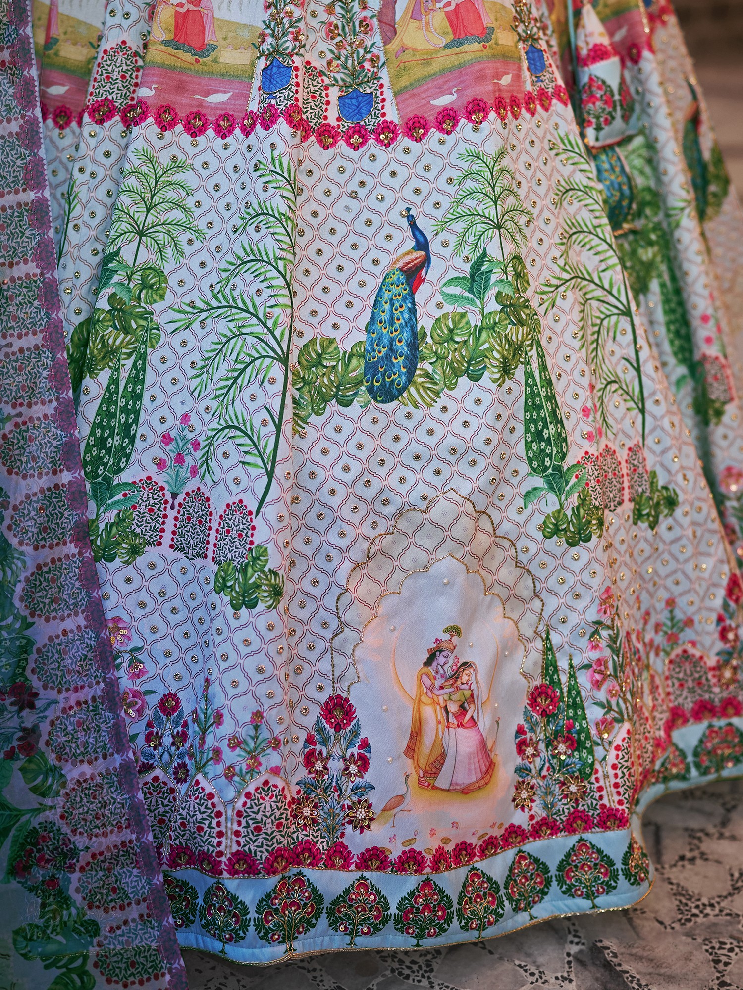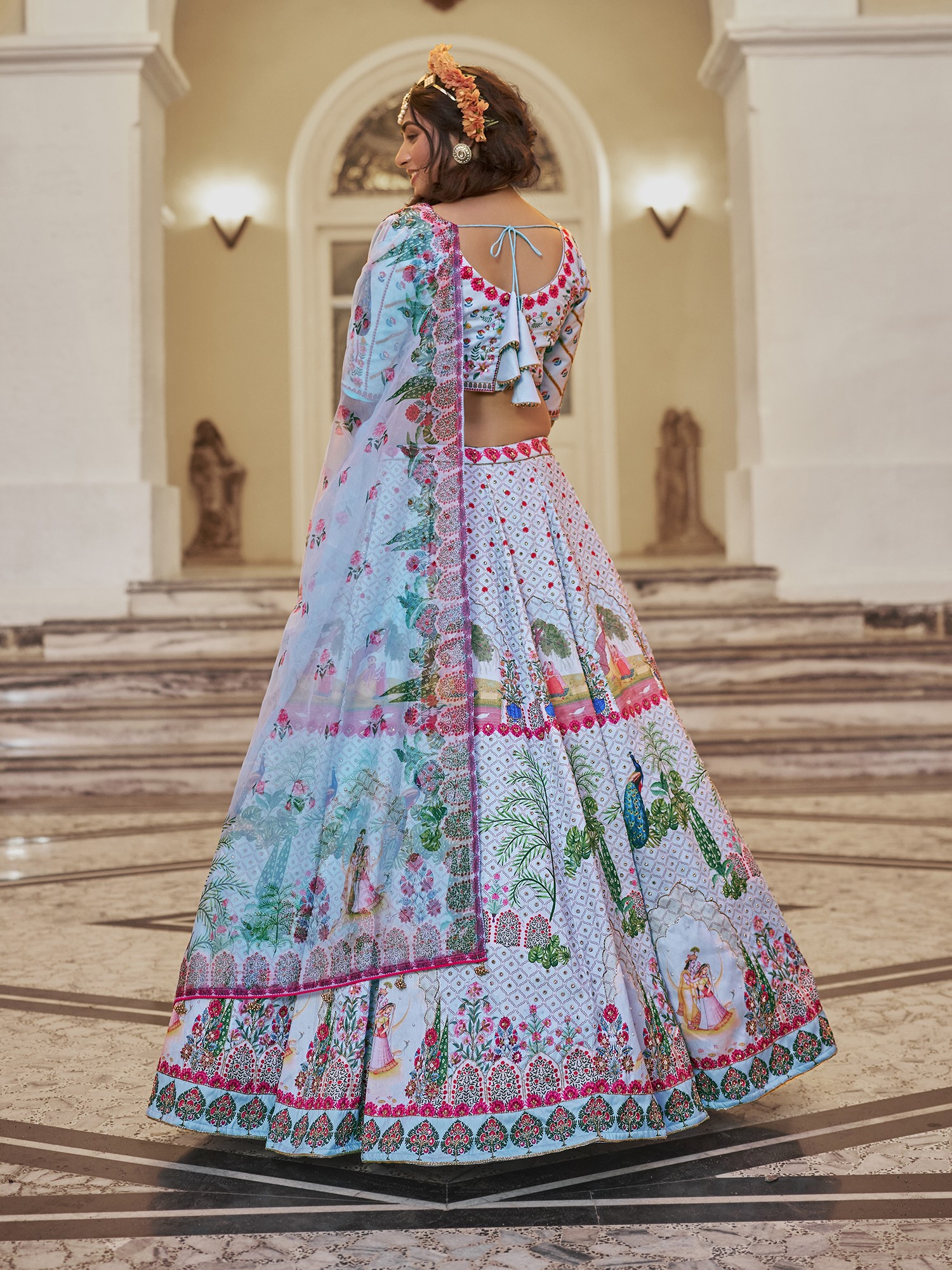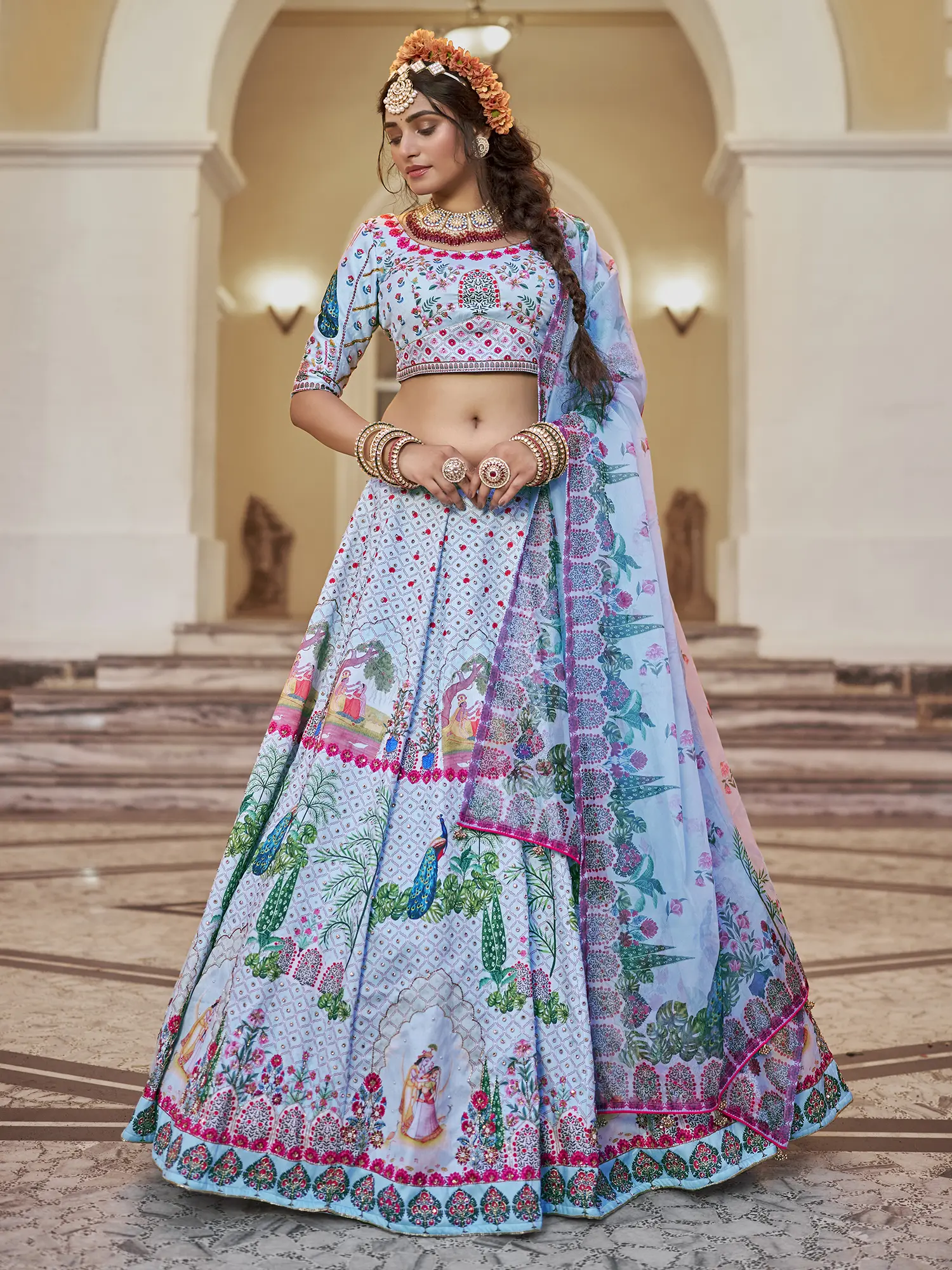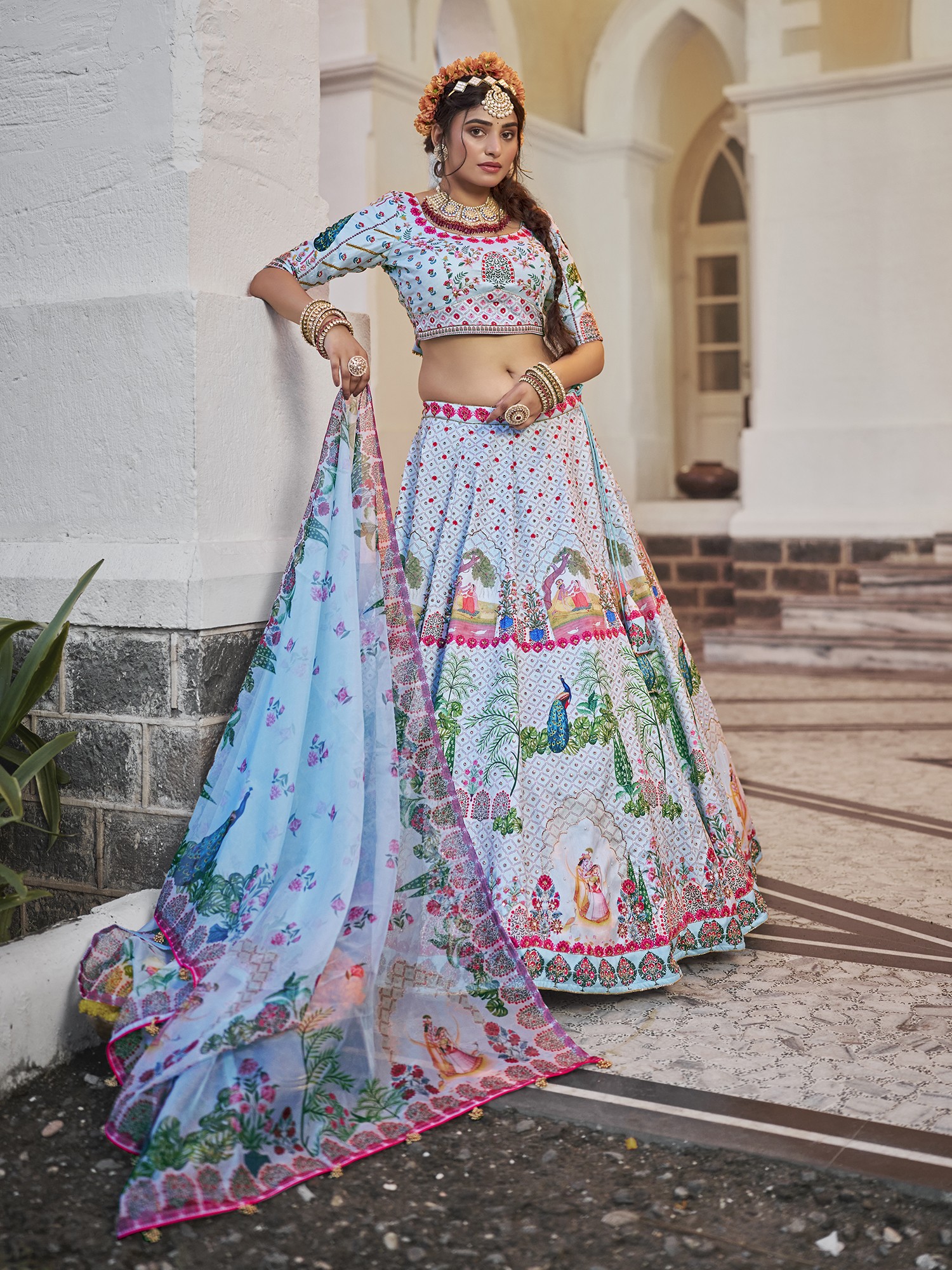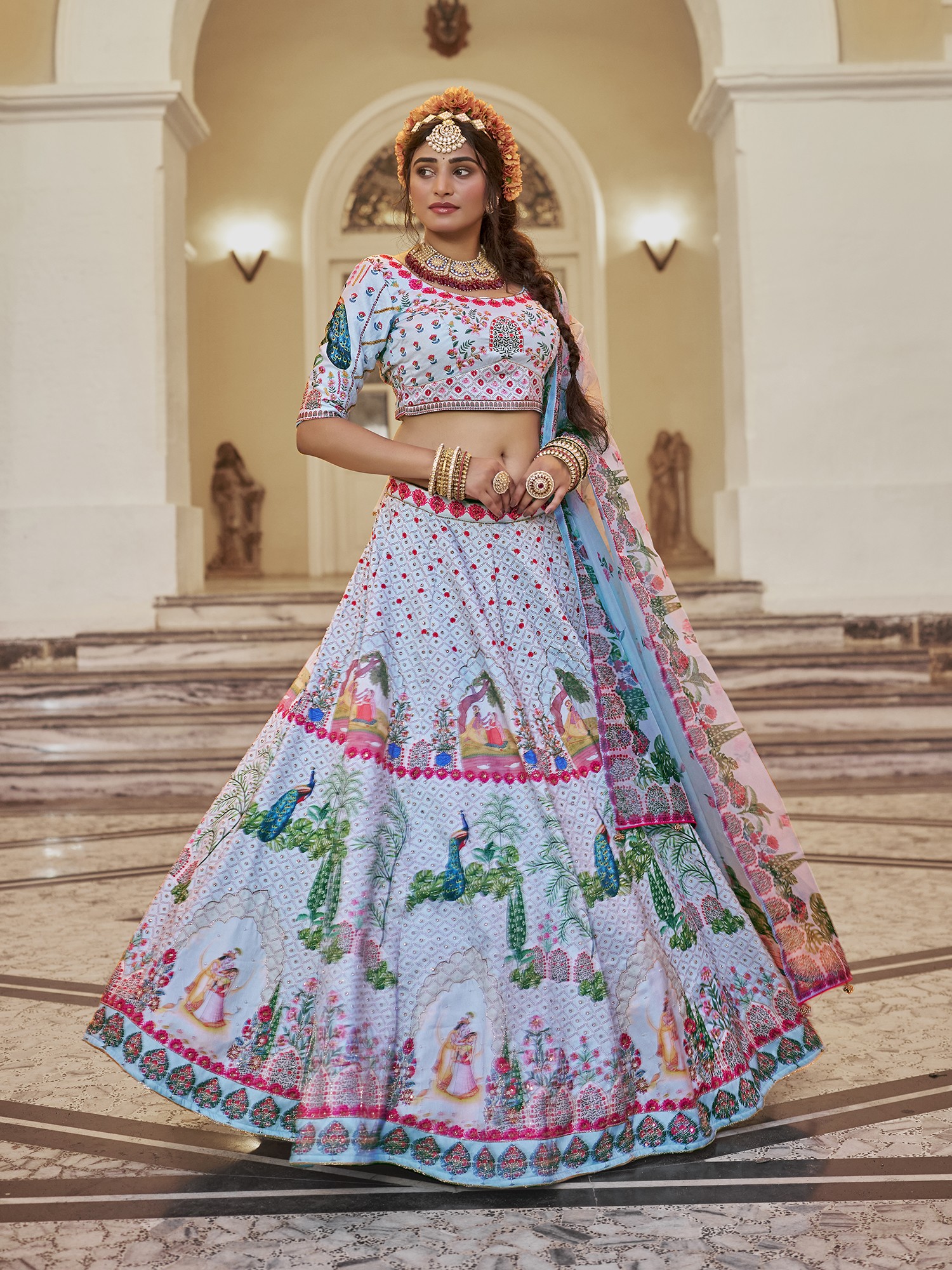 Bandhani And Paisleys Motifs Printed Satin Elegant Lehenga Choli With Attractive Sequins Work Dupatta