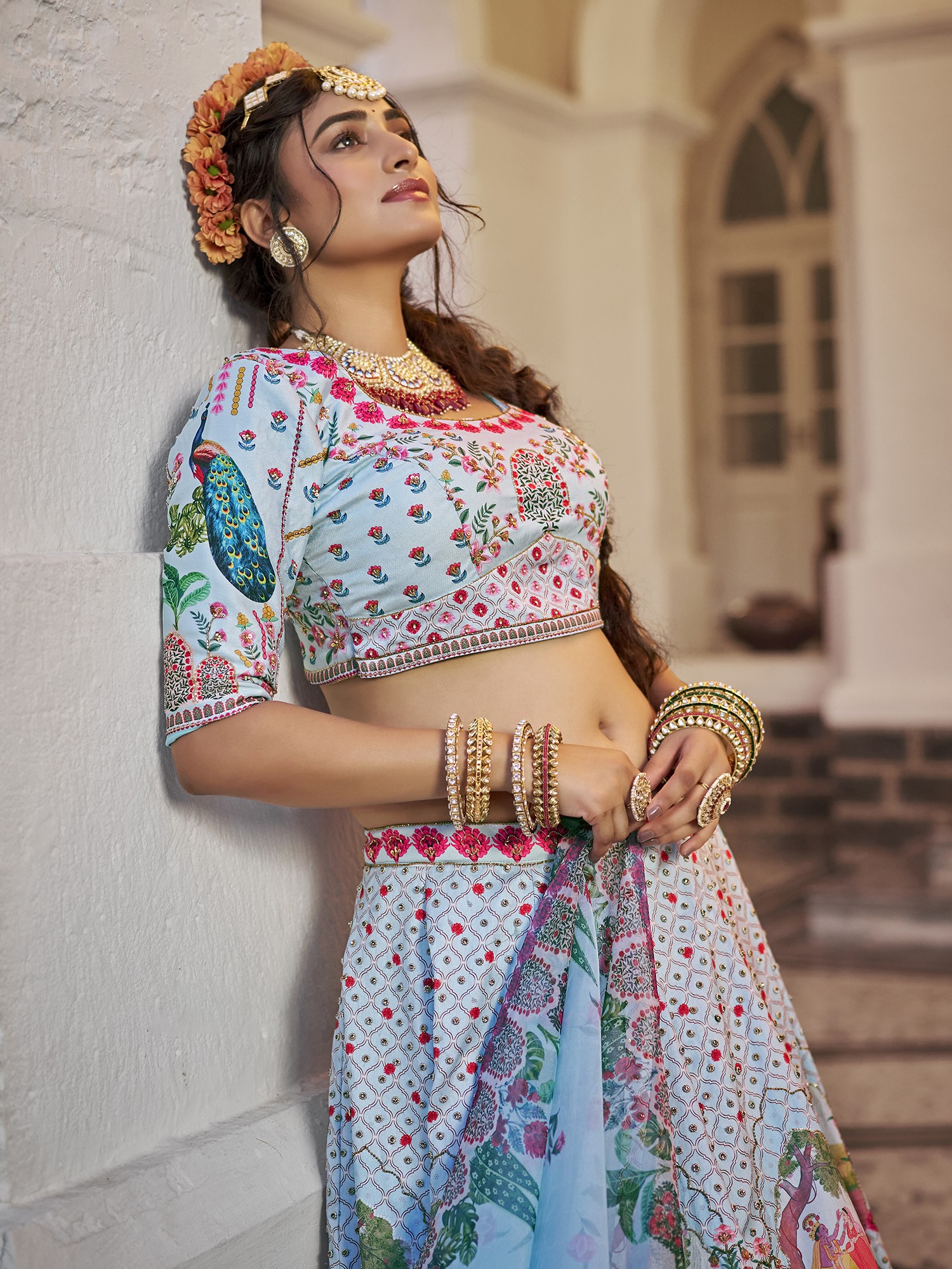 Banarasi Silk Peacock Motifs Embroidery And Sequins Work Elegant Lehenga Choli With Soft Net Dupatta