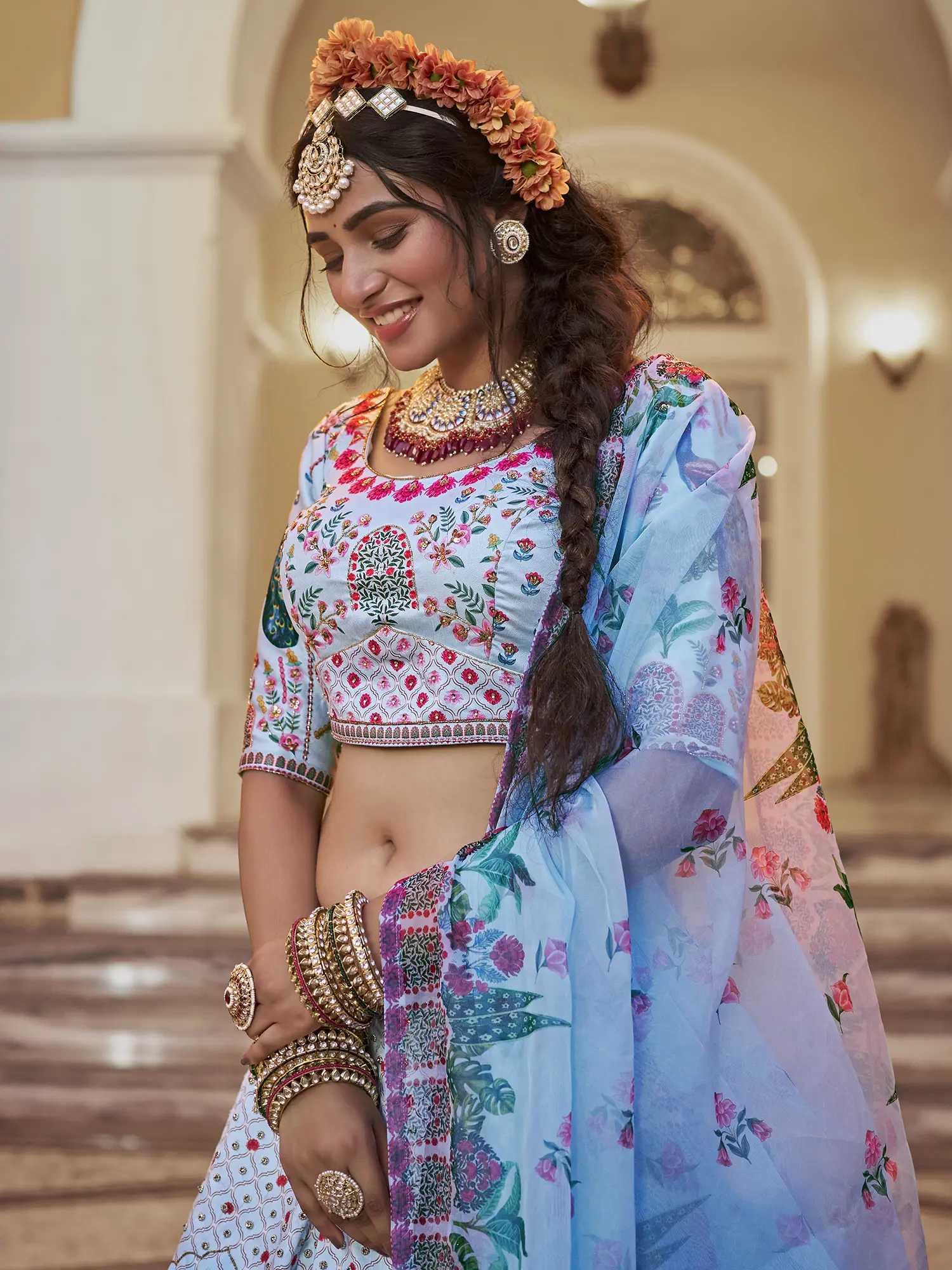 Elegant Ari And Patch Work Floral Wedding Occasion Banarasi Silk Lehenga Choli With Net Embellished Dupatta