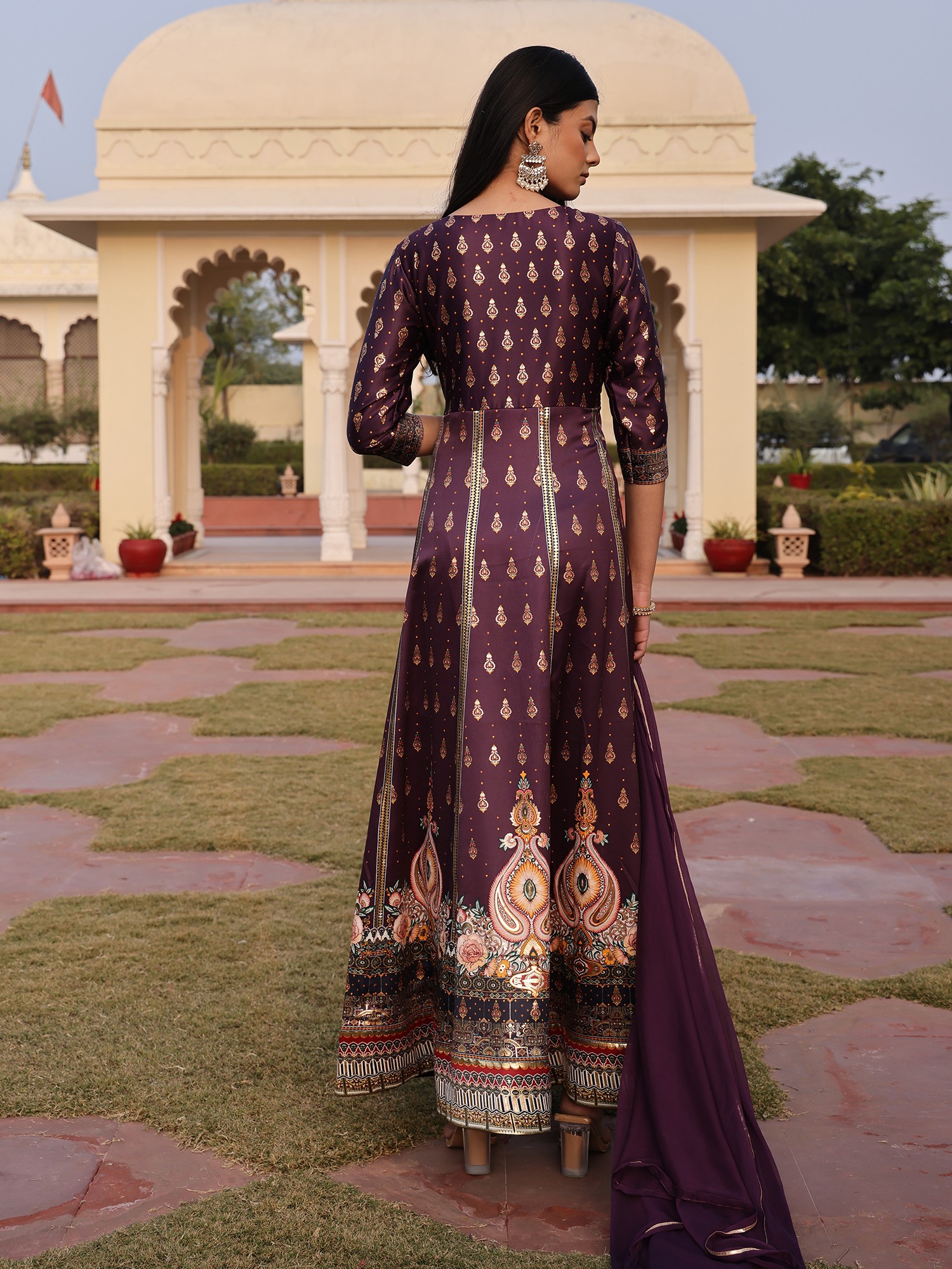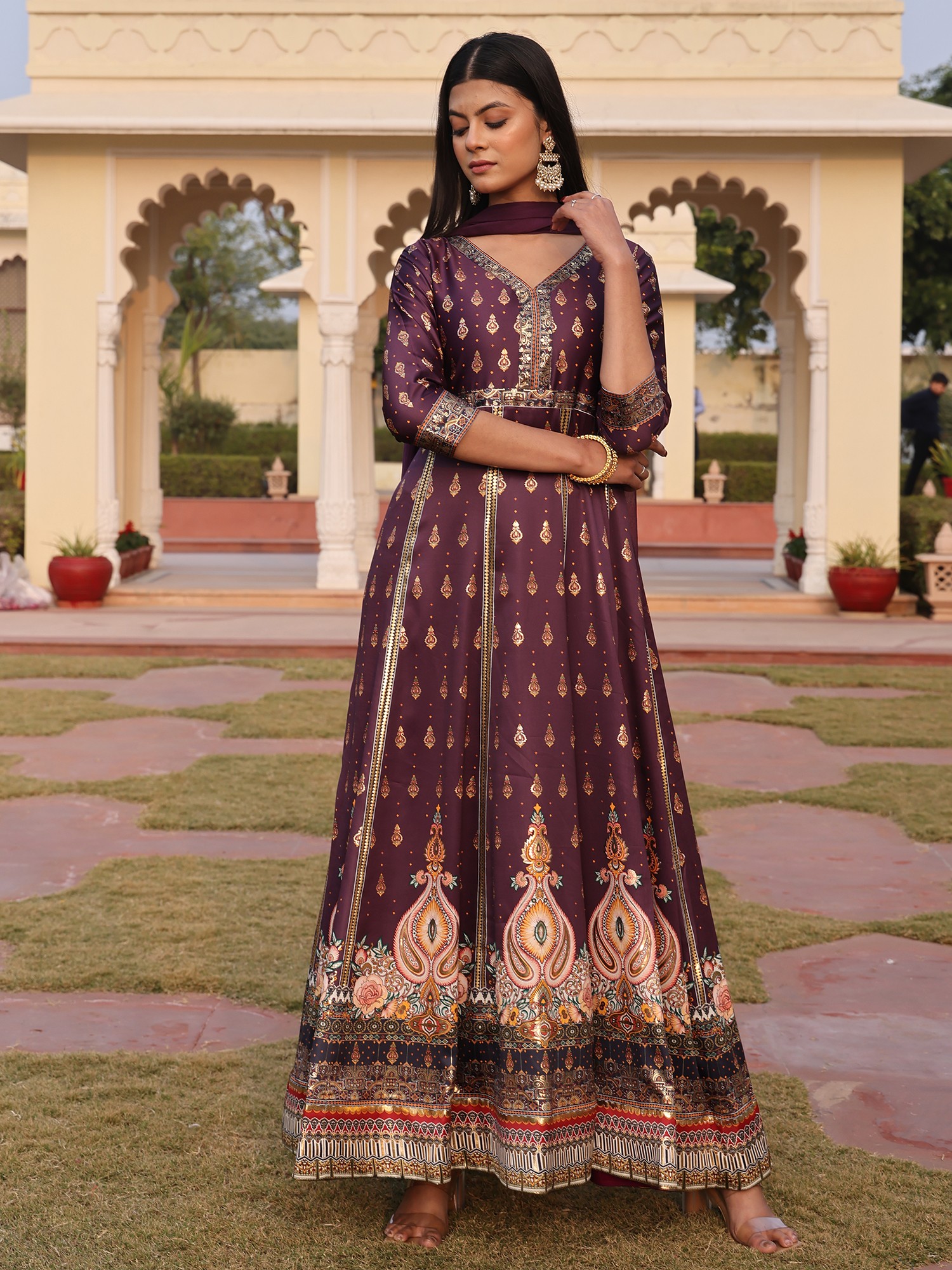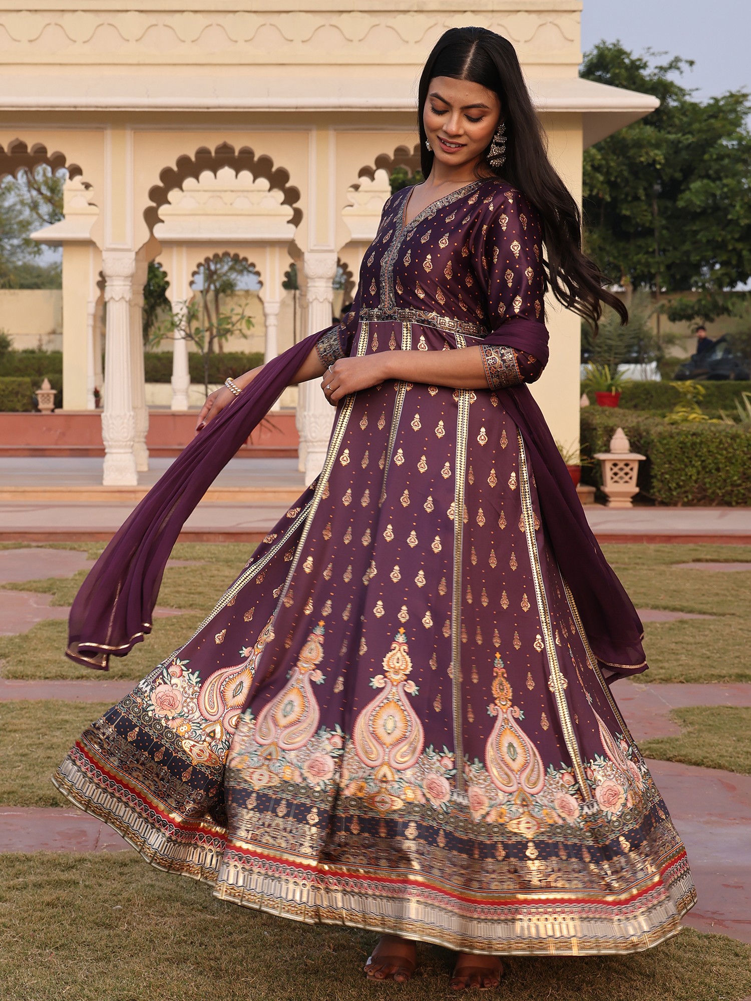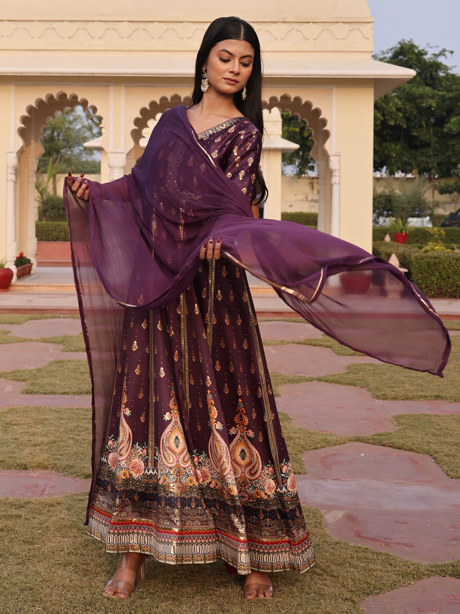 Captivating Chinon Silk Anarkali Suit With Nazneen Dupatta And Crepe Bottom Featuring Bold All Over Print For Wedding Parties