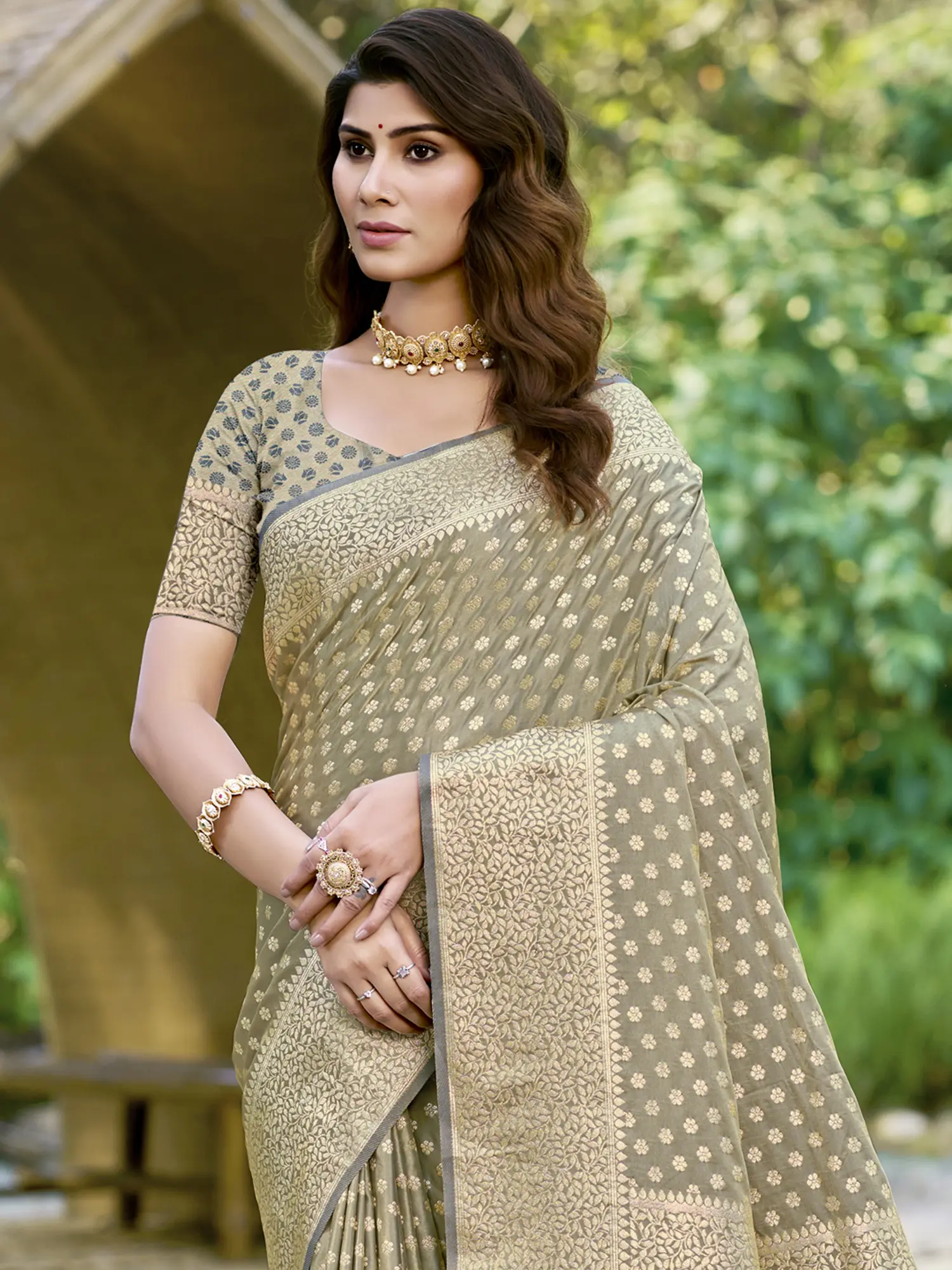 Woven Leaf Silk Saree with Contrasting Border