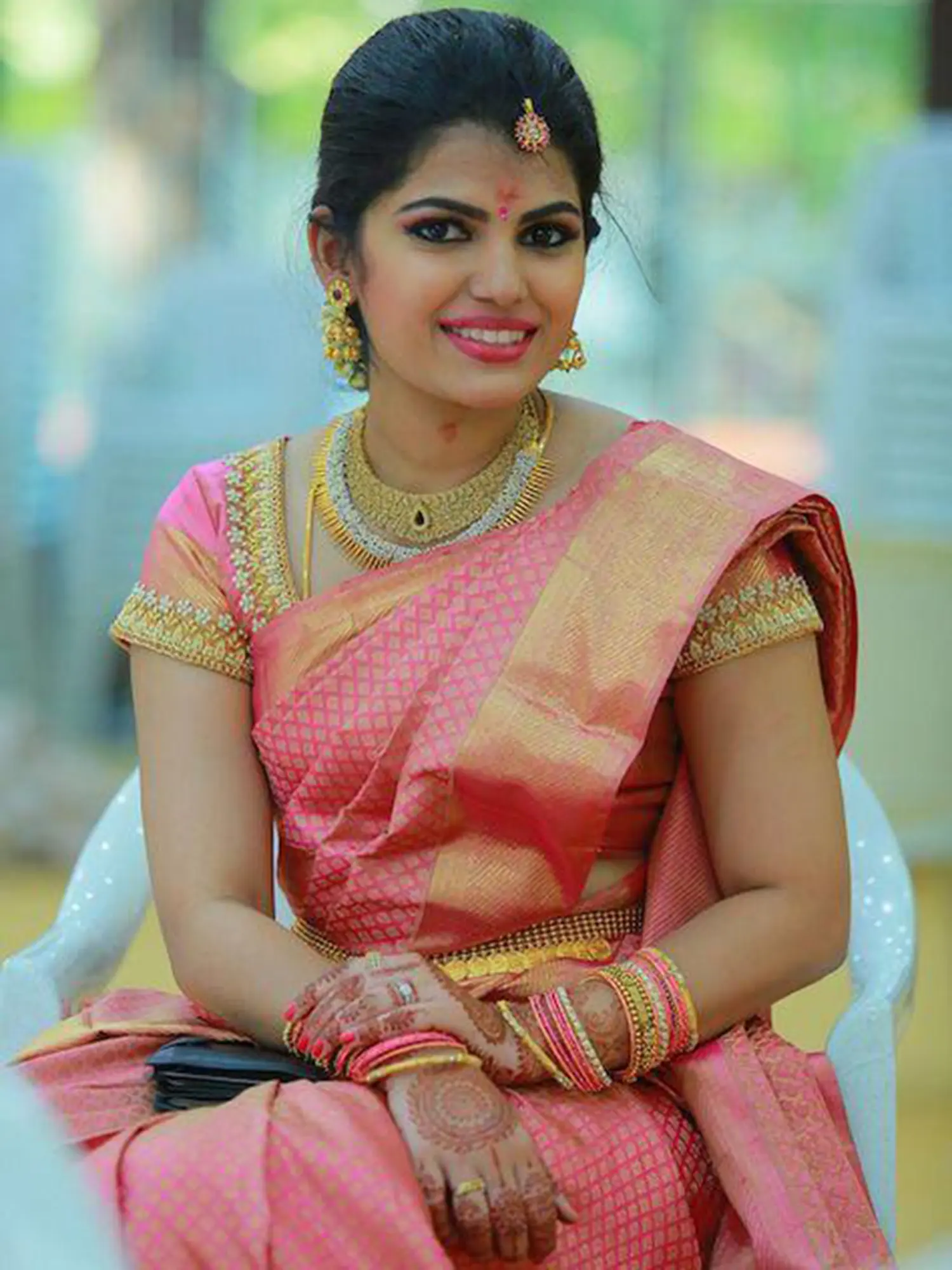 The enchanting peach pink hue evokes a sense of delicate romance and sophisticated charm, catching the light with every movement. Its substantial yet fluid texture ensures a graceful fall, defining your silhouette with understated opulence. The rich pallu, adorned with elaborate jacquard patterns, serves as a breathtaking focal point, while the complementary golden zari border adds a touch of regal splendor. You will appreciate the thoughtful design that balances bold embellishments with the inherent beauty of the silk.