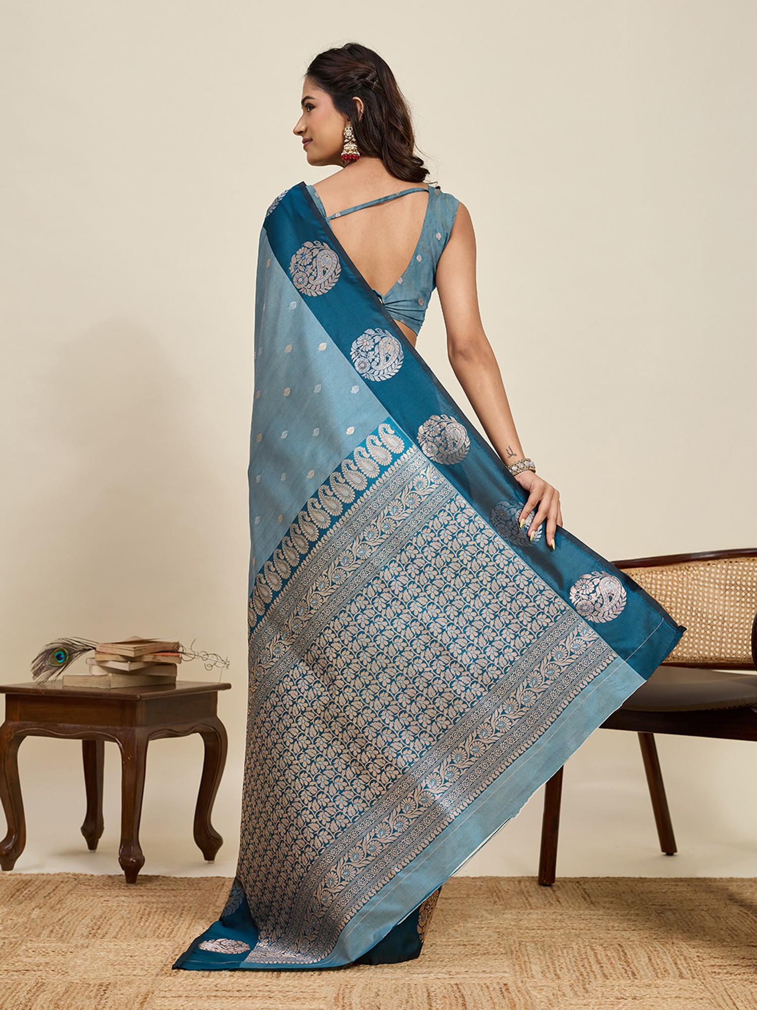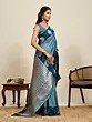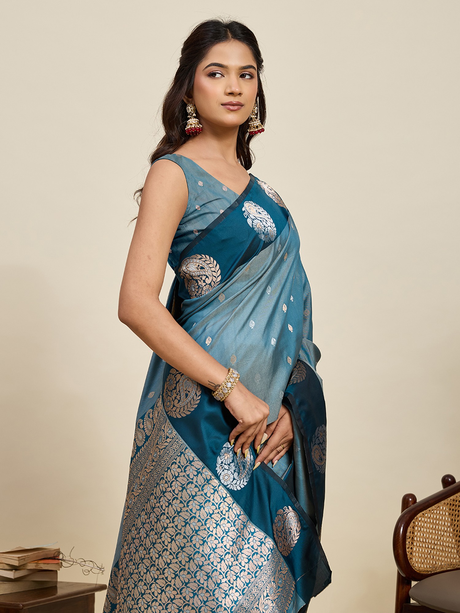 The deep, captivating teal hue provides a sophisticated canvas for the intricate woven Jari designs that adorn its borders and motifs. You'll discover traditional paisley patterns and opulent circular motifs, each rendered with astonishing precision and a subtle sheen that catches the light. The contrasting border introduces a striking visual depth, enhancing the overall opulent aesthetic.