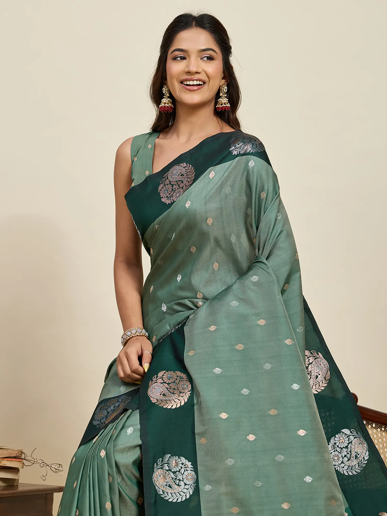 Moss Satin Patta Saree Featuring Woven Patta Designer Printed Floral Motifs Ideal For Partywear Wedding And Festive Celebrations