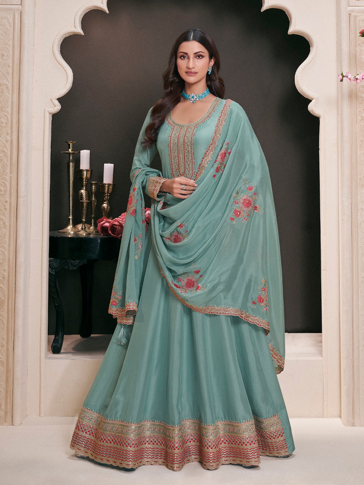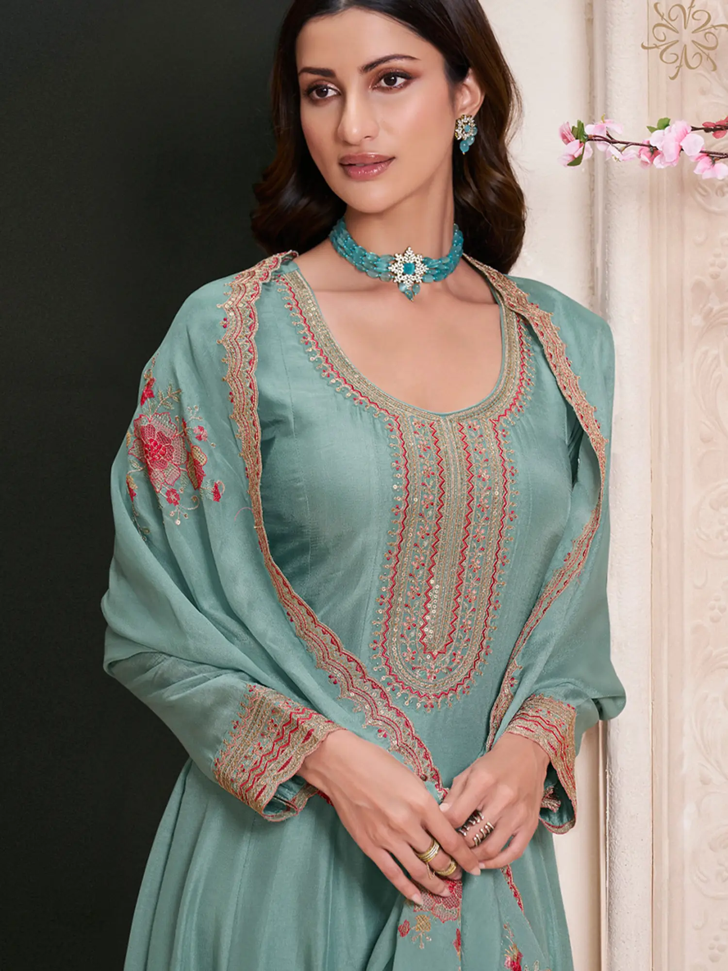 Atlantis-Green Anarkali Suit with Golden-Embroidery and Crystals