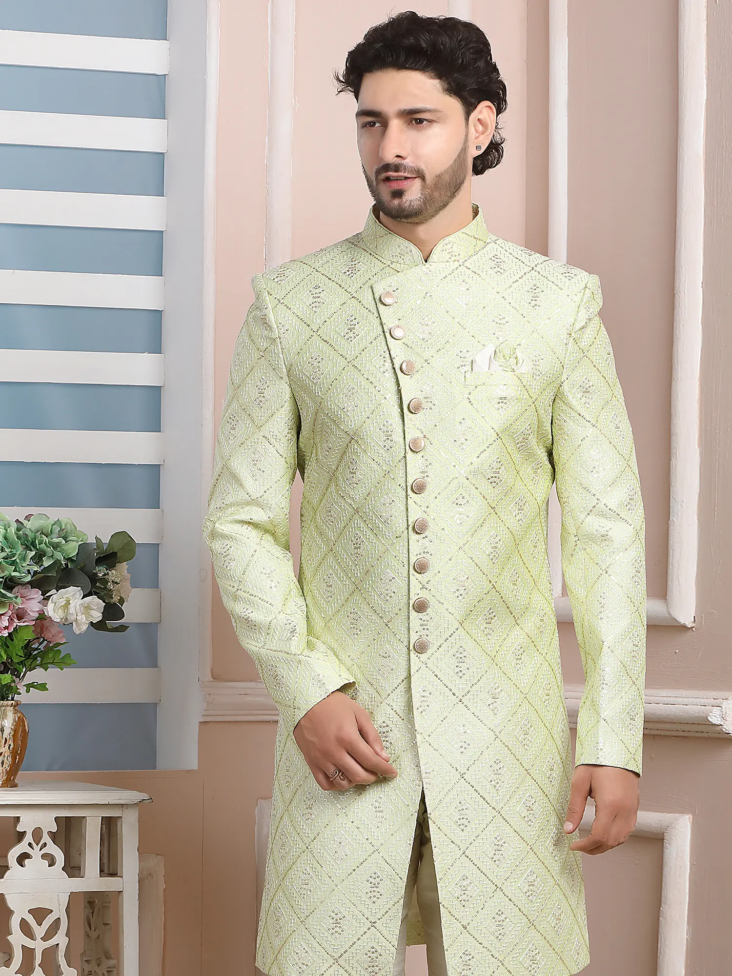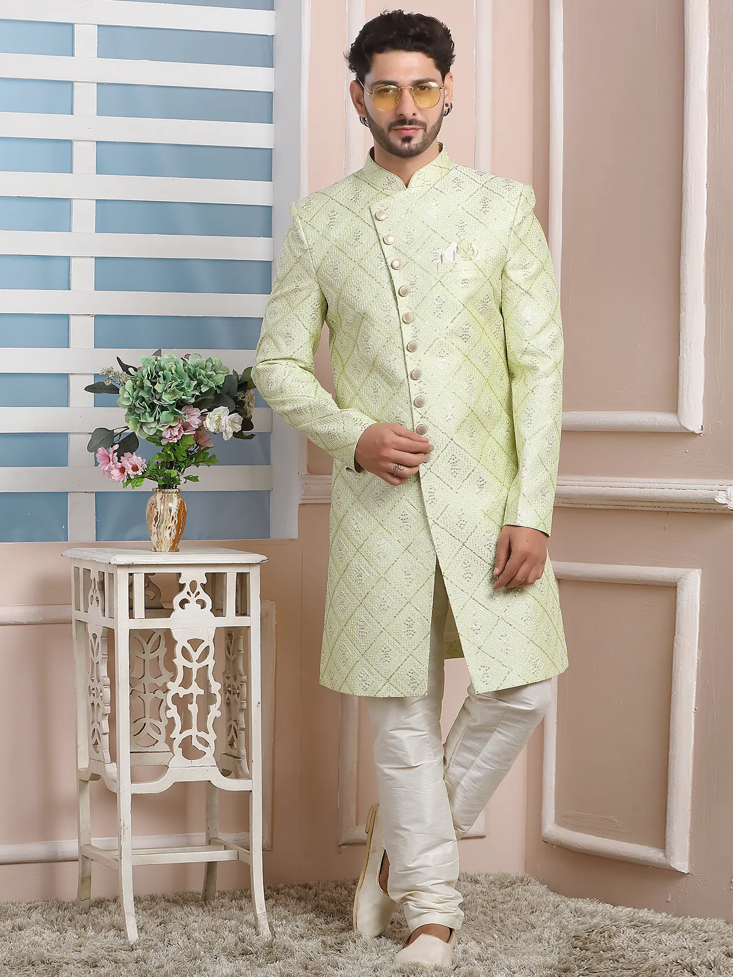 Elegant Jacquard Silk Indo Western Sherwani With Luxe Dupion Art Silk Aligarhi Pant For Wedding Sangeet Glam