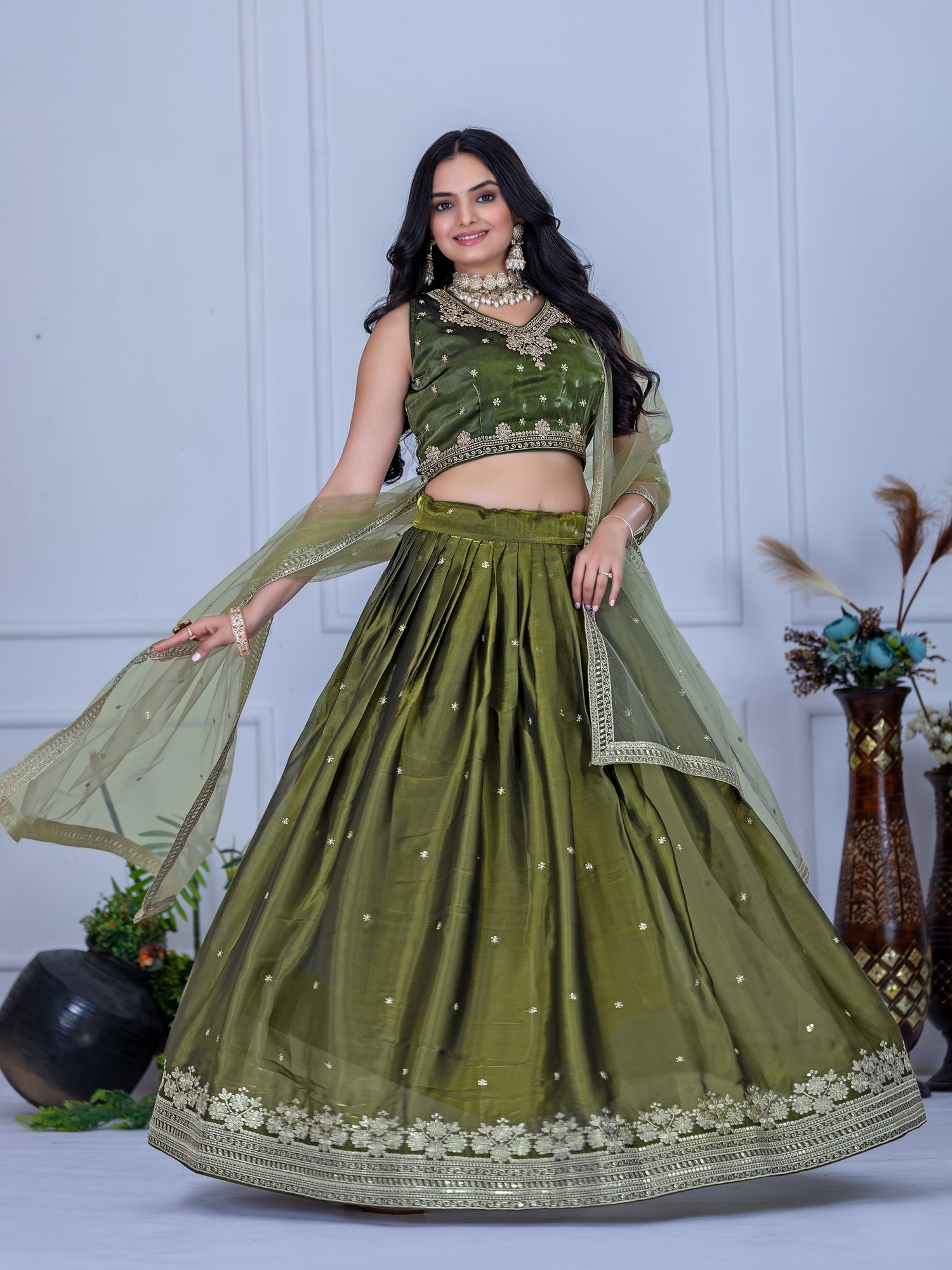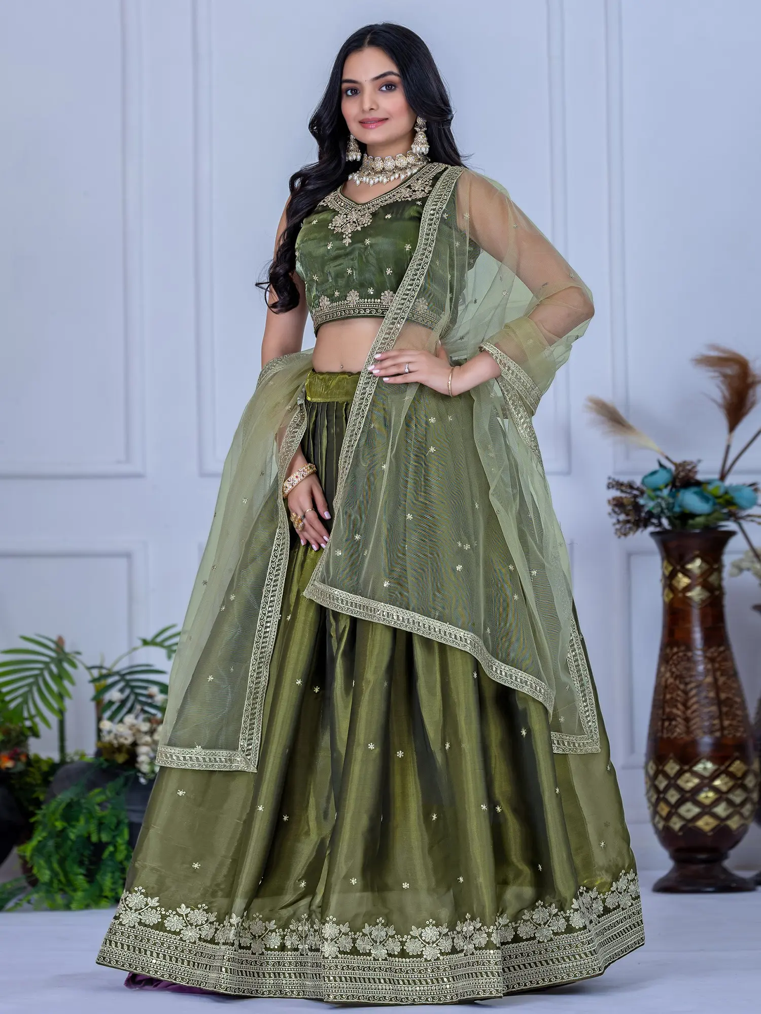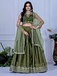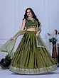 Bottle-Green Net Beads and Golden Thread Embroidery Lehenga Choli with Cutwork Dupatta