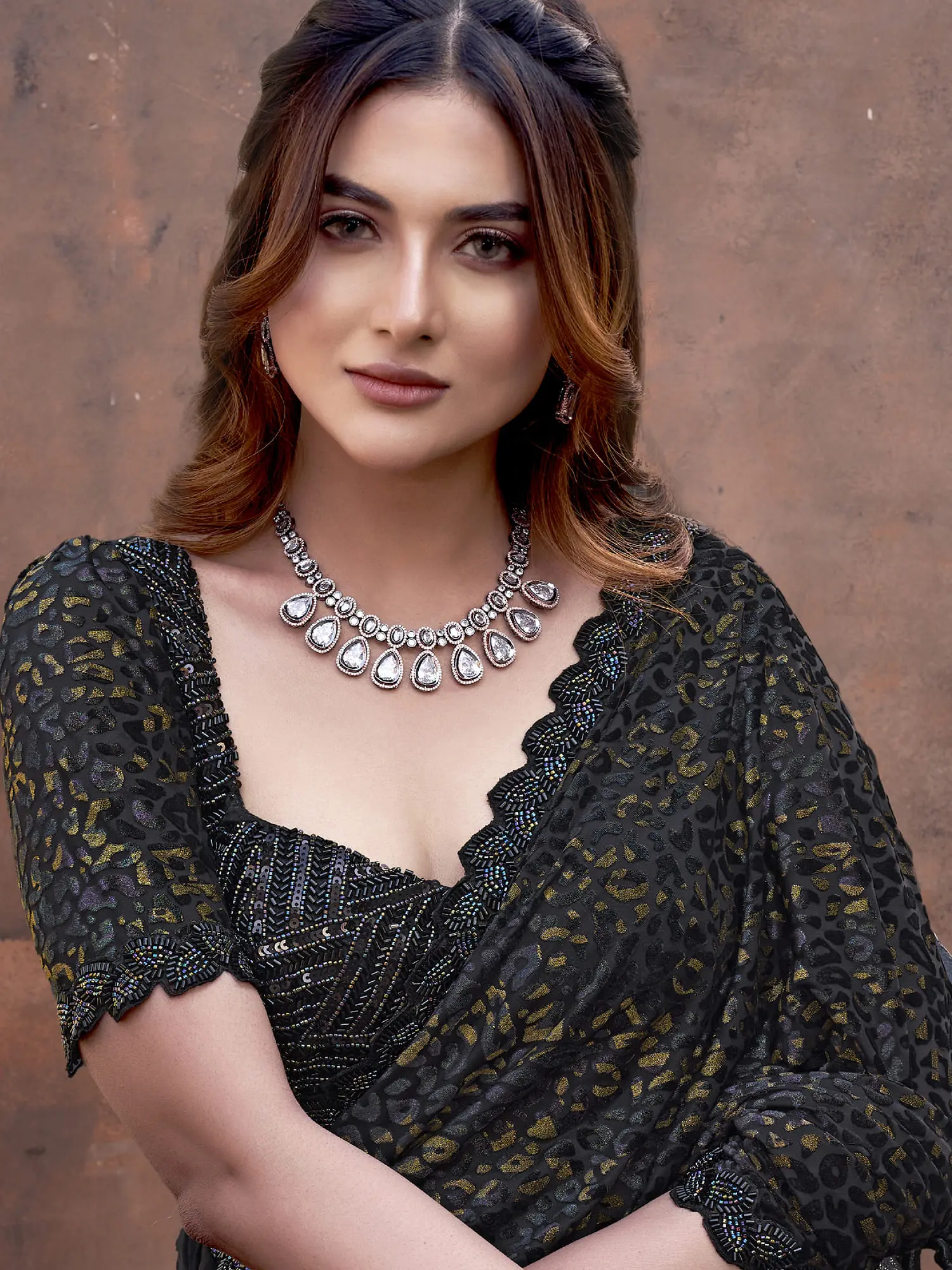 Malai Crepe Silk Saree Designer Printed Black Abstract Motifs Vibrant Contrast For Party Festive Reception Wear
