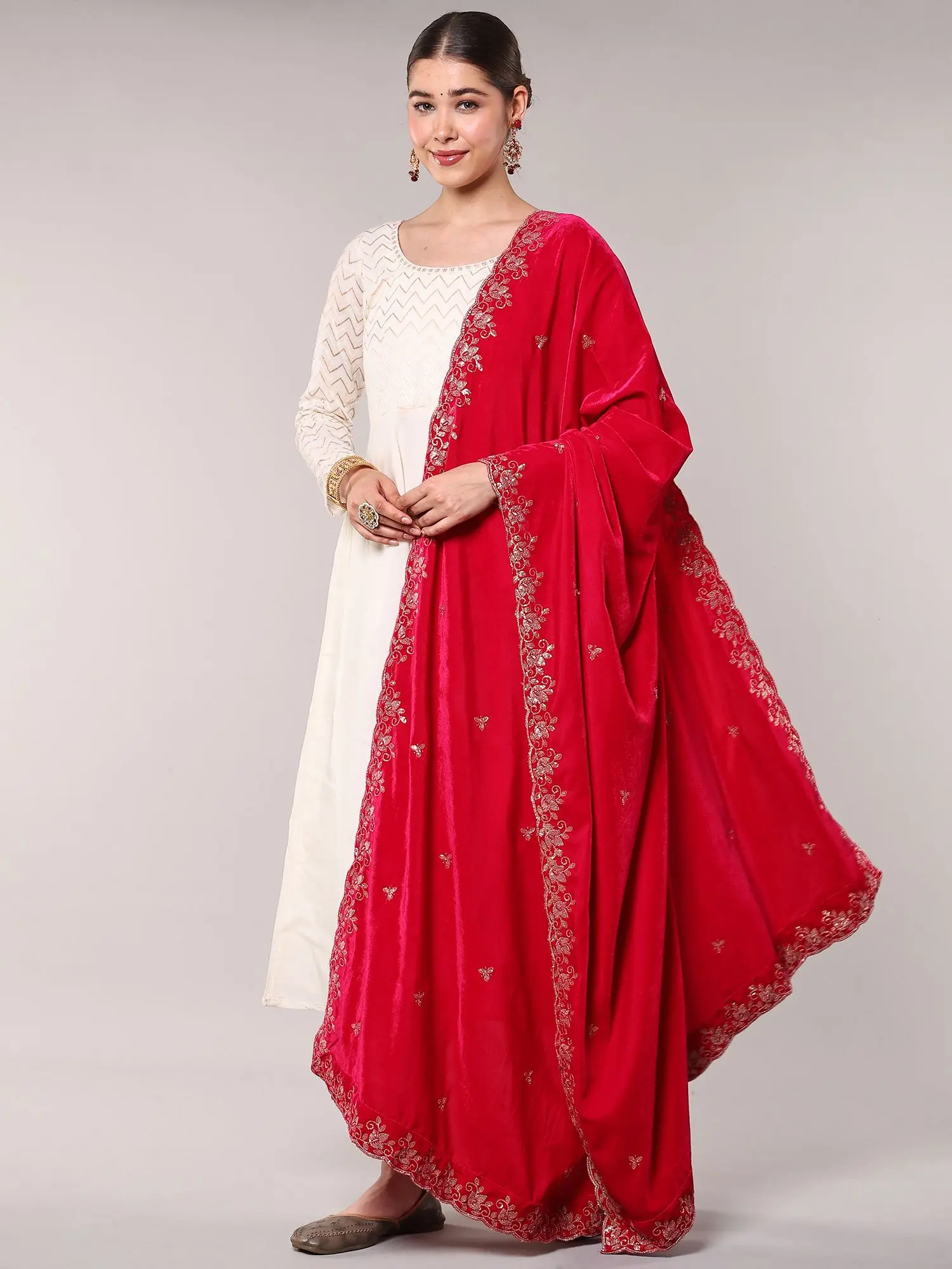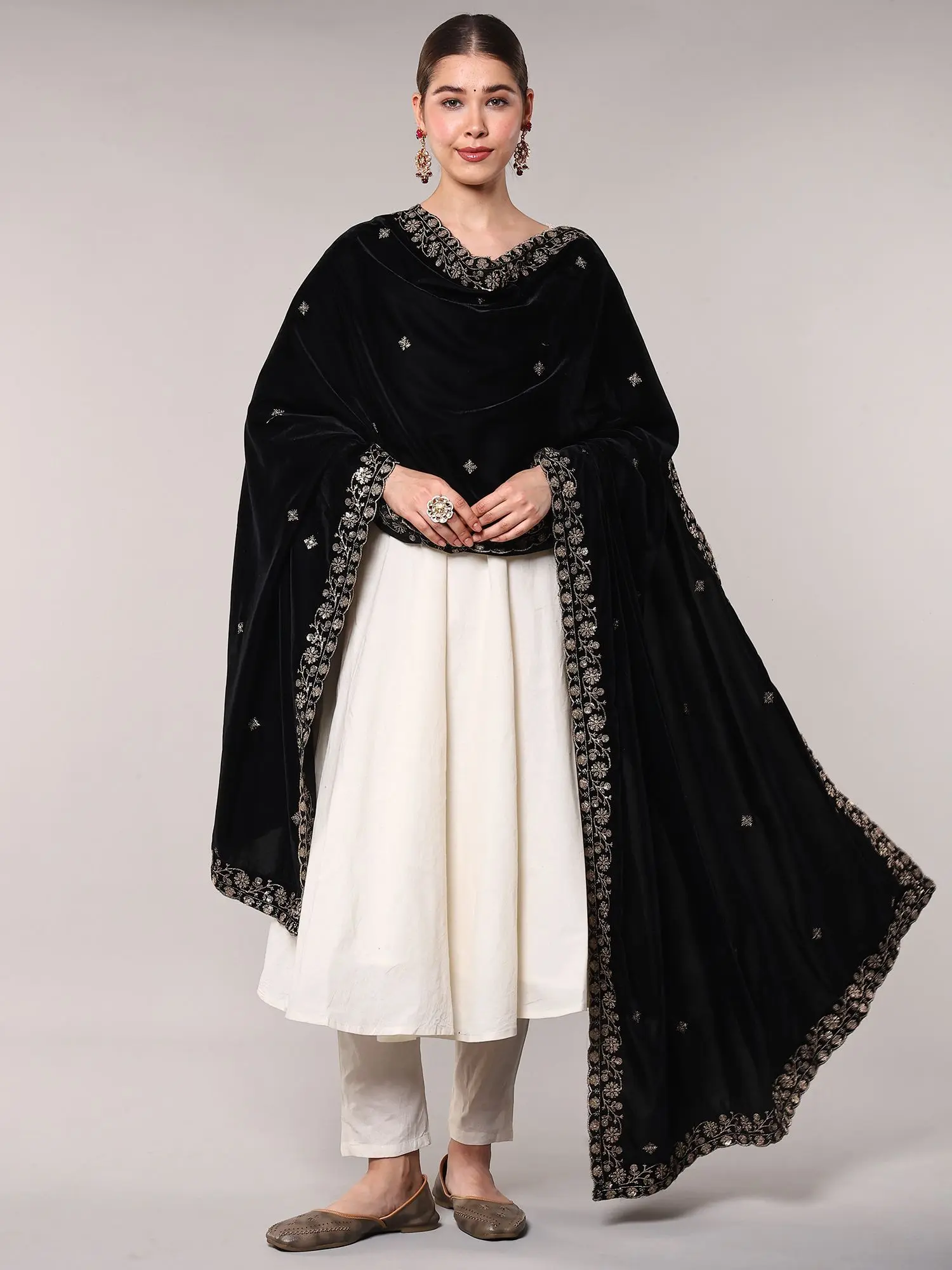 Embroidered Velvet Dupatta with Golden Bootis and Scalloped Edge