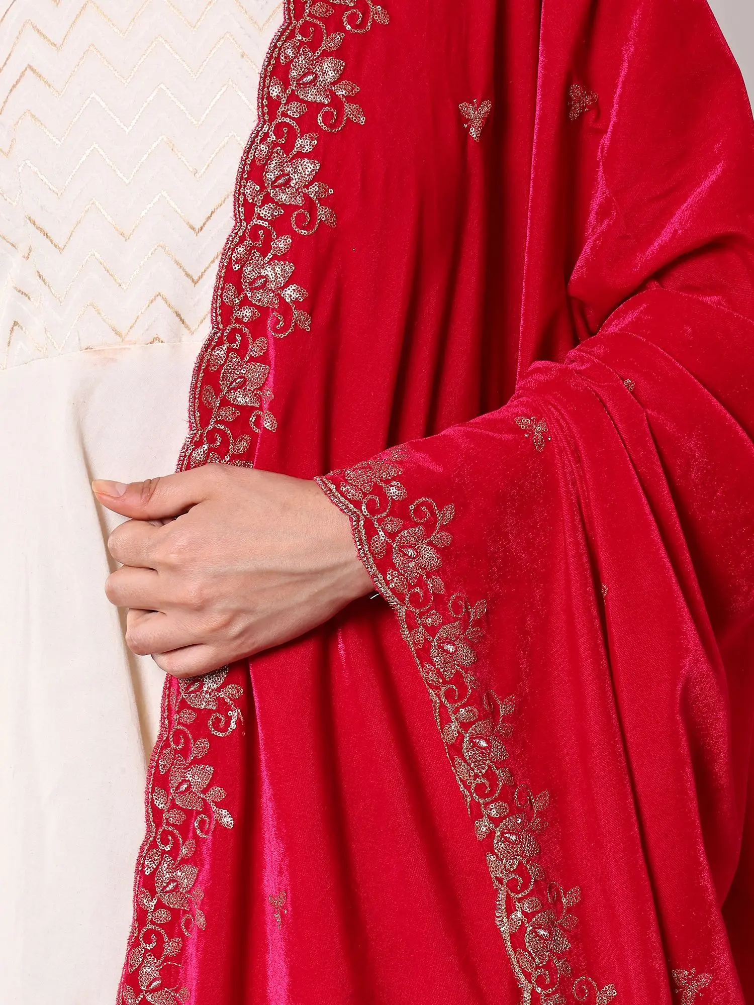 Velvet Dupatta with Zari-Sequins Embroidered Floral Vines and Scalloped Border from Amritsar