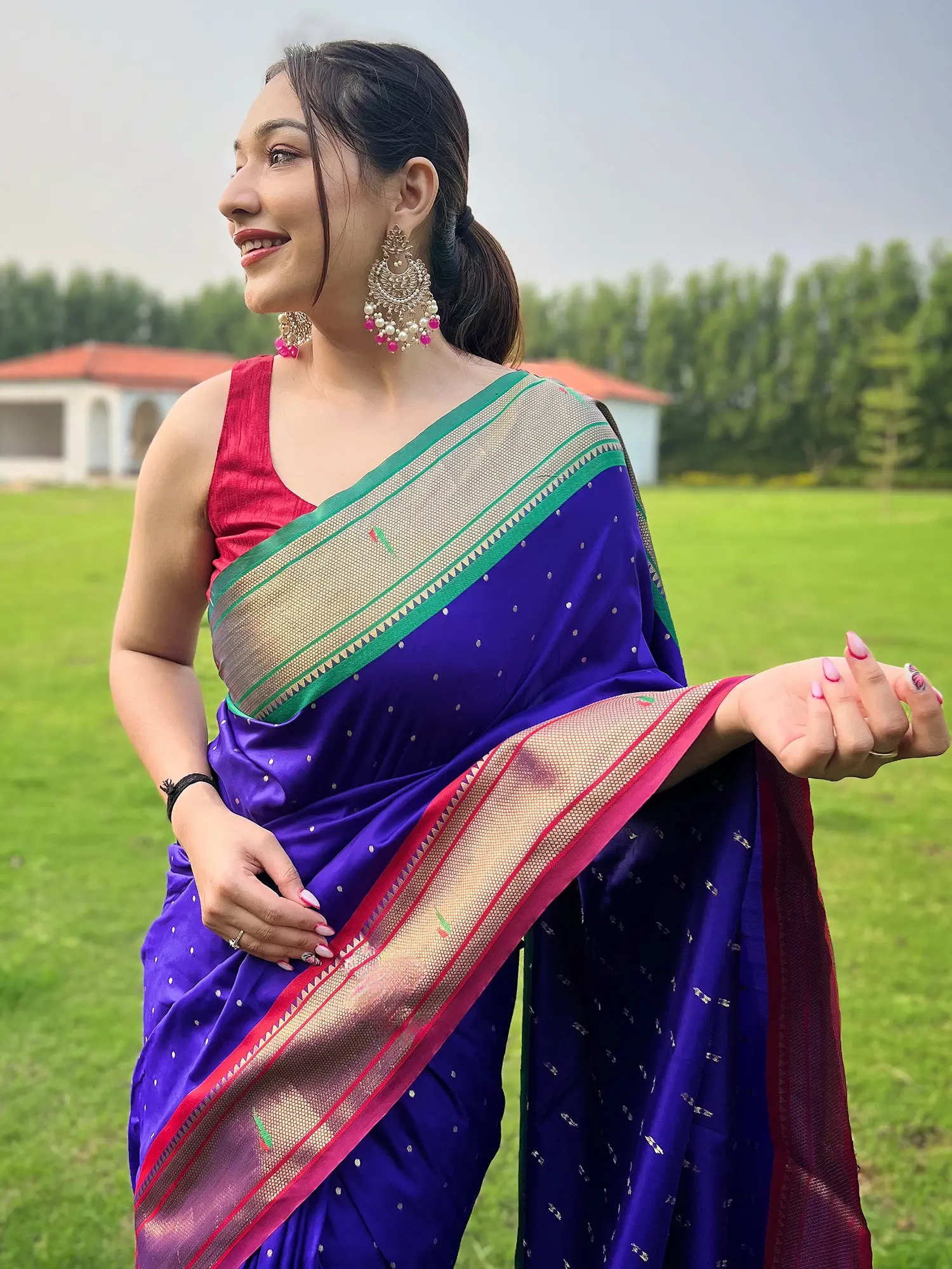 Immerse yourself in the captivating allure of this Royal Blue Silk Saree, a testament to timeless elegance and intricate artistry. Crafted from the finest silk, this saree drapes beautifully, offering a luxurious feel against your skin. The deep, regal blue is adorned with delicate, scattered white motifs, creating a subtle yet eye-catching pattern that hints at hidden treasures. This design evokes a sense of refined sophistication, perfect for those who appreciate understated beauty.