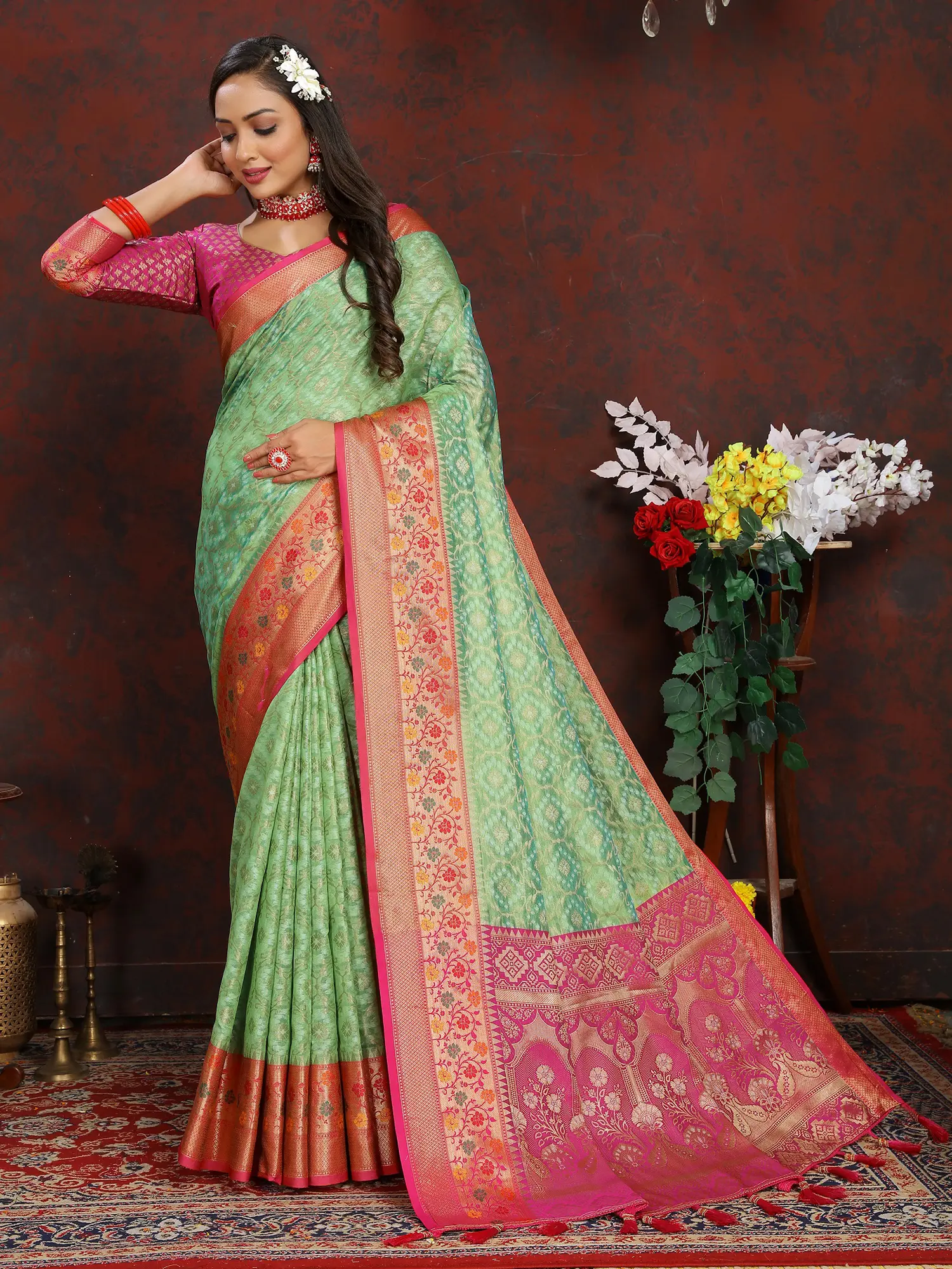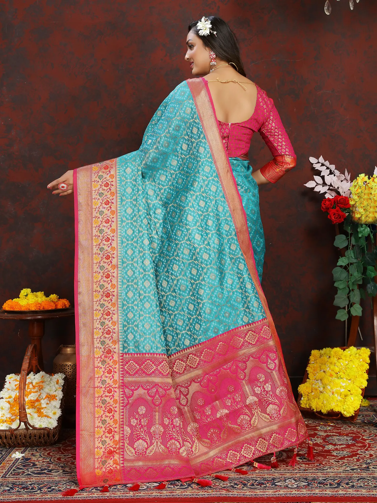 The defining feature of this saree is its resplendent wide border, meticulously woven with intricate motifs. The contrast border, a vibrant shade of pink, is a testament to the masterful craftsmanship of Banarasi weavers. Each thread is woven with precision, creating a tapestry of floral patterns and geometric designs that exude an aura of opulence. The pallu, the decorative end of the saree, is equally stunning, featuring a richer, more elaborate weaving pattern that cascades beautifully. Adding a playful and traditional touch, the pallu is finished with elegantly tied tassels, enhancing its overall charm and grace.