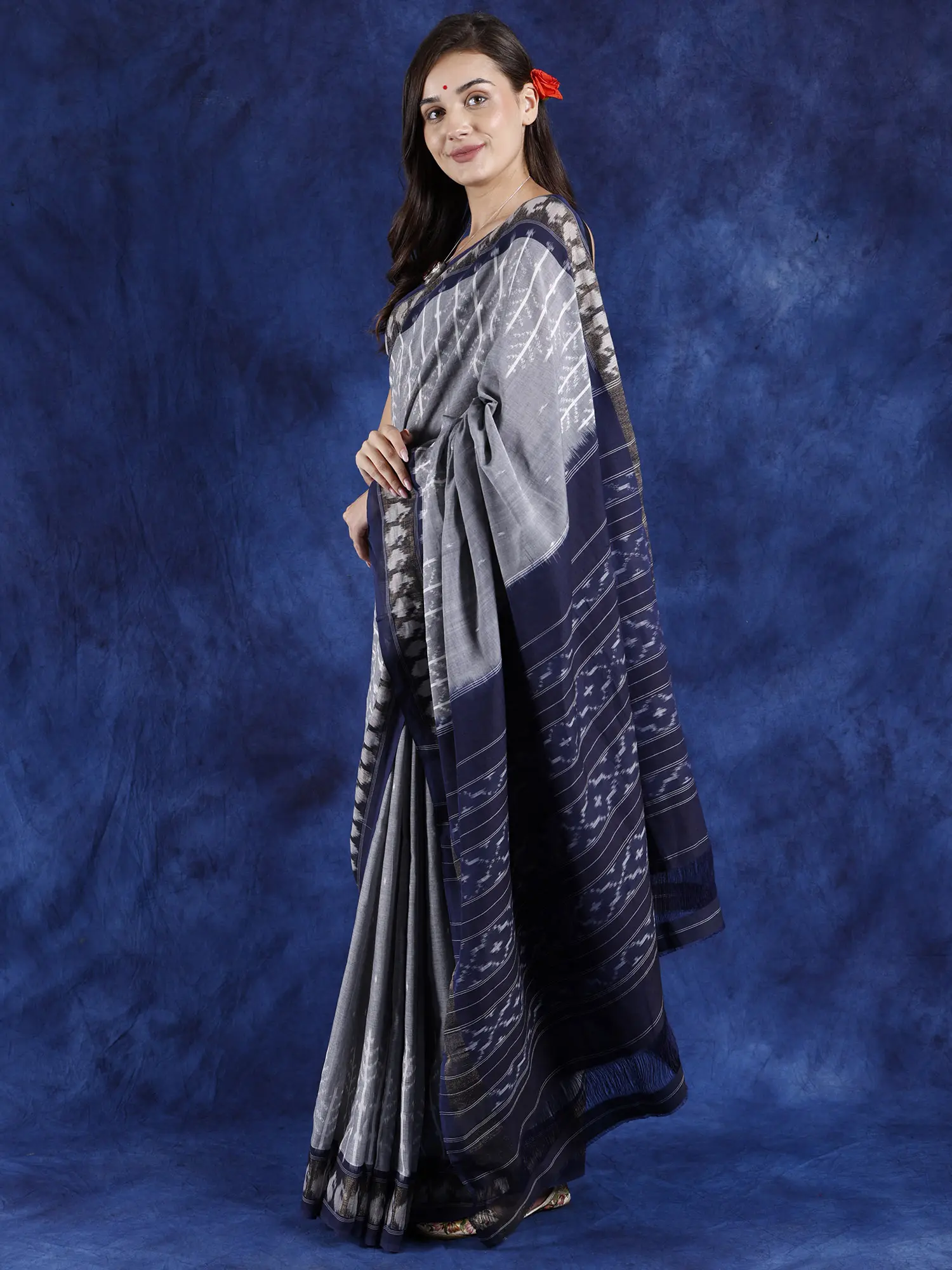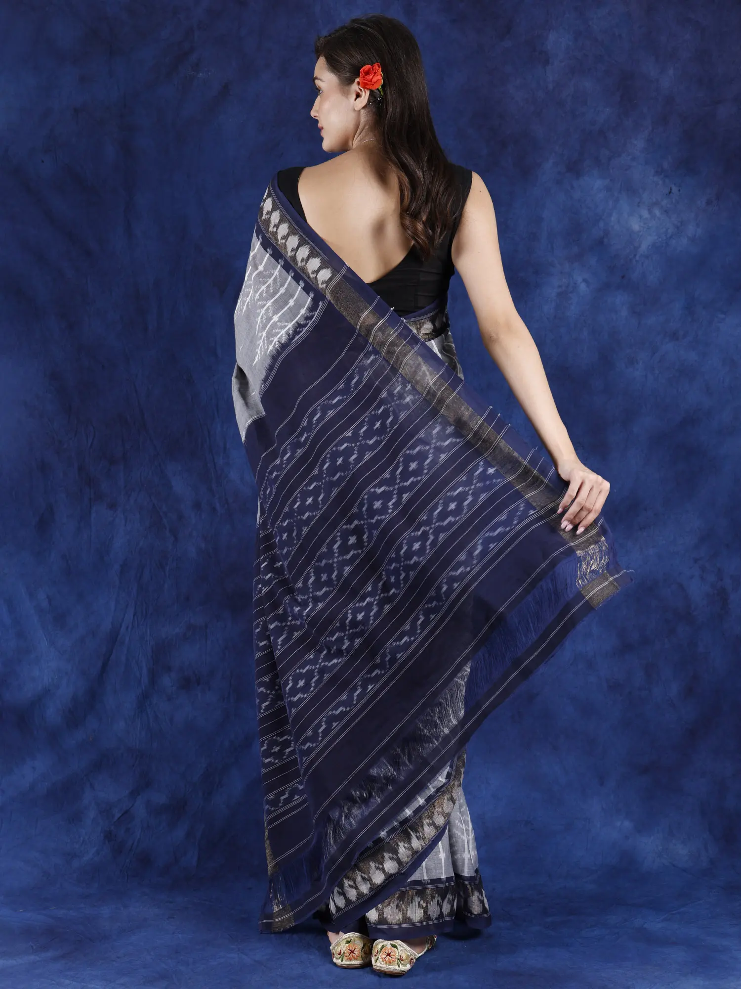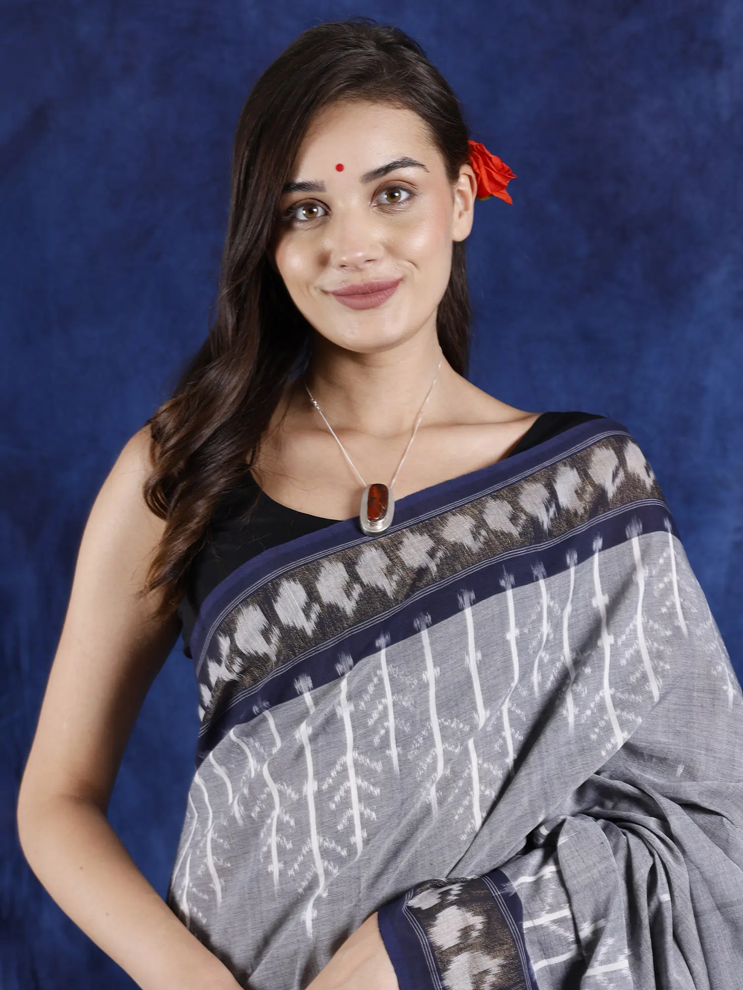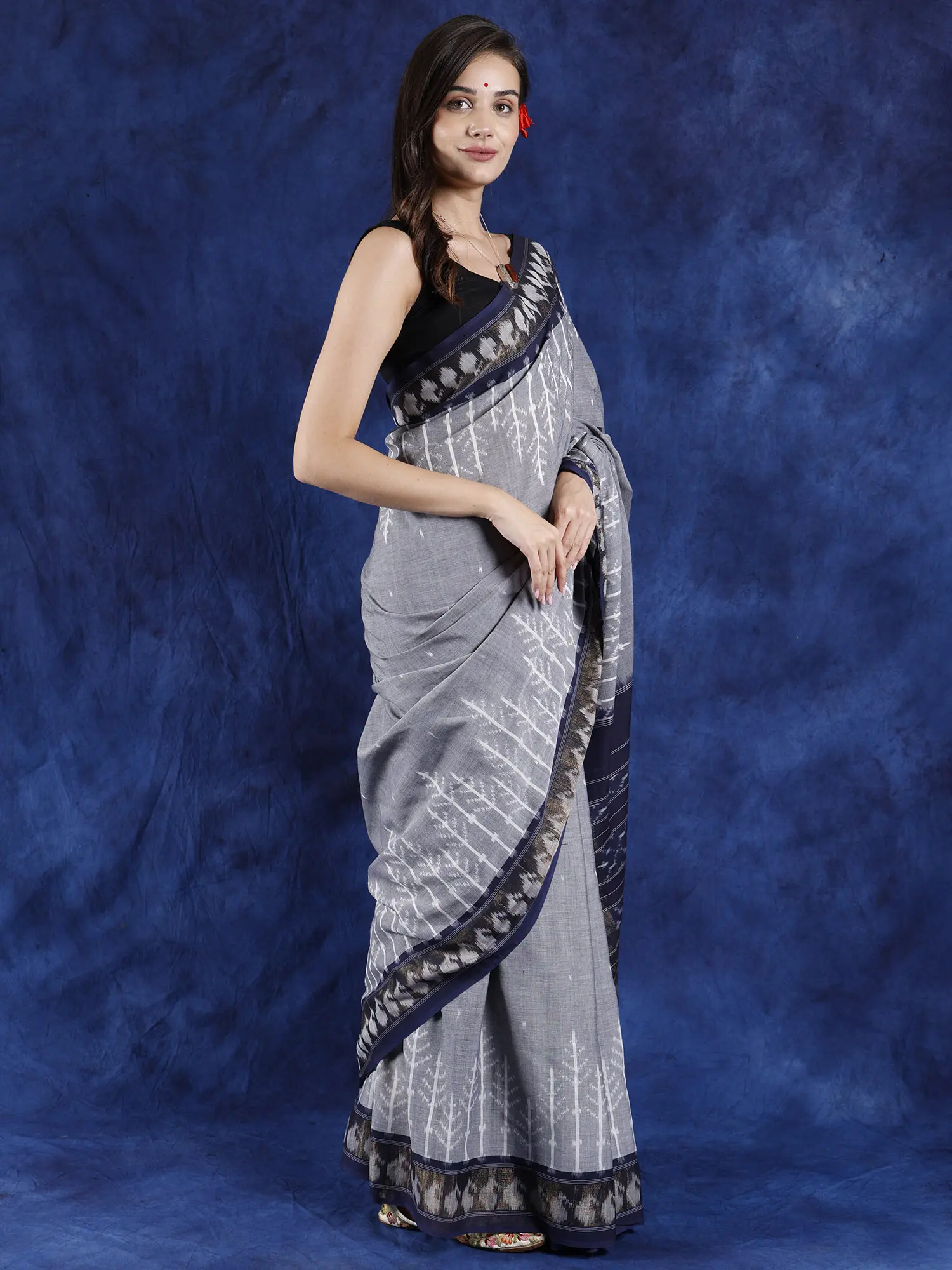 Elegant Wild Dove Pure Cotton Ikat Saree with Woven Pine Trees and Tissue Border