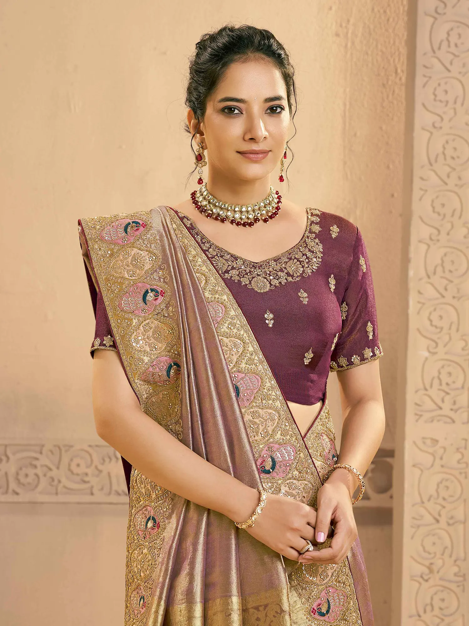 Party Wear Vichitra Silk Saree With Gold Zari Work On Border And Motifs All-Over