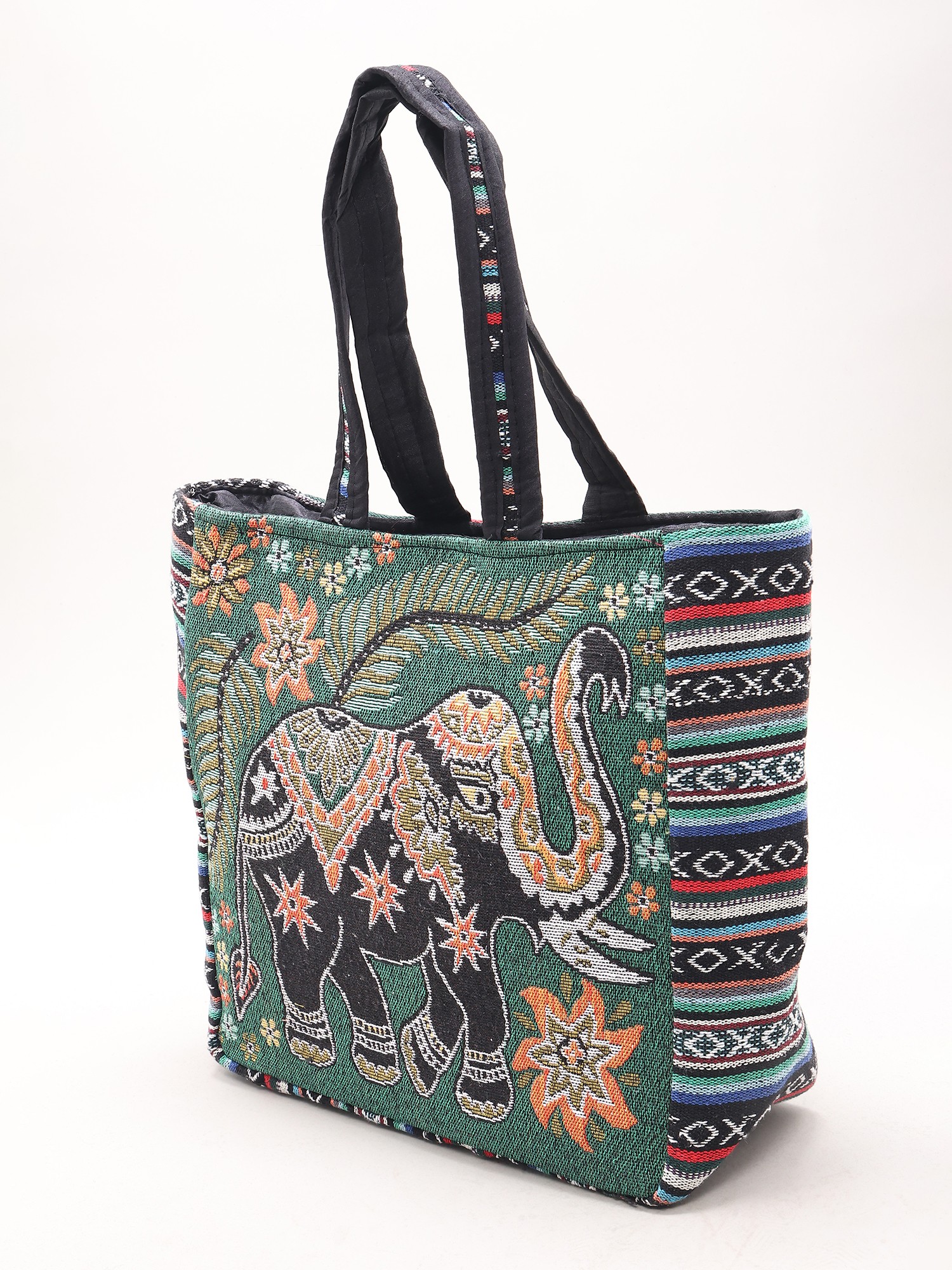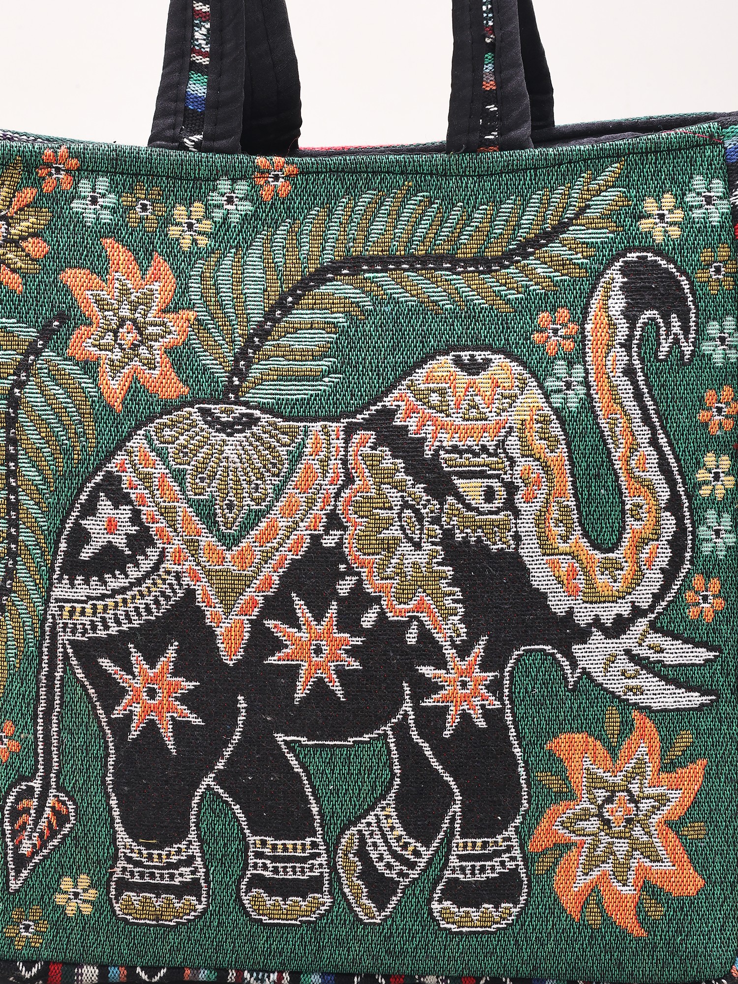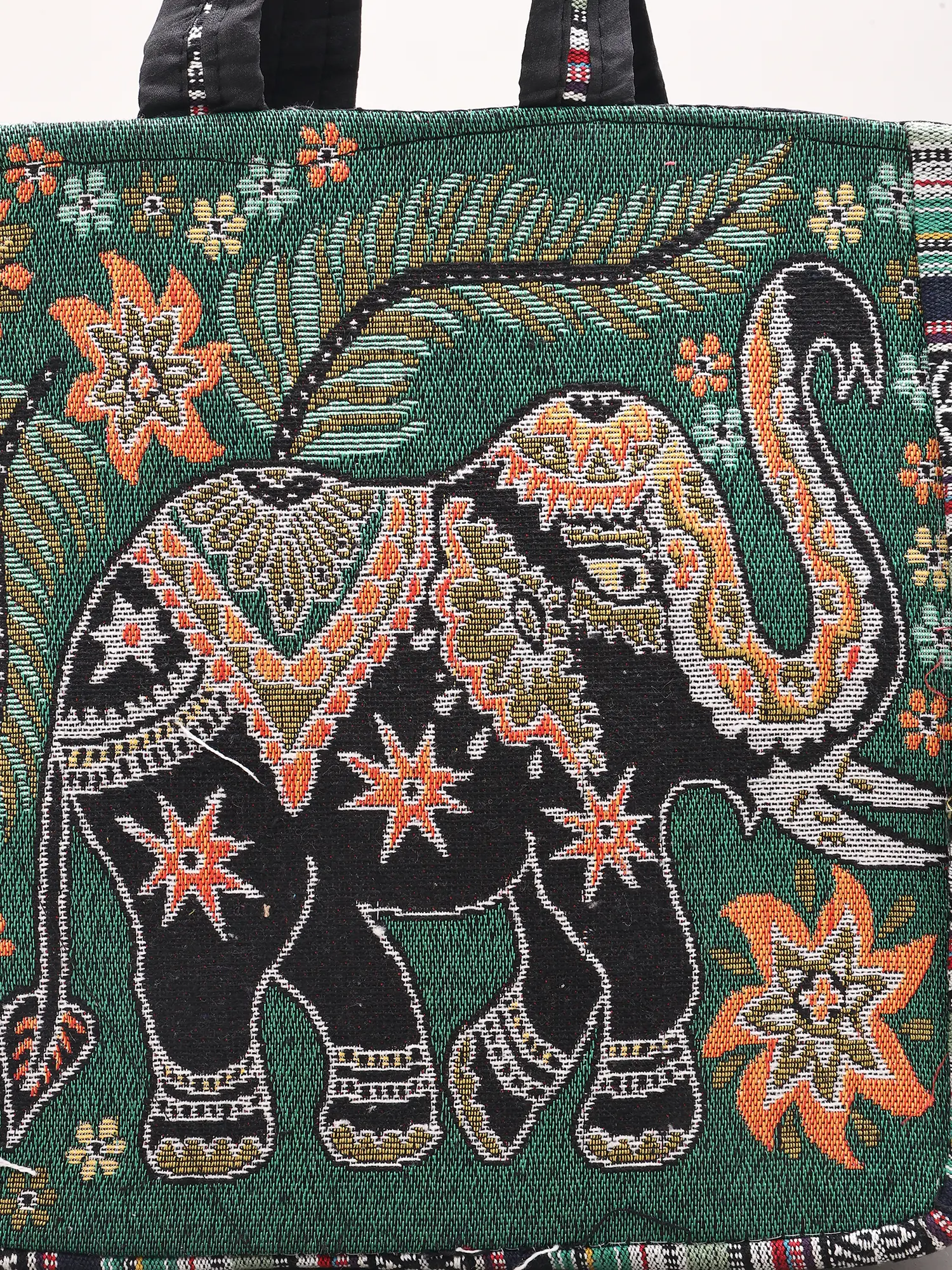 Carry your essentials in style with this unique and vibrant tote bag, handcrafted in the Kutch region of India. This bag is more than just a functional accessory; it’s a piece of art that tells a story. The rich tapestry design features an intricately woven elephant, a symbol of wisdom and good fortune, surrounded by lush floral patterns and traditional motifs. The deep red base color beautifully complements the rich gold, black, and other colorful accents. This tote is perfect for everyday use, carrying your books, groceries, or anything else you need for your daily adventures. Its sturdy construction ensures it will withstand everyday use, while its beautiful design will make a statement wherever you go.