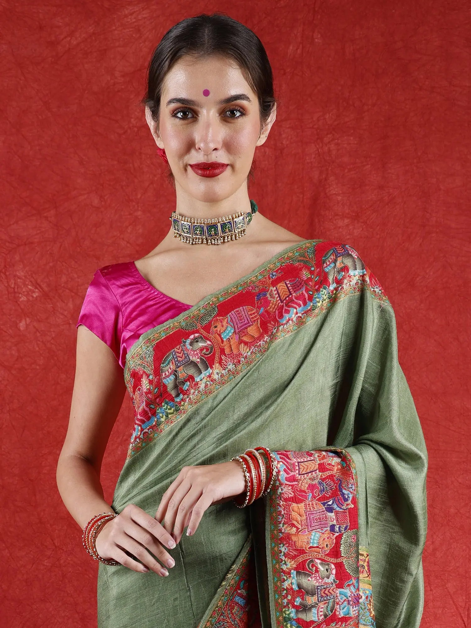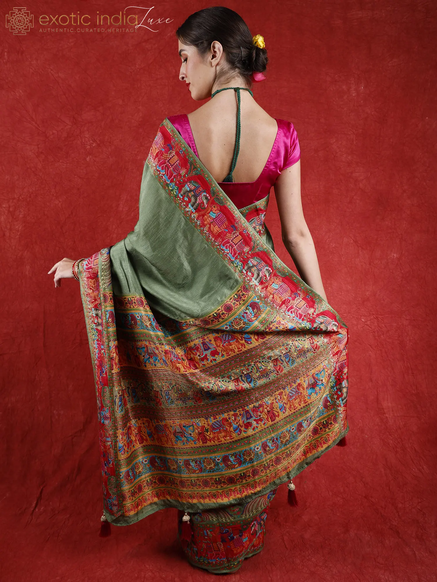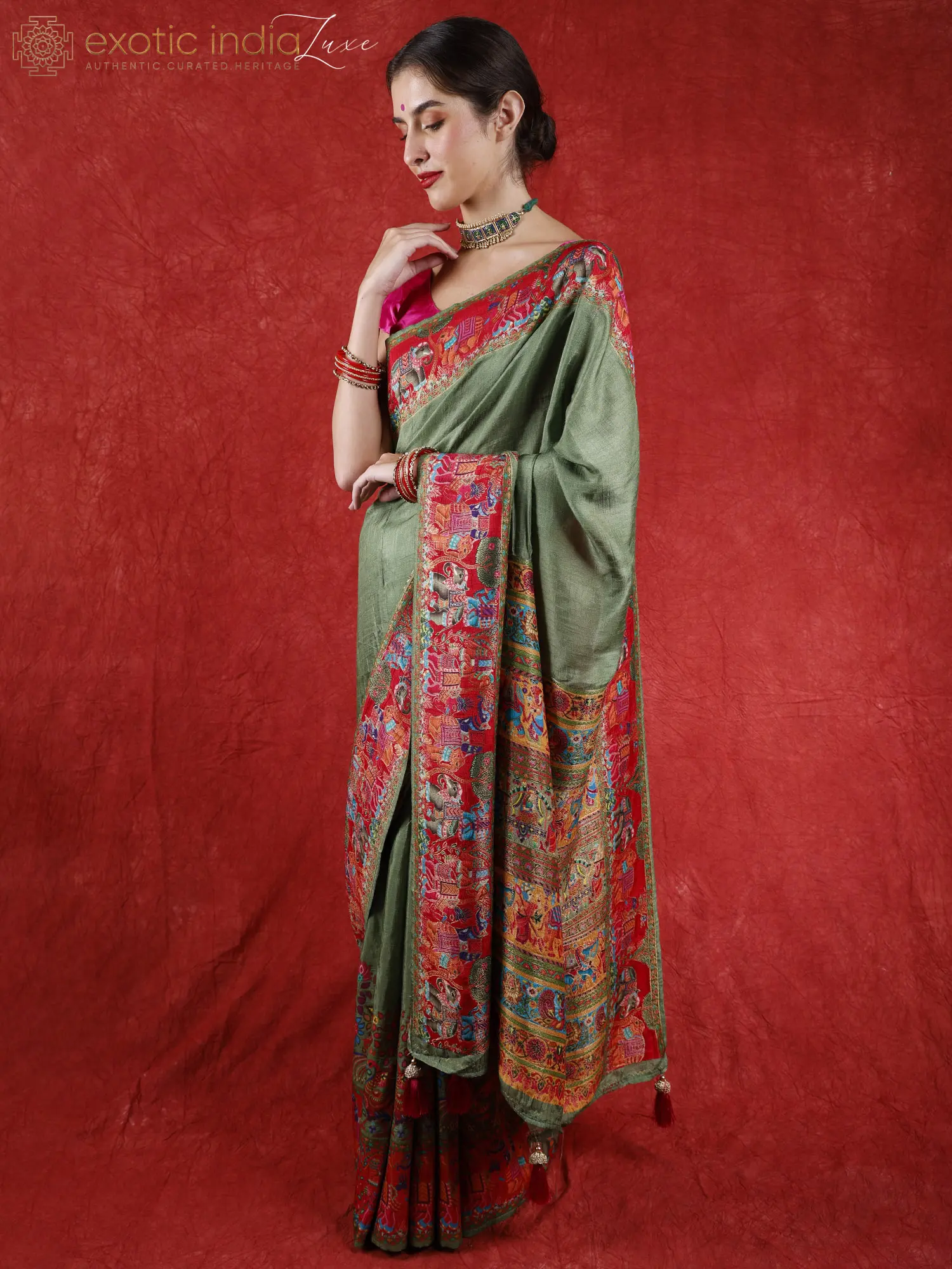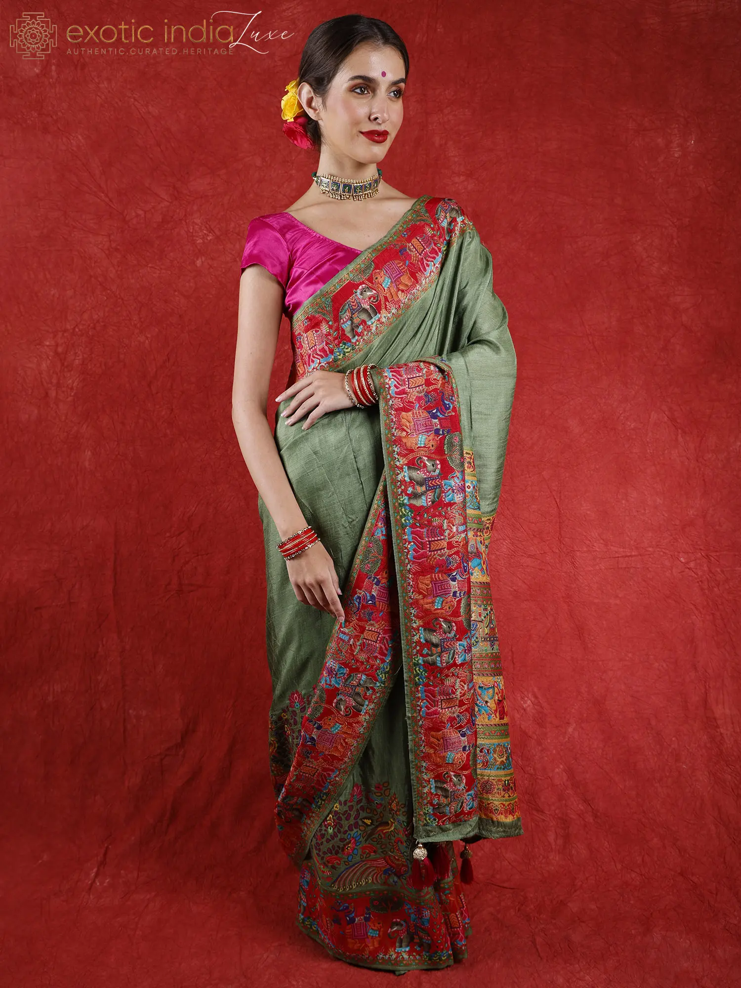 The intricate patterns of Shikargarh, once confined to paintings, have gracefully transitioned to apparel, exemplified by the Elm-Green Zari Brocaded Kani Handloom Saree from Kashmir made of Pure Crepe Silk. This saree showcases the artistry of Kashmiri weaving, with its elaborate depiction of marriage processions woven into the fabric.