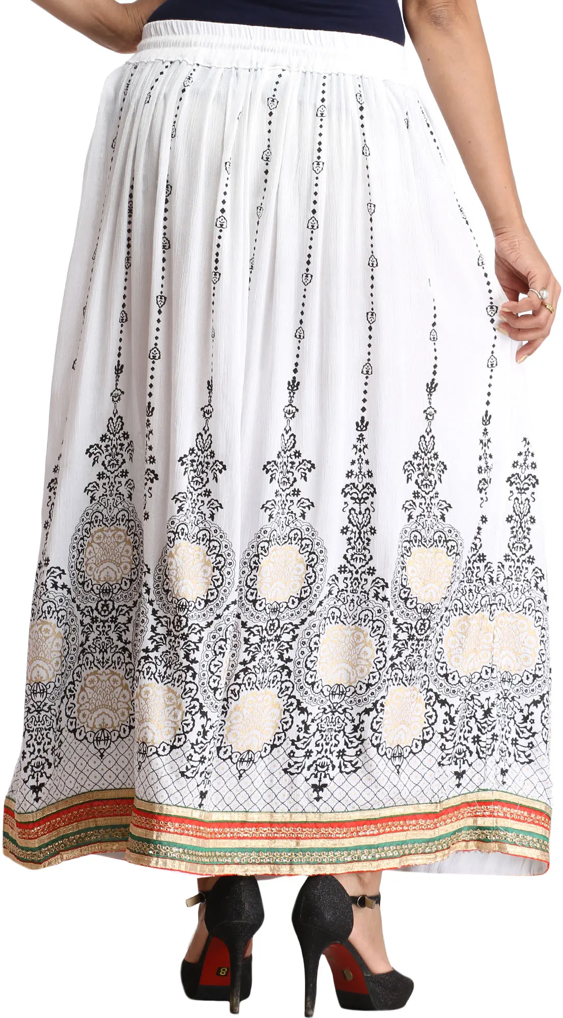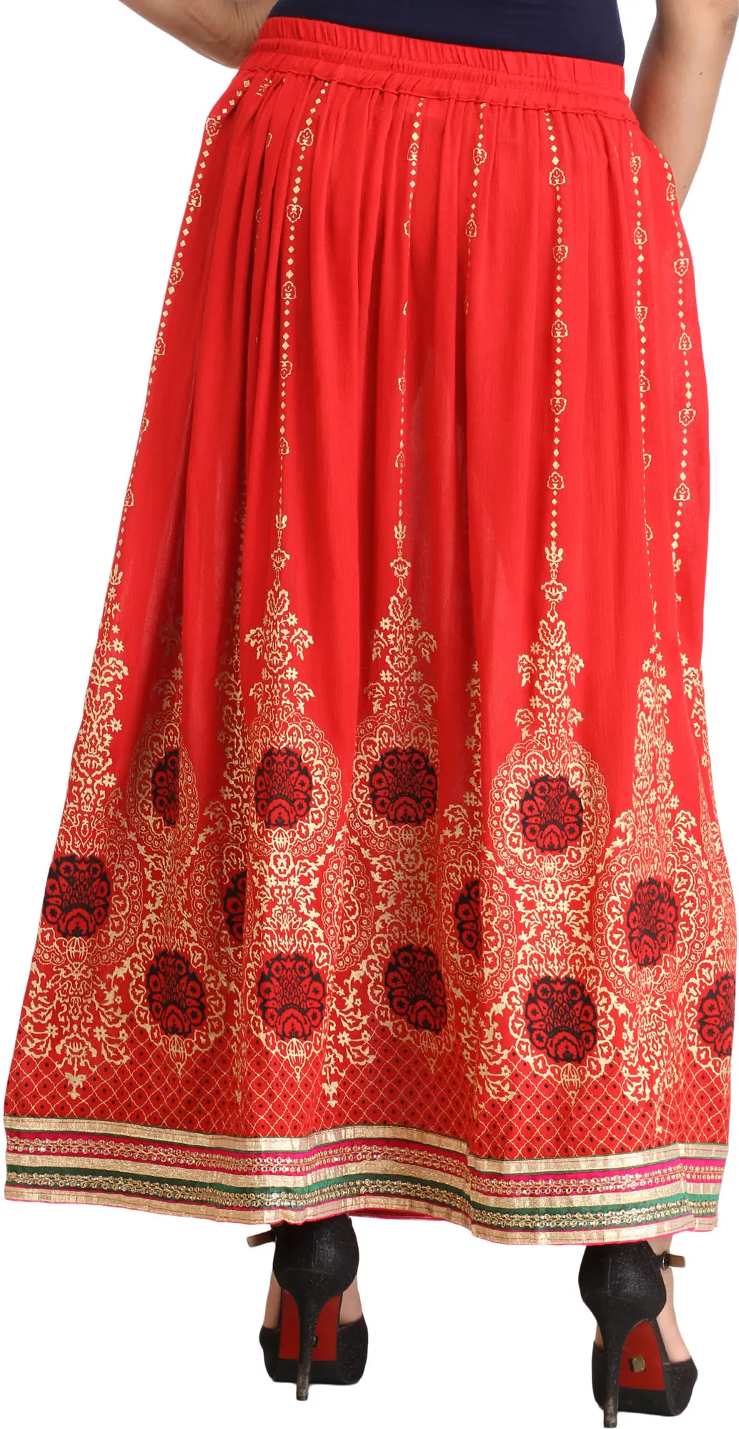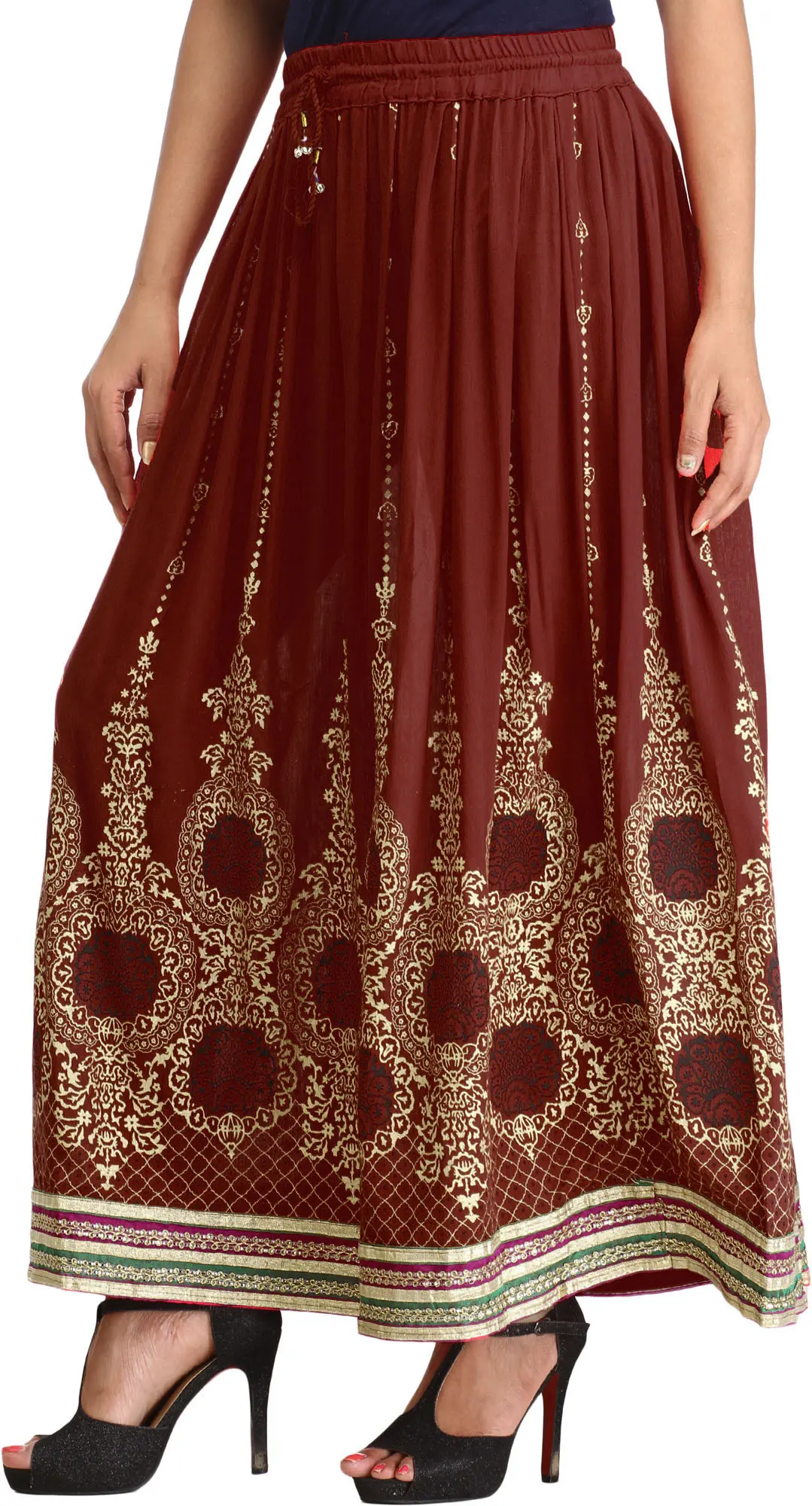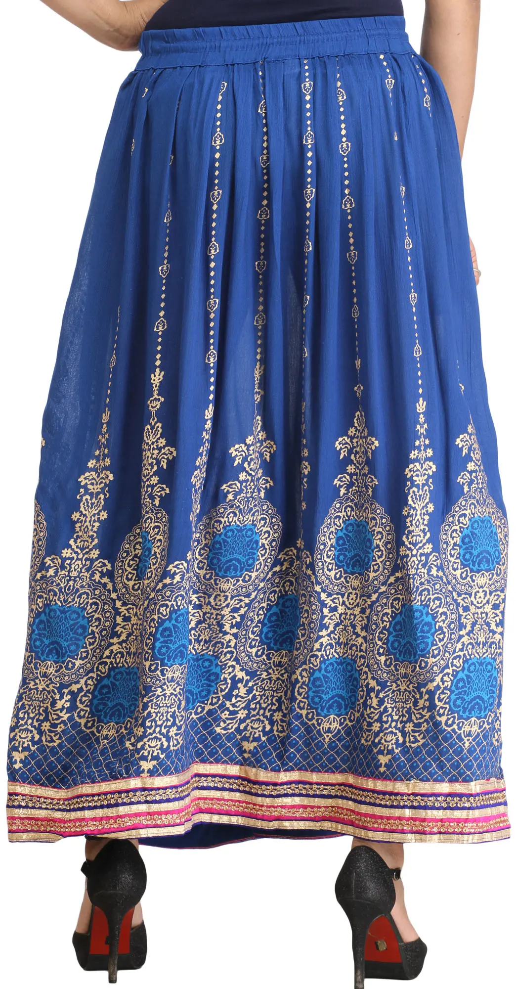This Embellished Long Skirt with Golden Print and Embroidered Patch Border offers a unique approach to style and unparalleled comfort. The golden print adds a touch of opulence and glamour to the skirt, elevating its aesthetic appeal. Additionally, the embroidered patch border adds intricate detailing and texture, enhancing its visual interest.