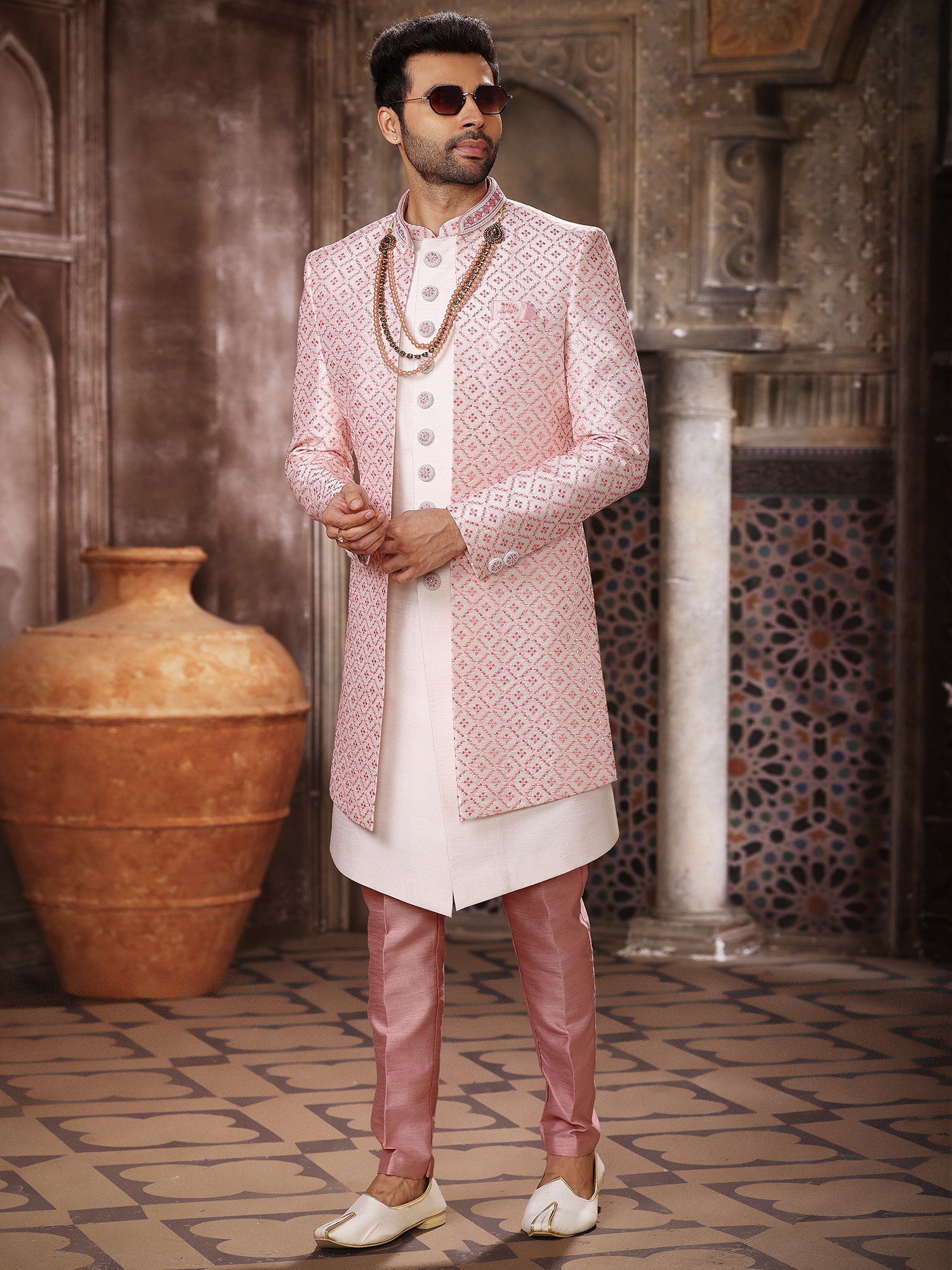 Elegant Art Silk Brocade Three Piece Indo Jacket Set With Aligarhi Pant Dazzles Grooms With Timeless Wedding Luxury