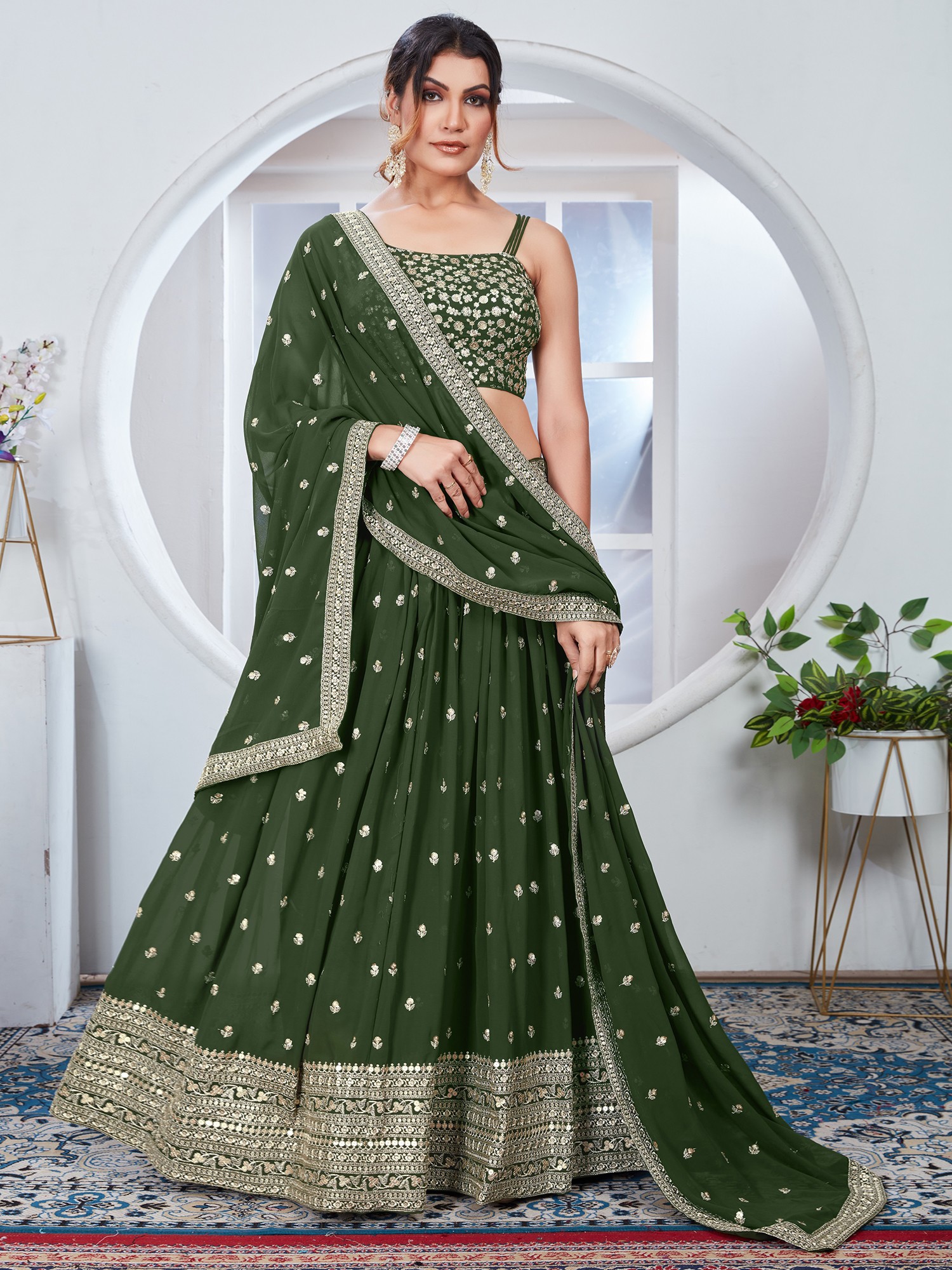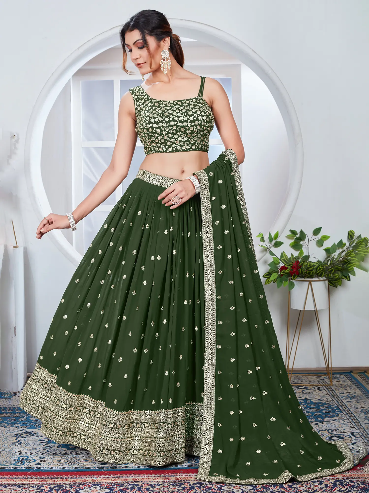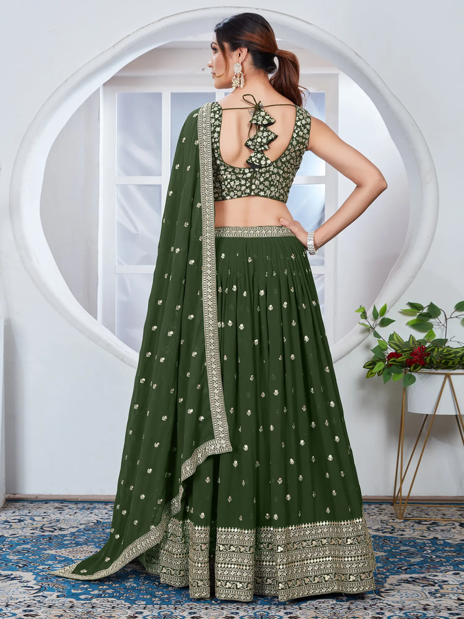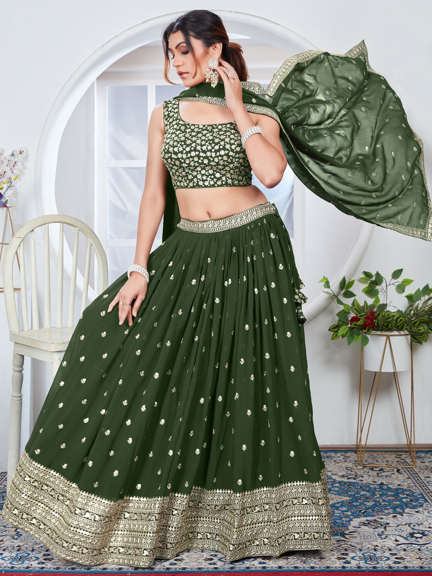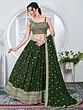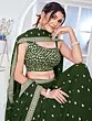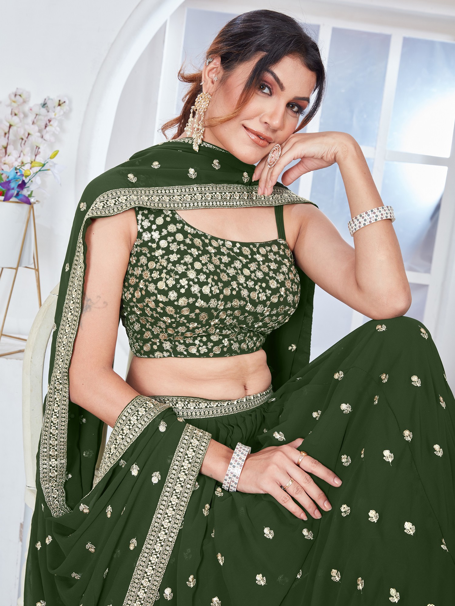 Bottle-Green Net Beads and Golden Thread Embroidery Lehenga Choli with Cutwork Dupatta