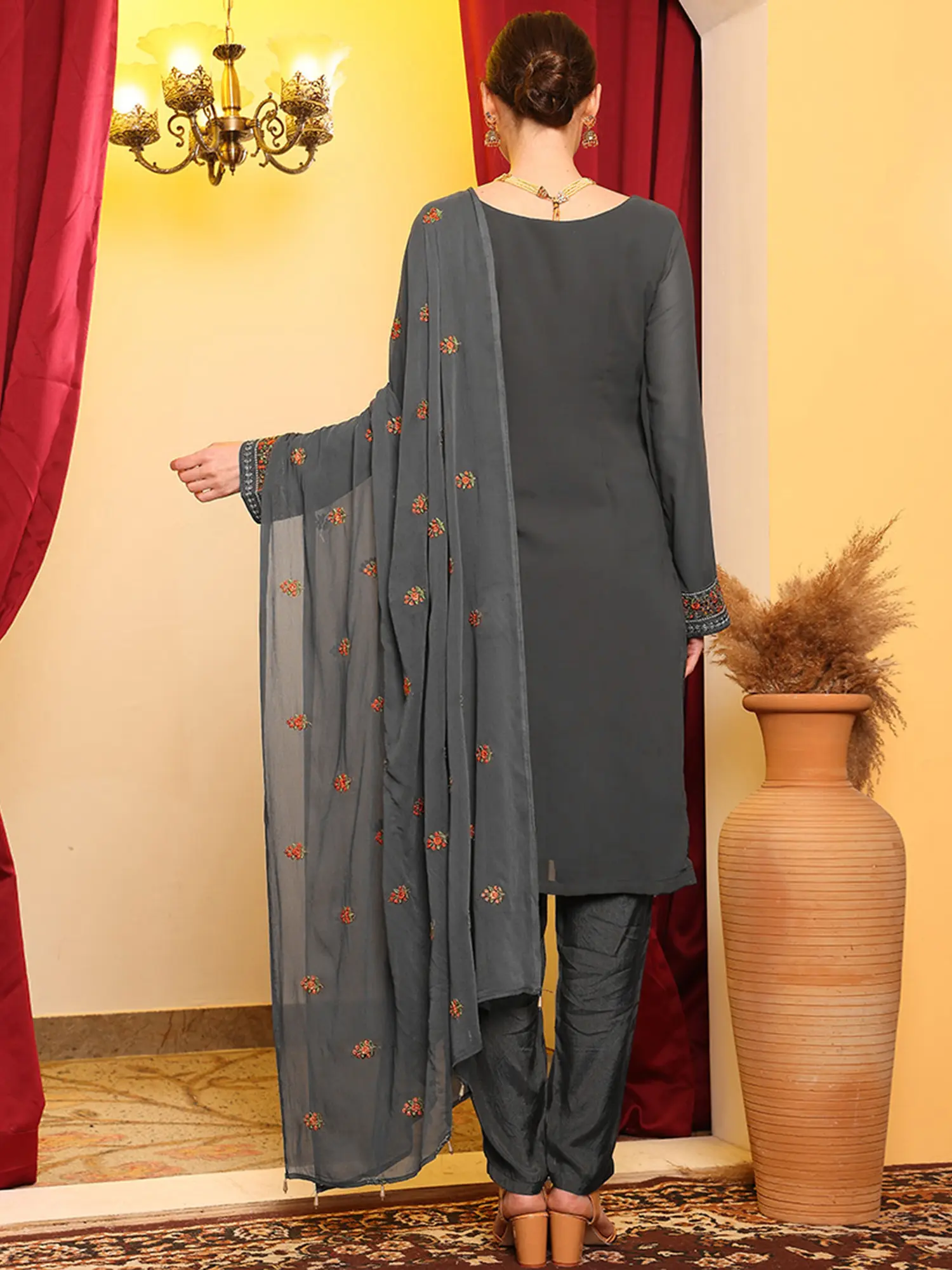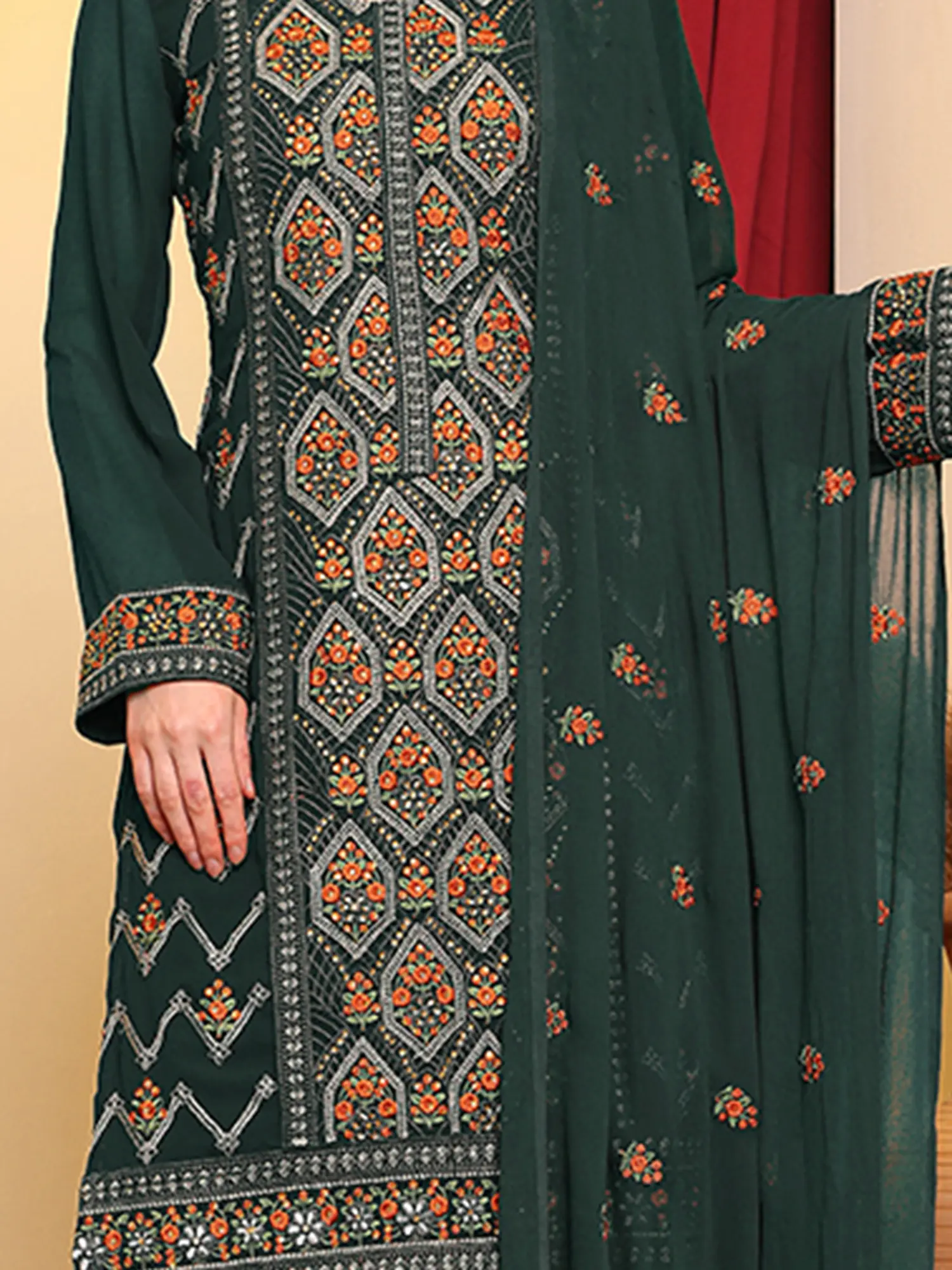 The heart of this outfit lies in its detailed embroidery. Featuring a mesmerizing geometric pattern interwoven with delicate floral motifs in vibrant orange and subtle gray threads, the work is meticulously executed to catch the eye. This rich ornamentation extends to the sleeves, adding a touch of opulence and visual interest. The neckline is also beautifully enhanced, drawing attention to the wearer's face. The fine craftsmanship ensures that each stitch contributes to a cohesive and visually appealing design, reflecting a keen sense of style and attention to detail.