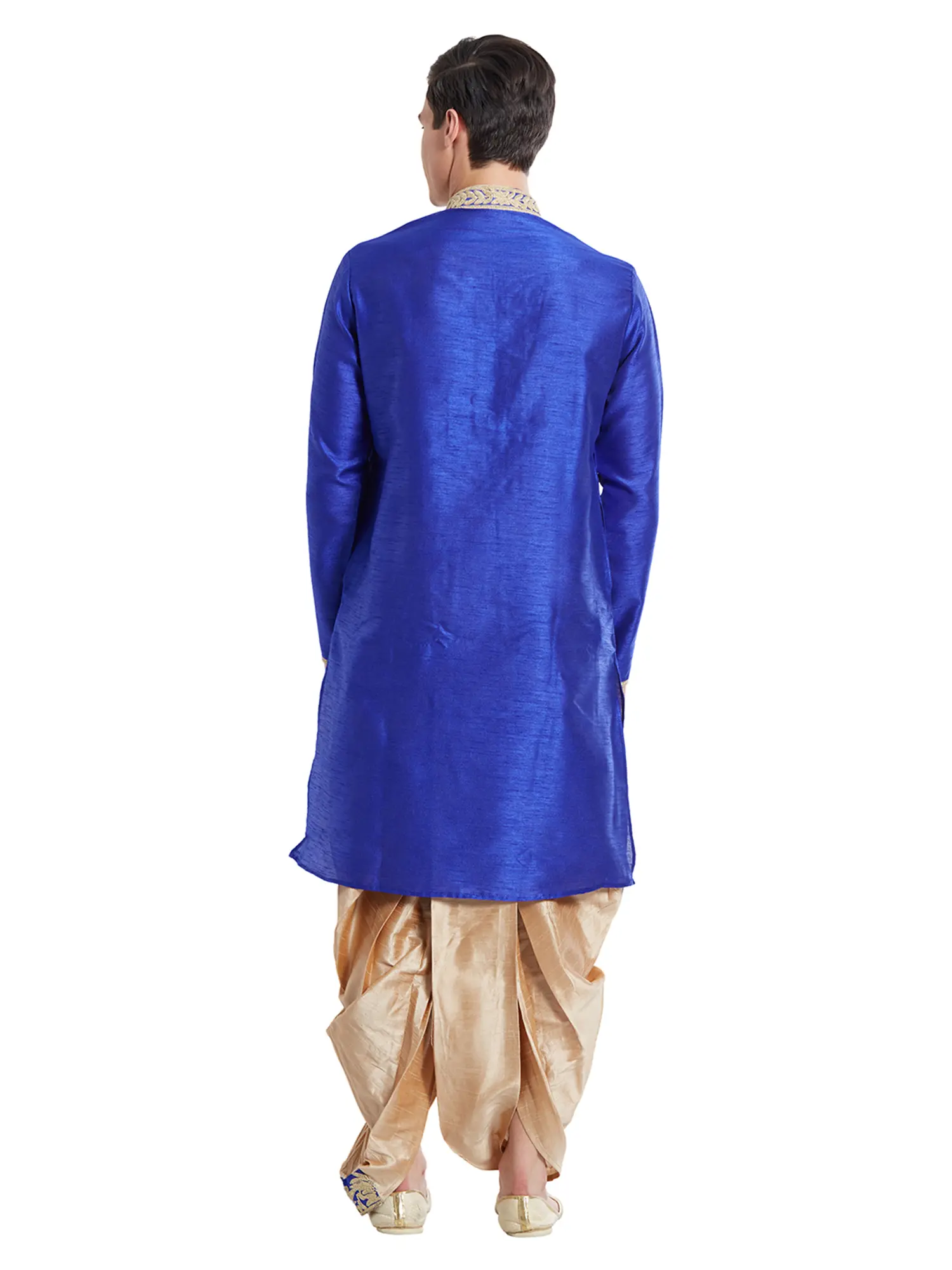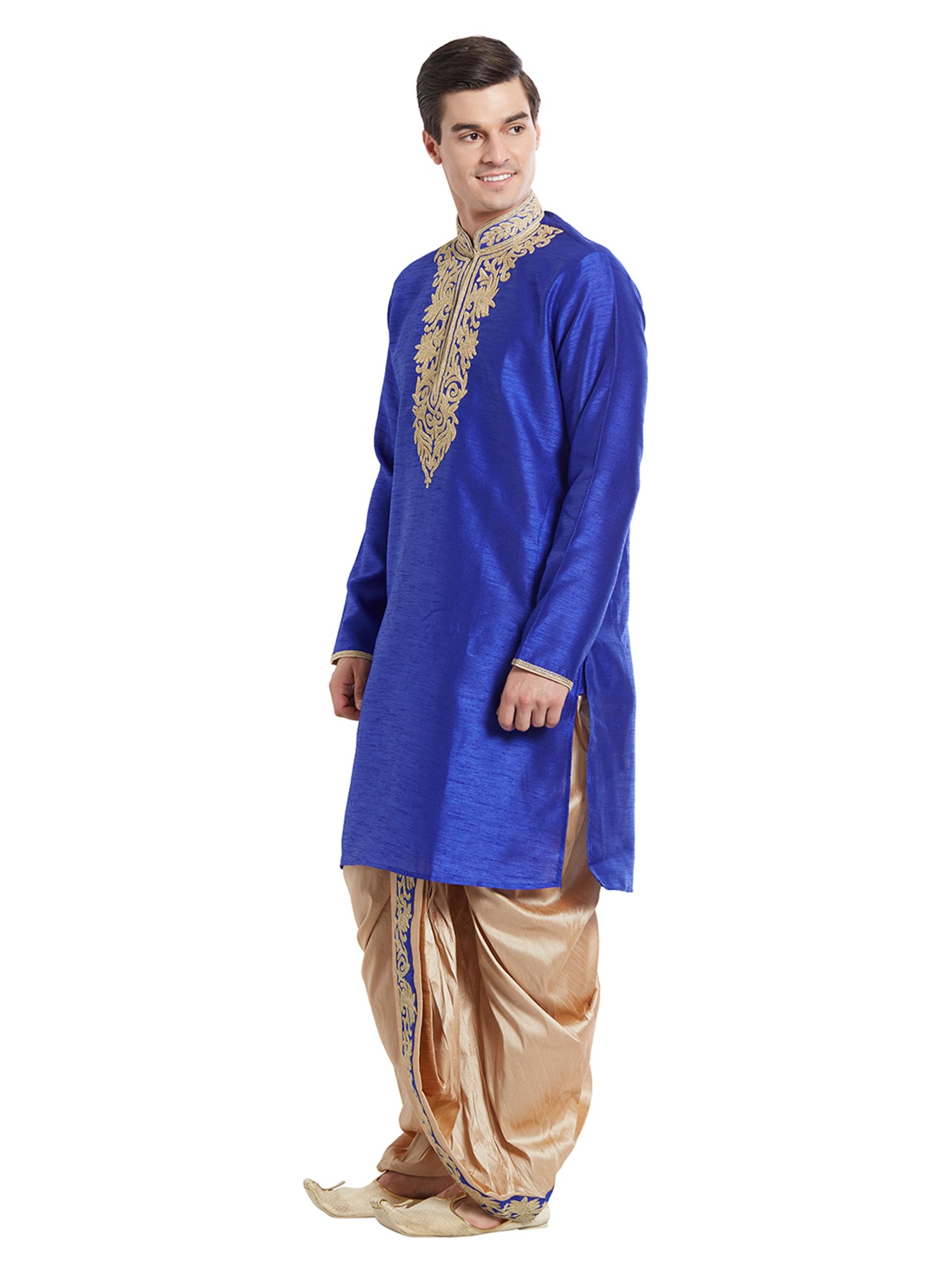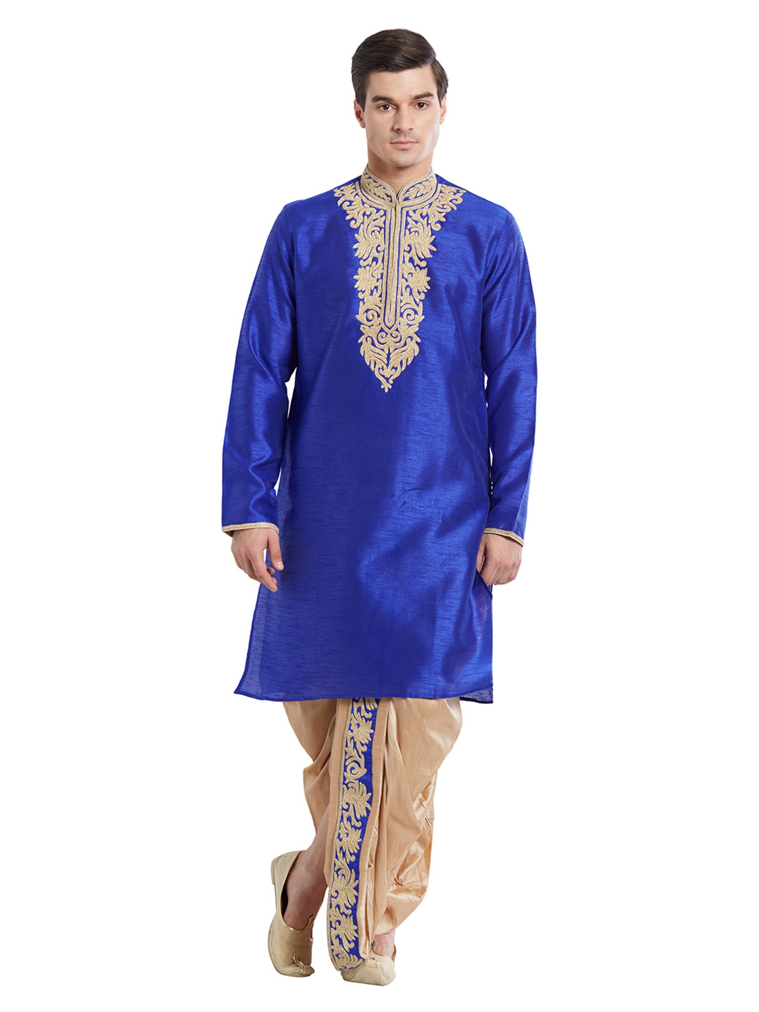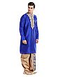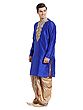 Features a rich royal blue art silk kurta with intricate gold embroidery on the neckline.