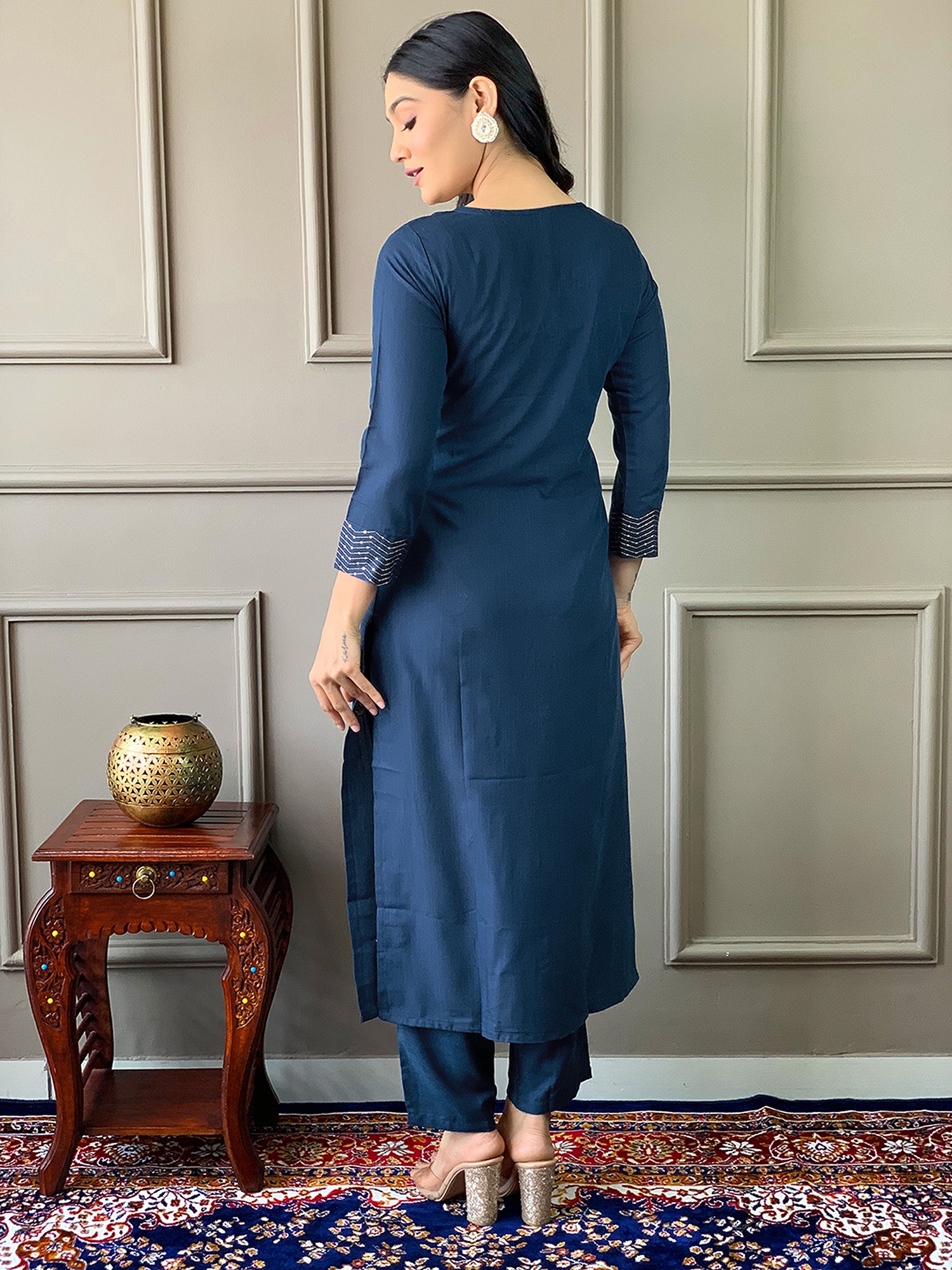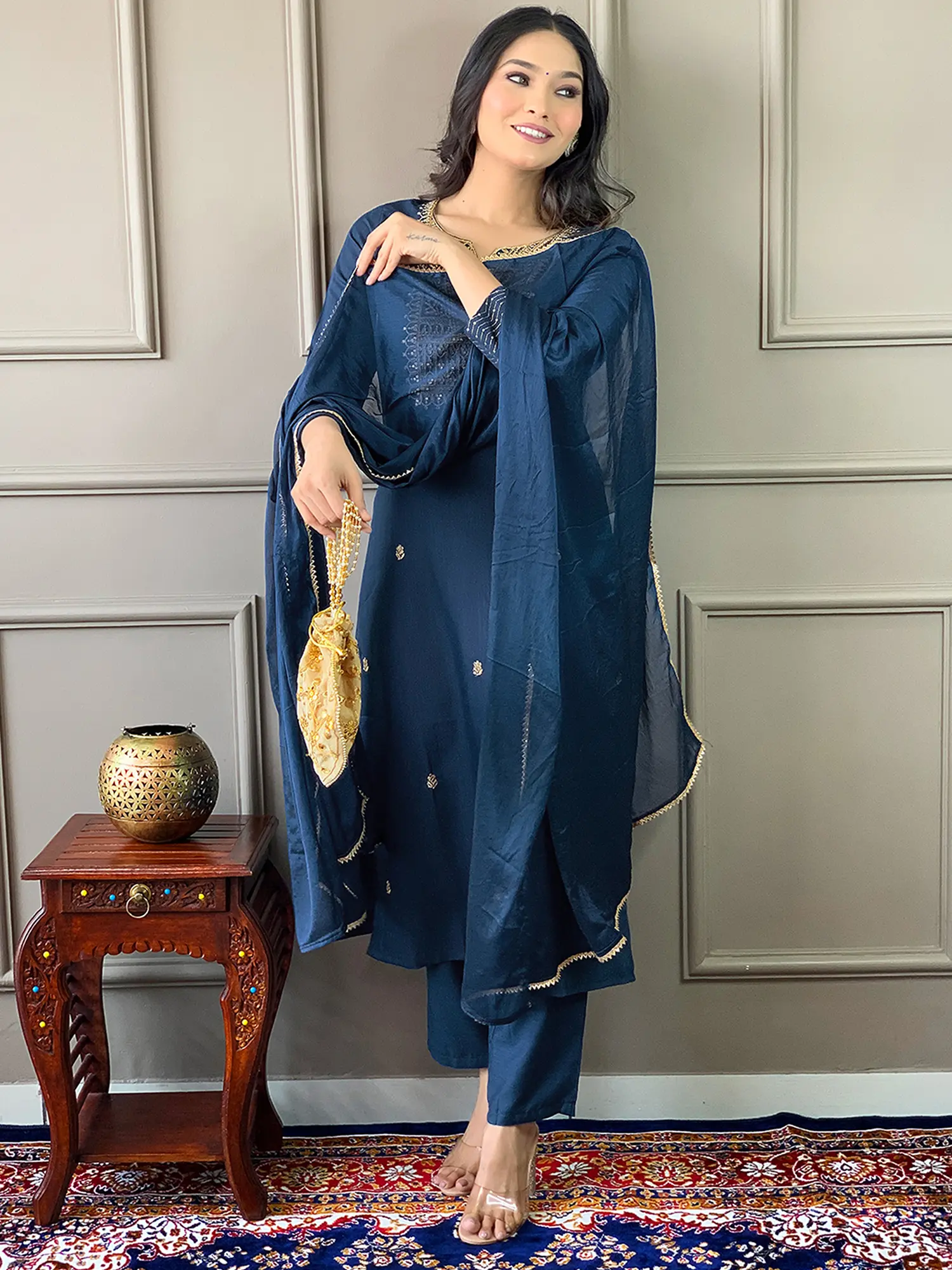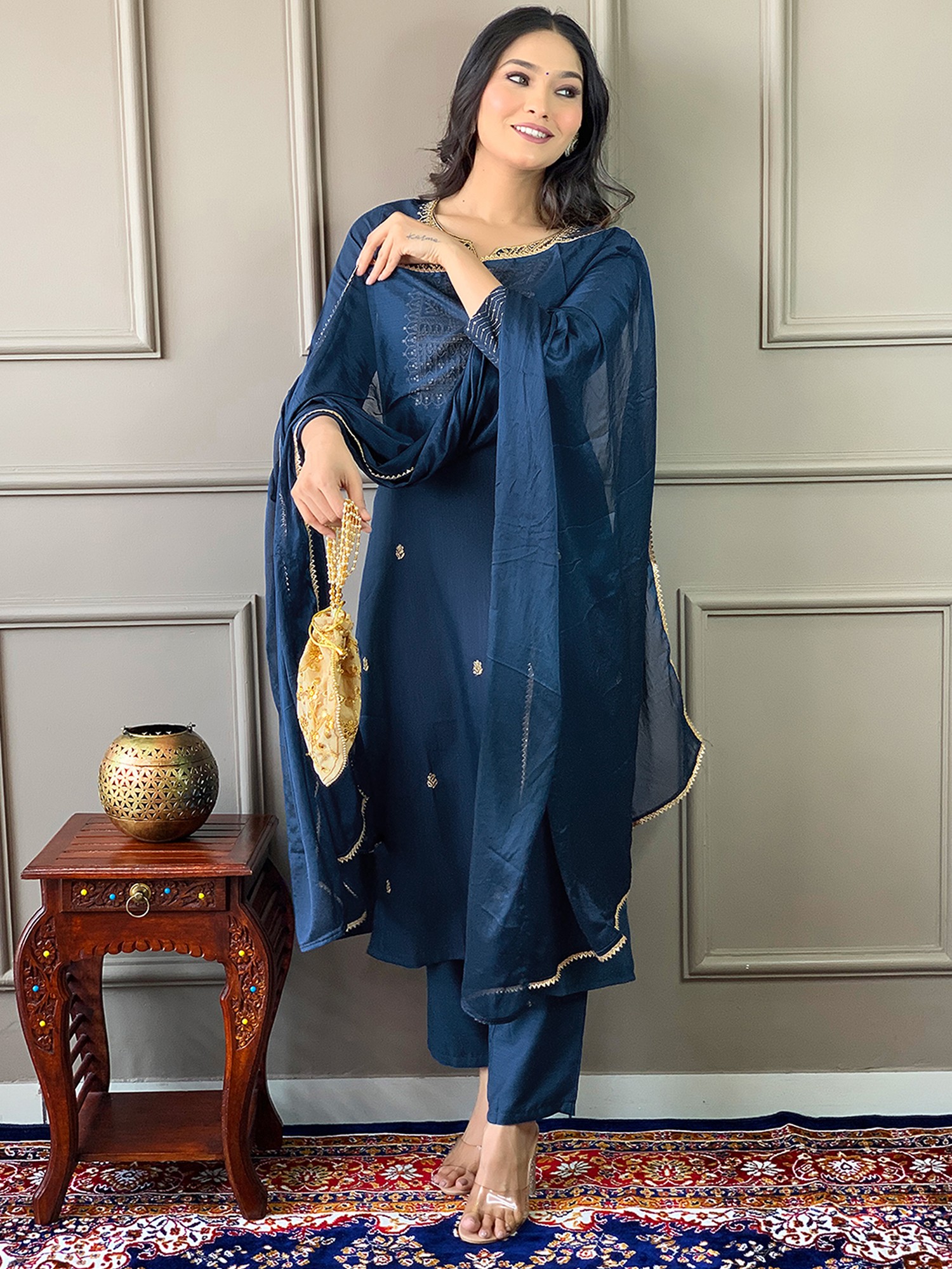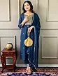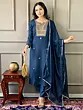 Regal-Blue Sequins Work A-Line Crepe Festive Crepe Kurta With Straight Pant And Matching Dupatta