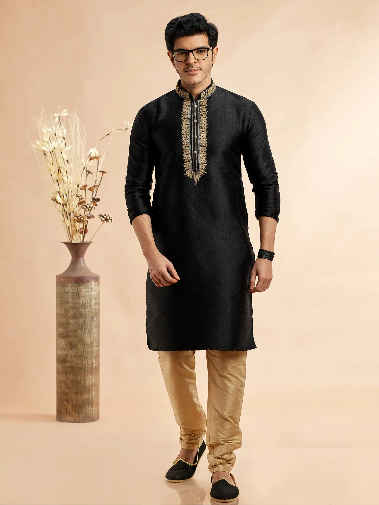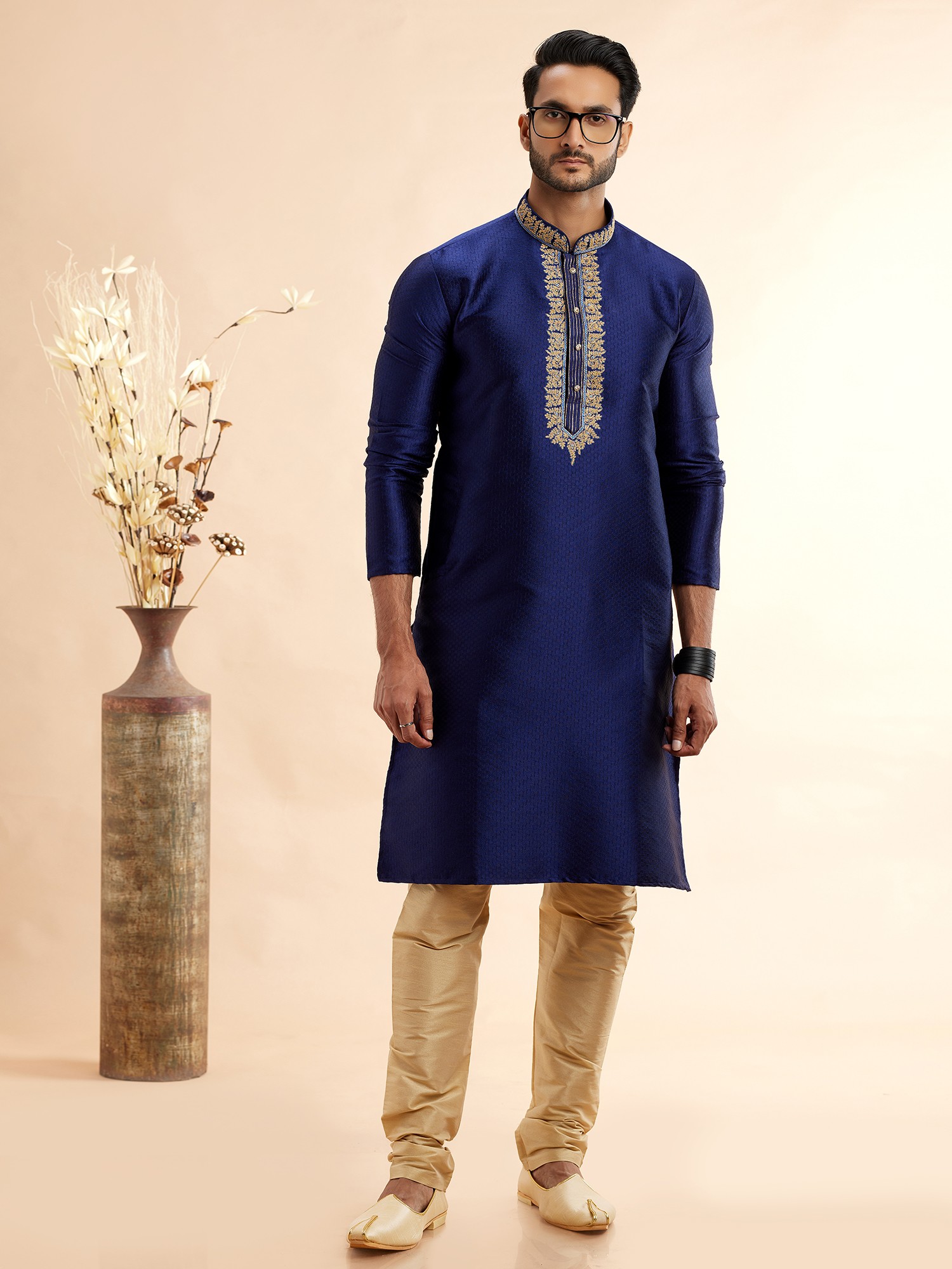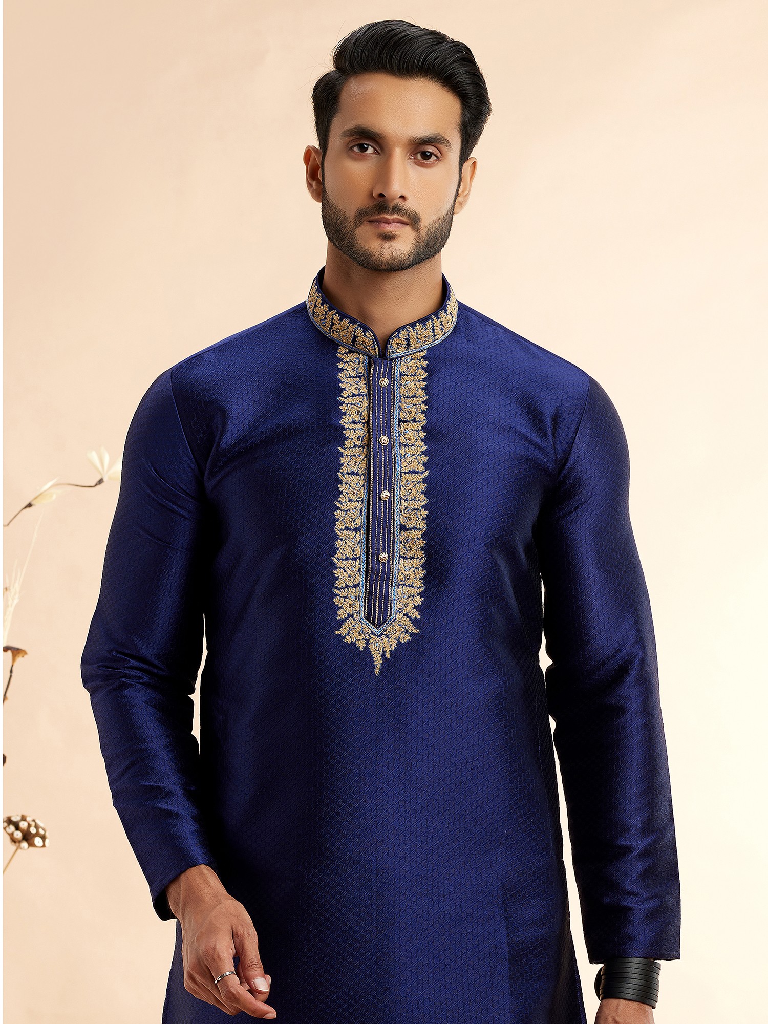 Plain Kurta Pajama Set with Zigzag Weave in Self and Embroidery on Neck