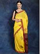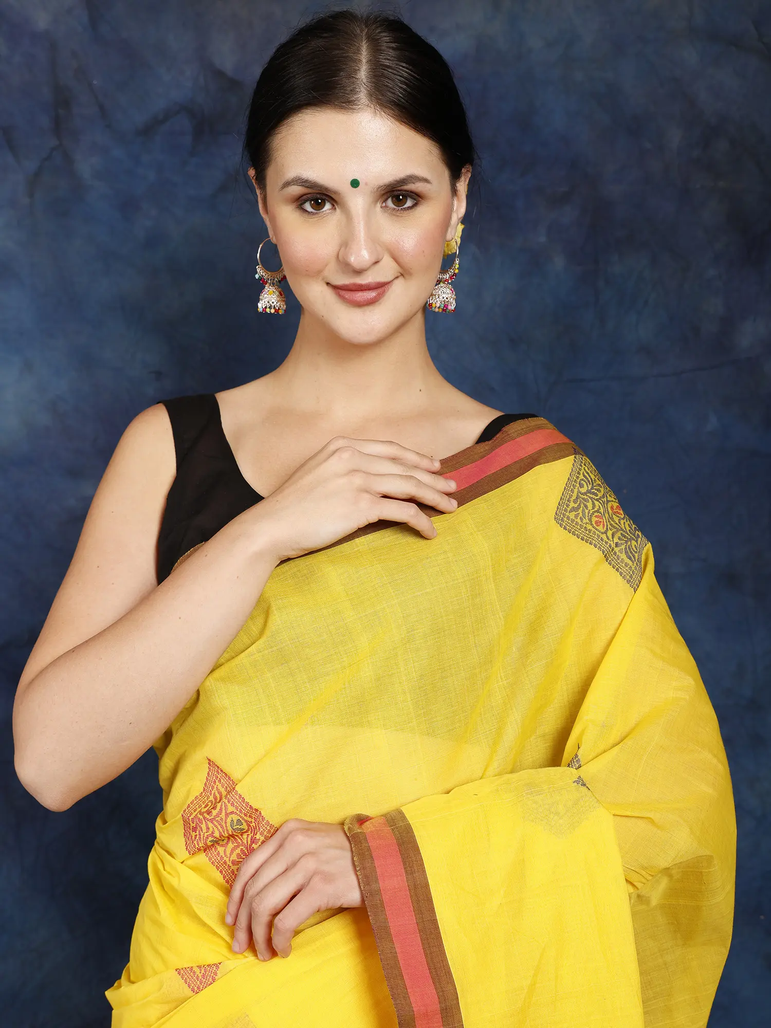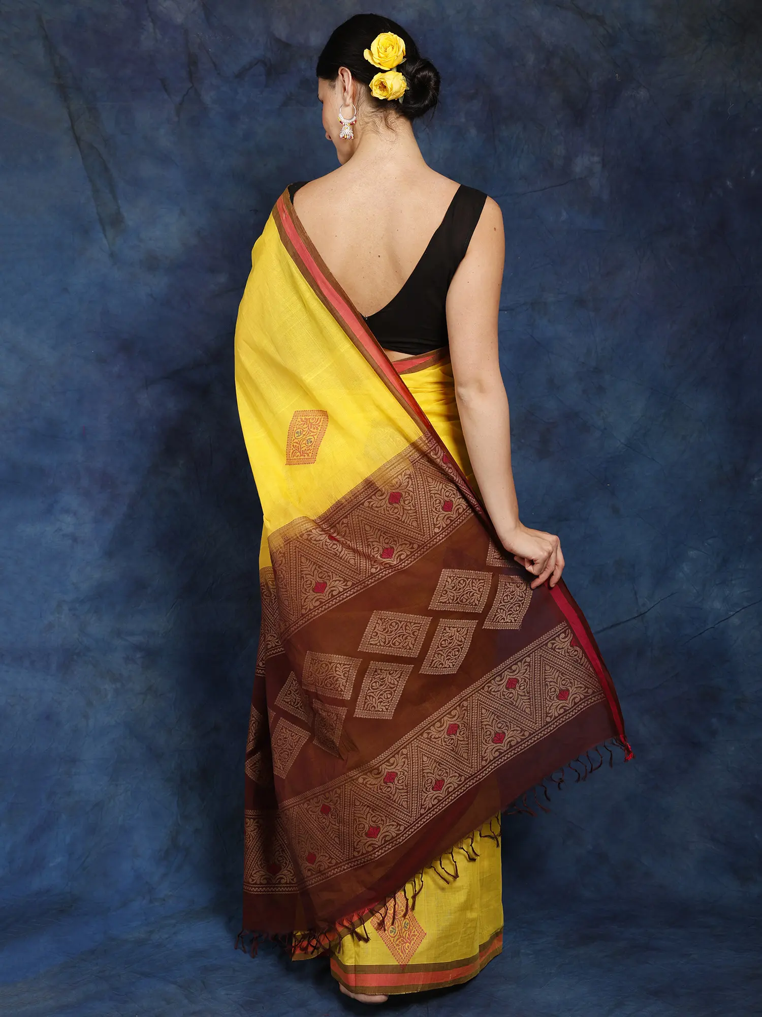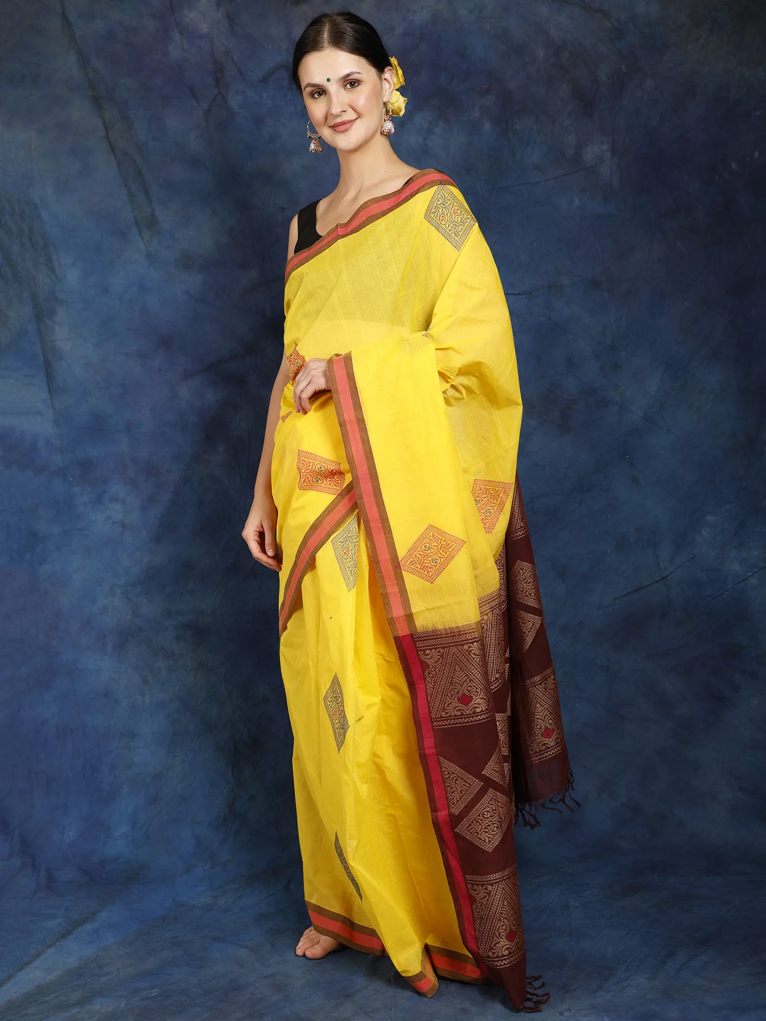 In the humble village of Negamam (Tamil Nadu) weavers create gorgeous drapes with cotton, popular as “Coimbatore cotton sarees”. A gem from their treasure, this empire-yellow pure cotton saree represents the best of Negamam weaves.