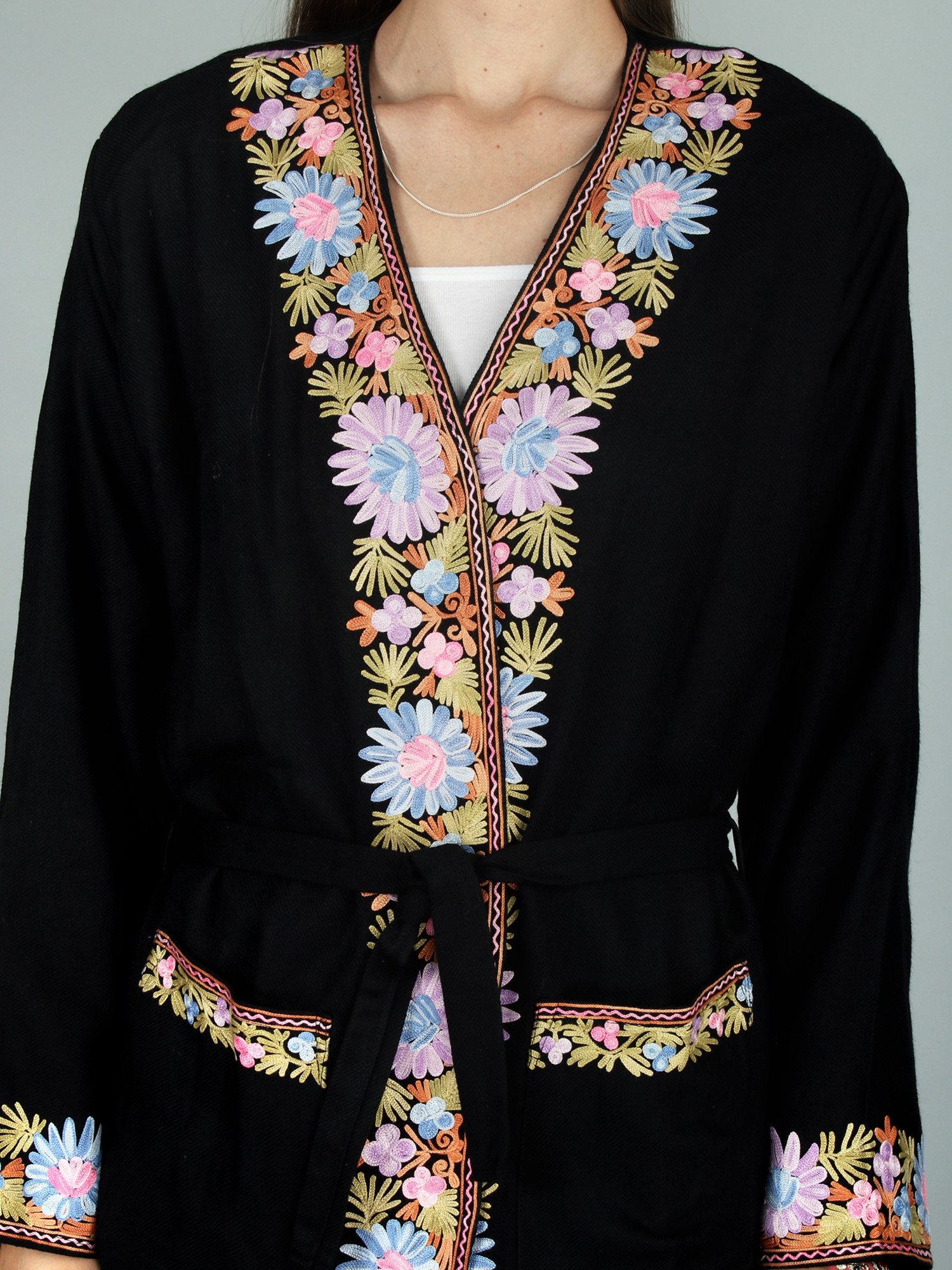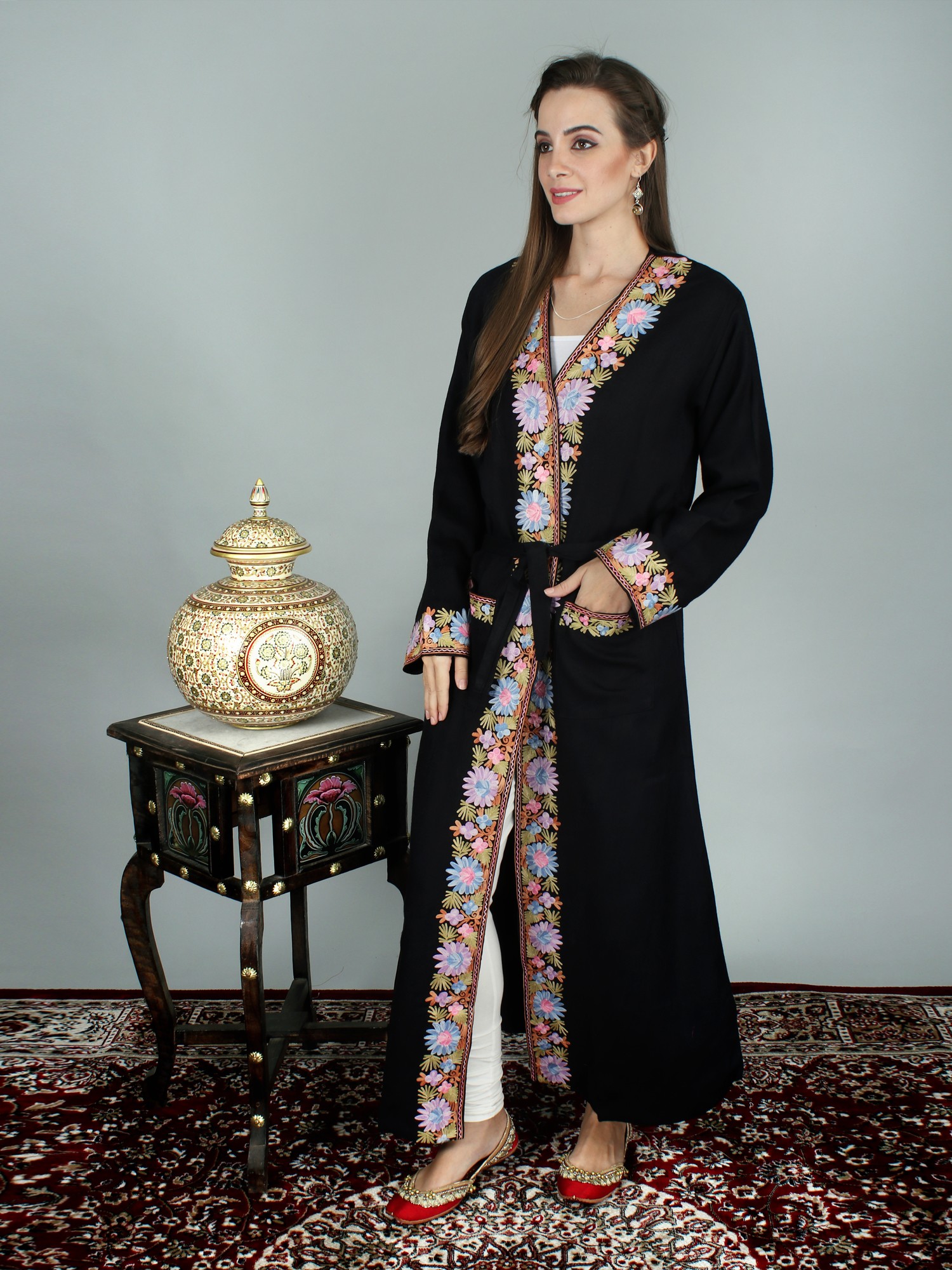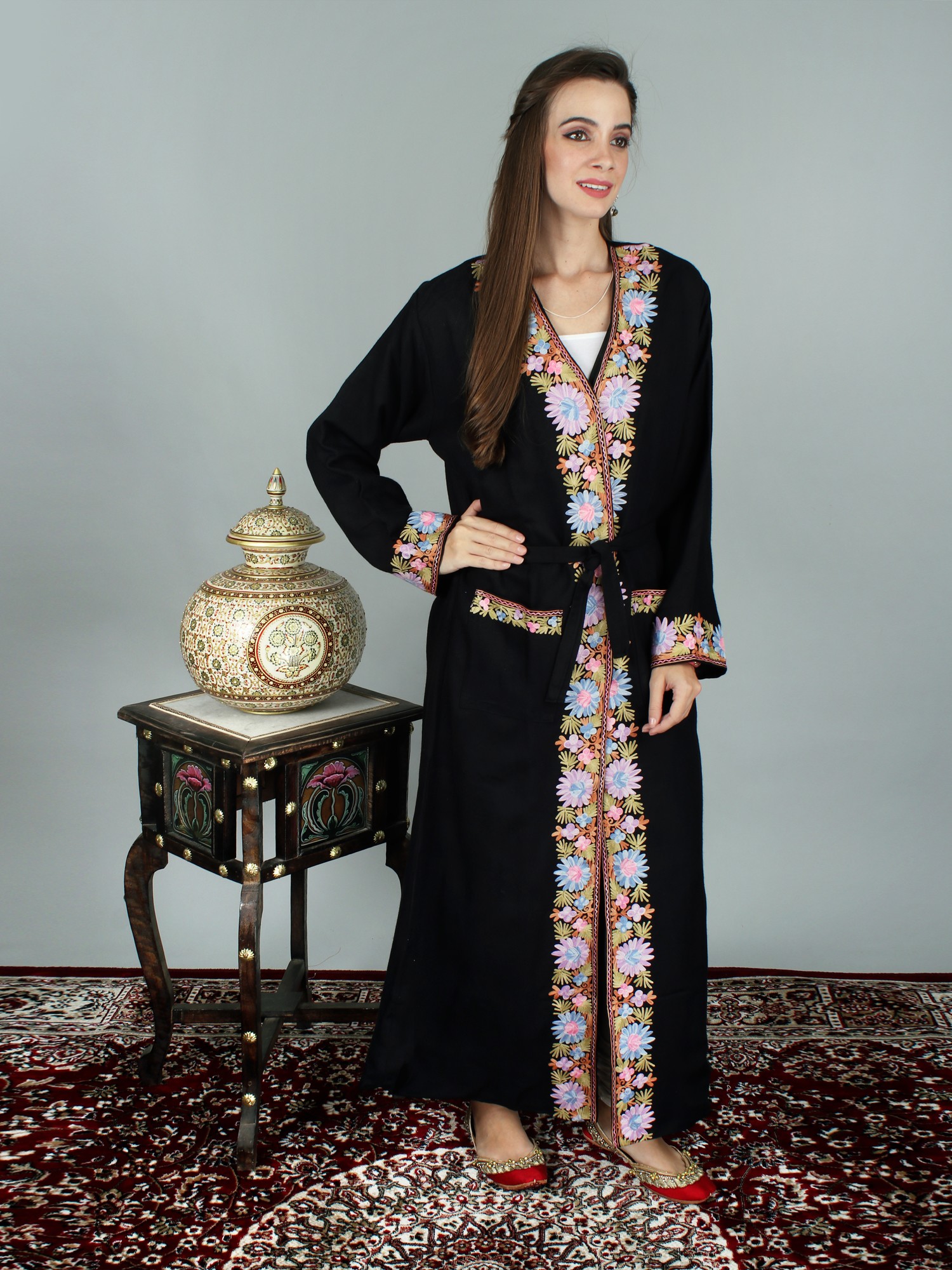 Black-Onyx Kashmiri Robe with Aari Hand-Embroidered Flowers from Kashmir