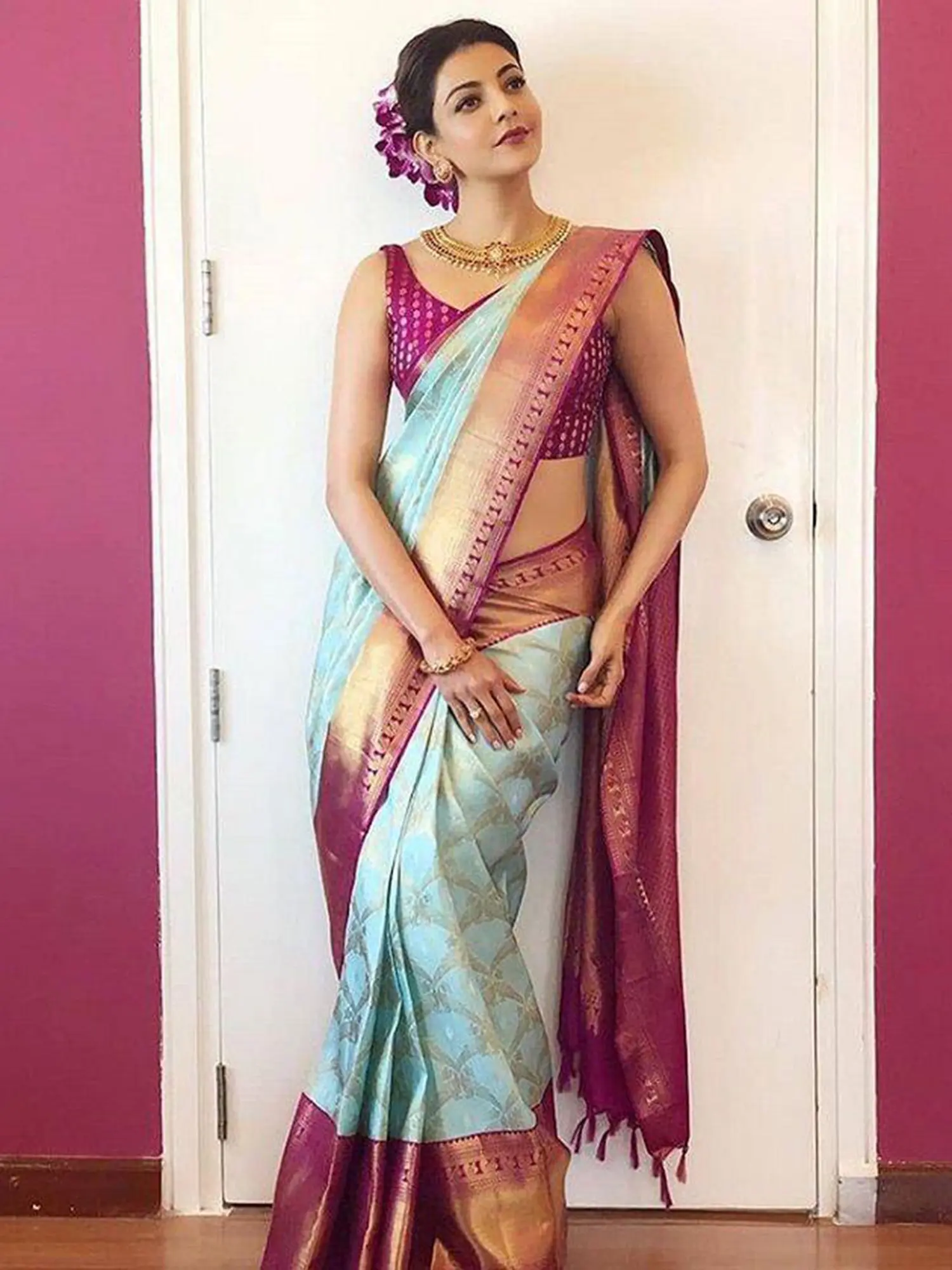 You’ll be captivated by the enchanting turquoise hue, a serene yet vibrant base that beautifully complements the rich magenta of the border and pallu. The lustrous sheen of the silk catches the light, highlighting the intricate floral motifs woven into the fabric with unparalleled precision through advanced jacquard techniques. This textural interplay creates a visual depth that is both sophisticated and alluring, promising a graceful drape that moves with you. The accompanying blouse and underskirt are expertly tailored to ensure a perfect, bespoke fit for your comfort.