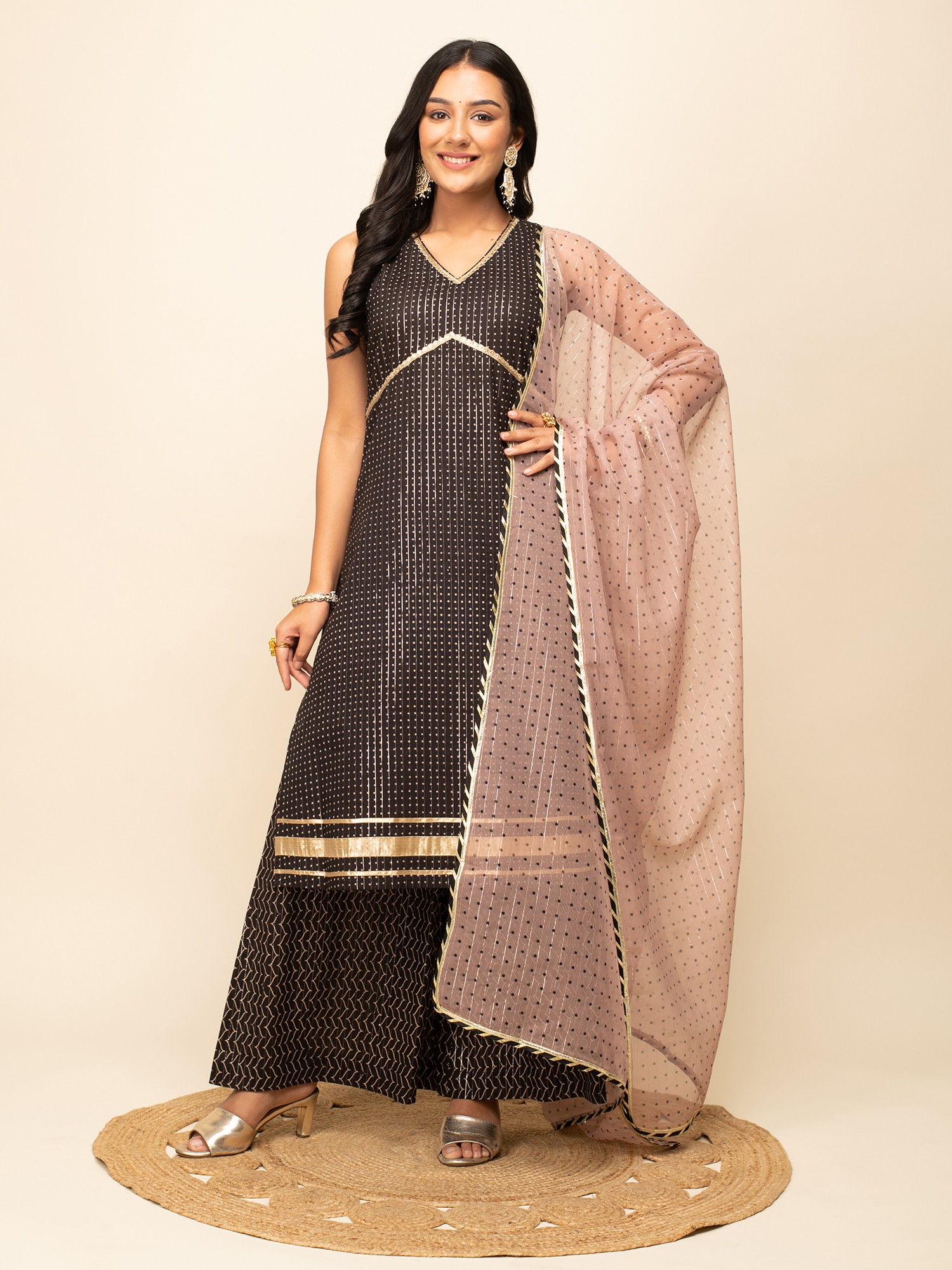 Completing the ensemble is a lightweight dupatta. Its soft texture drapes beautifully, adding a touch of grace to your look. The fabric complements the kurta and palazzo, creating a cohesive and polished appearance.