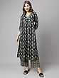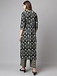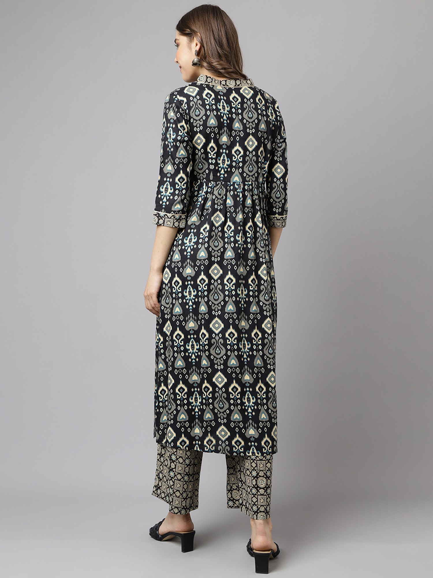 This ensemble offers a striking blend of contemporary design and traditional aesthetics, making it a versatile addition to your wardrobe. The kurta showcases a sophisticated V-neckline that elongates the silhouette and provides a modern touch. What truly sets it apart is the intricate, all-over print of ethnic motifs. These patterns, rendered in a palette of muted tones, create a visually appealing texture and imbue the garment with a sense of timeless artistry. The three-quarter sleeves offer a comfortable and stylish length, making it suitable for various occasions and seasons. The overall cut of the kurta is flattering and relaxed, allowing for ease of movement while maintaining a refined appearance. The included palazzo pants beautifully complement the kurta, featuring a harmonious design that ties the entire outfit together.