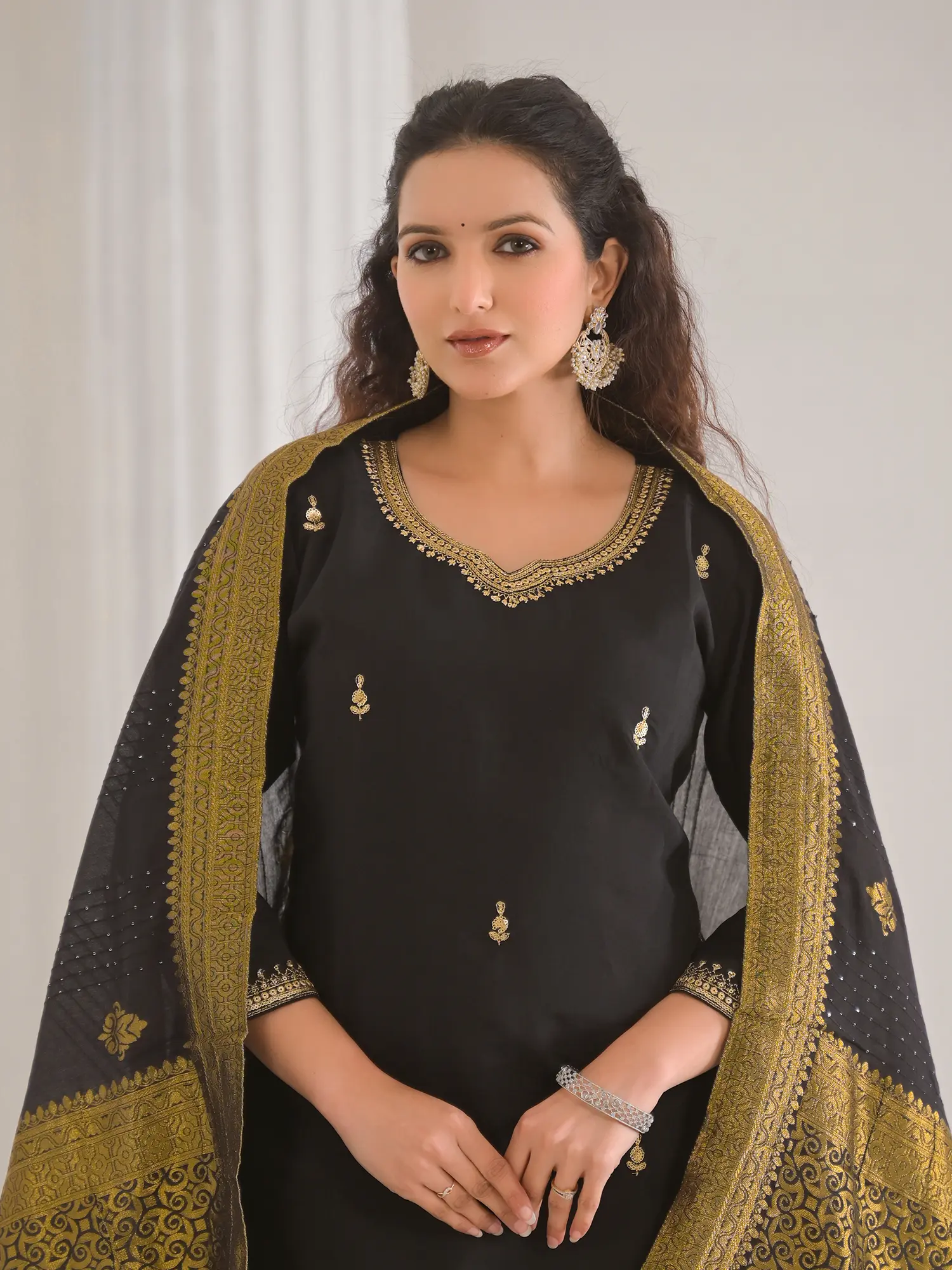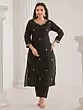 Indulge in the understated opulence of this salwar kameez set, designed to bring a touch of classic charm to your festive wardrobe. The ensemble exudes sophistication with its rich, deep color and thoughtfully placed thread embroidery, creating a look that is both timeless and contemporary. The subtle sheen of the fabric enhances its luxurious appeal, making it perfect for celebrations and special occasions.