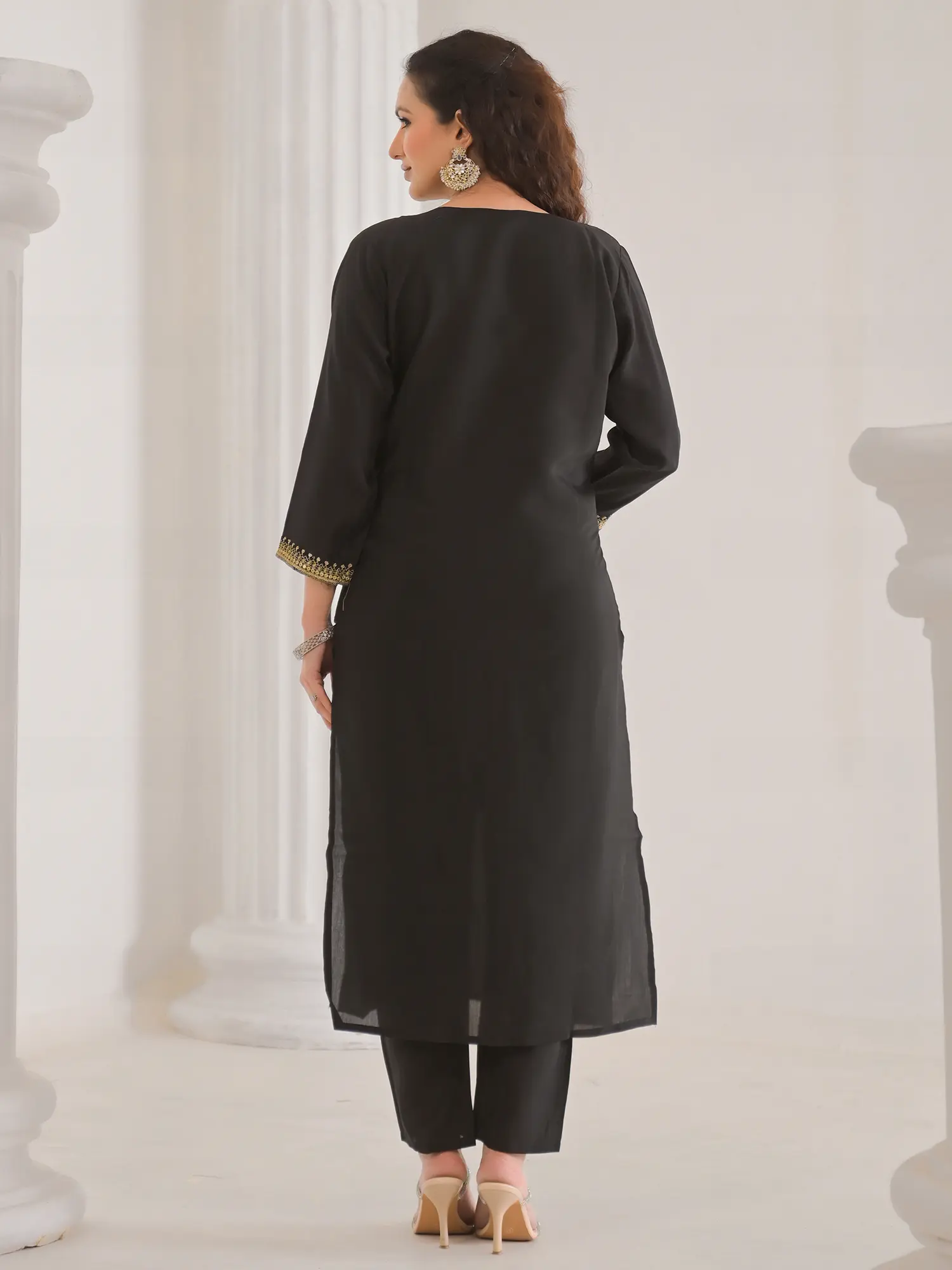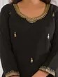 The beauty of this outfit lies in its meticulous craftsmanship. Delicate ethnic motifs are artfully embroidered across the kurta, adding a subtle yet captivating texture. The neckline is finished with a complementary embroidered design, framing the face beautifully. The sleeves are equally adorned with delicate embroidery, echoing the detailing found throughout the kurta. Each stitch speaks to the care and attention to detail that has gone into creating this exquisite piece.
