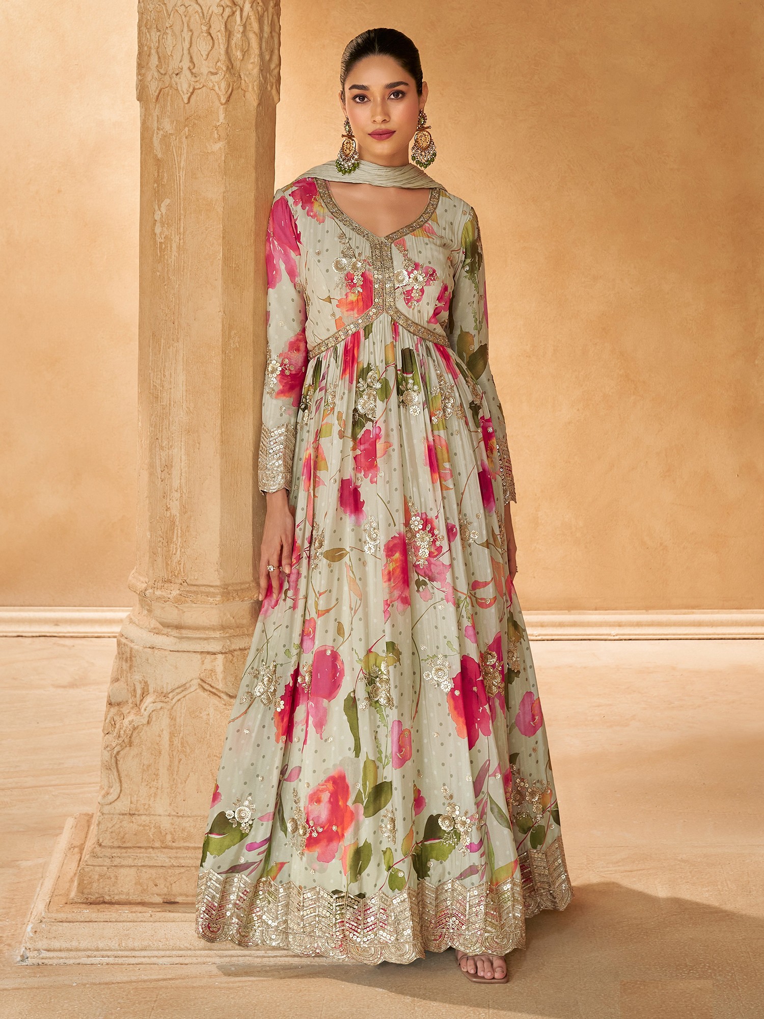 All Over Printed Faux Georgette Gown Double Frill Patterns Floral Design Ethnic Party Casual Festive Modern Wear