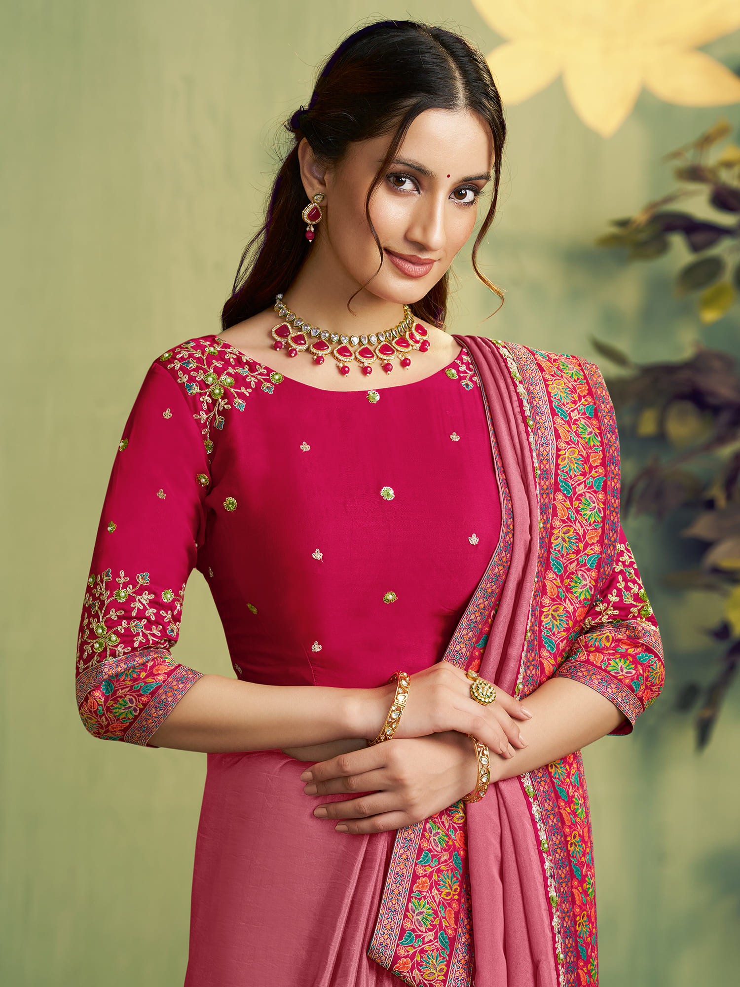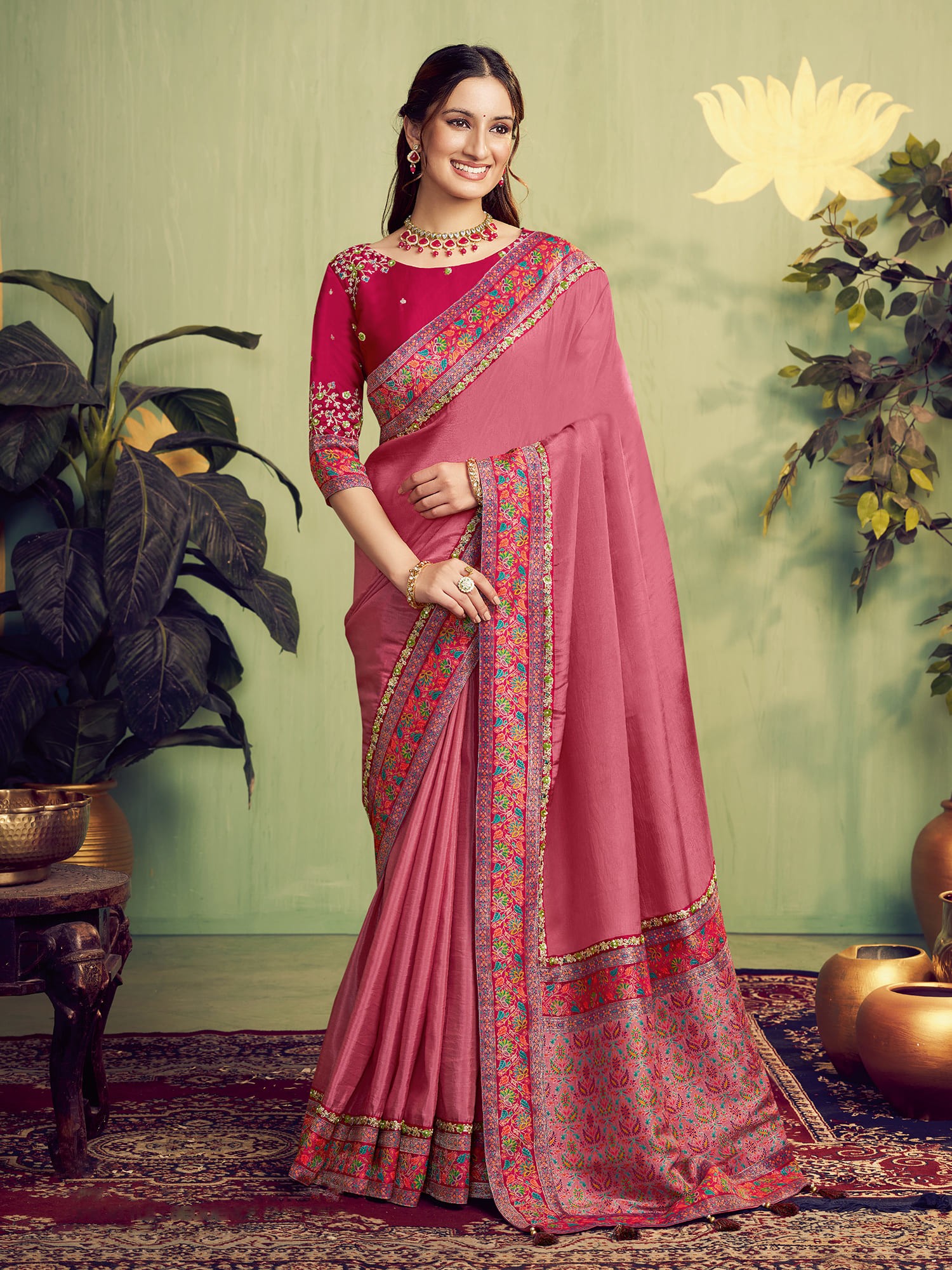 The rich, opulent hue of this silk drapes beautifully, creating a silhouette of unparalleled grace. Its borders are adorned with a symphony of vibrant patterns, intricately detailed with shimmering sequences and carefully placed stones that catch the light with every movement. This blend of visual splendor and tactile delight transforms the simple act of wearing a saree into an experience of pure luxury.