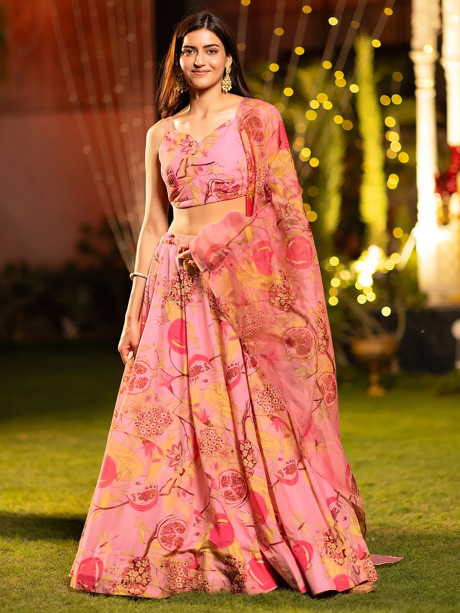 Beautiful Heavy Airtex Chinon Lehenga Choli With Dupatta In Stunning Yellow Pink Floral Heavy Digital Print Design