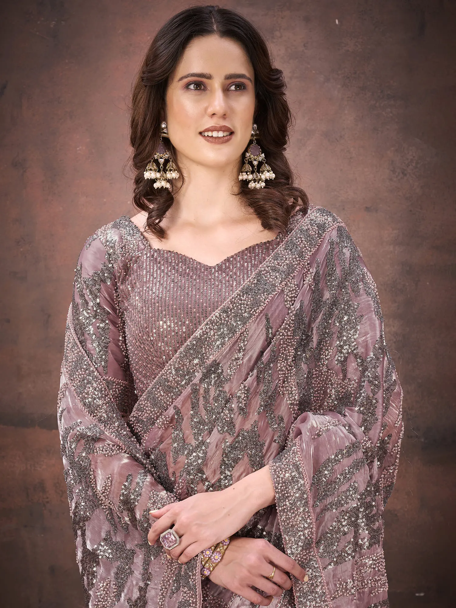 Stunning Shaded Chinon Saree Featuring Premium Double Color Swarovski Embroidery And Elegant Subtle Piping Detailing