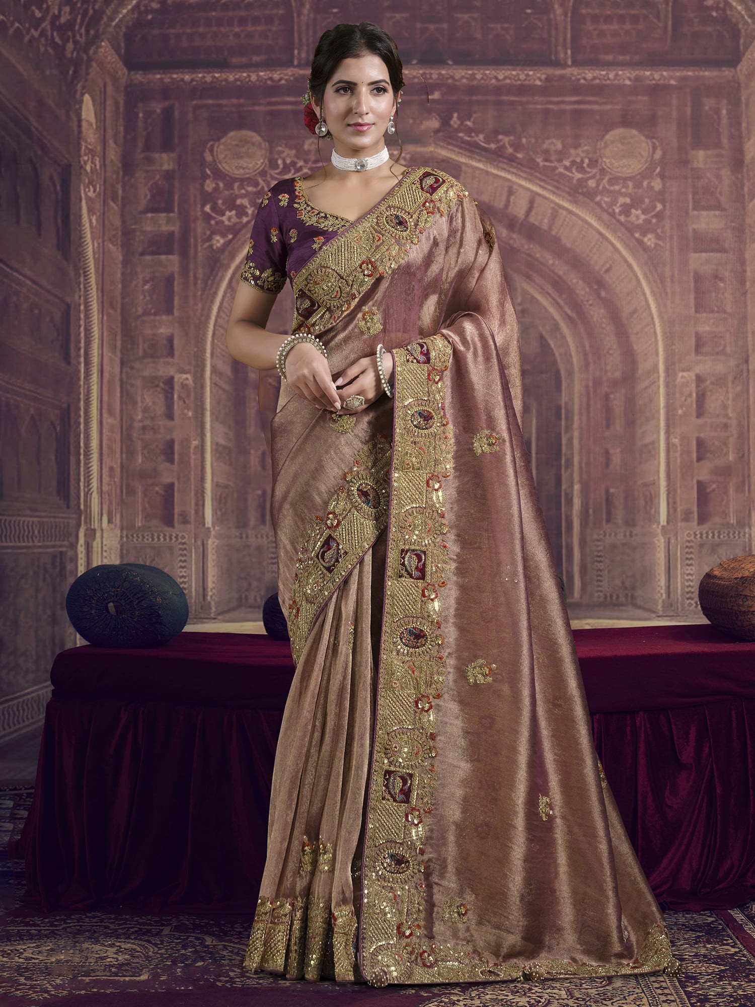 Elegant Velvet Foil Coated Brasso Saree Showcasing Pure Beads Handwork Stunning Designer Choice For Wedding