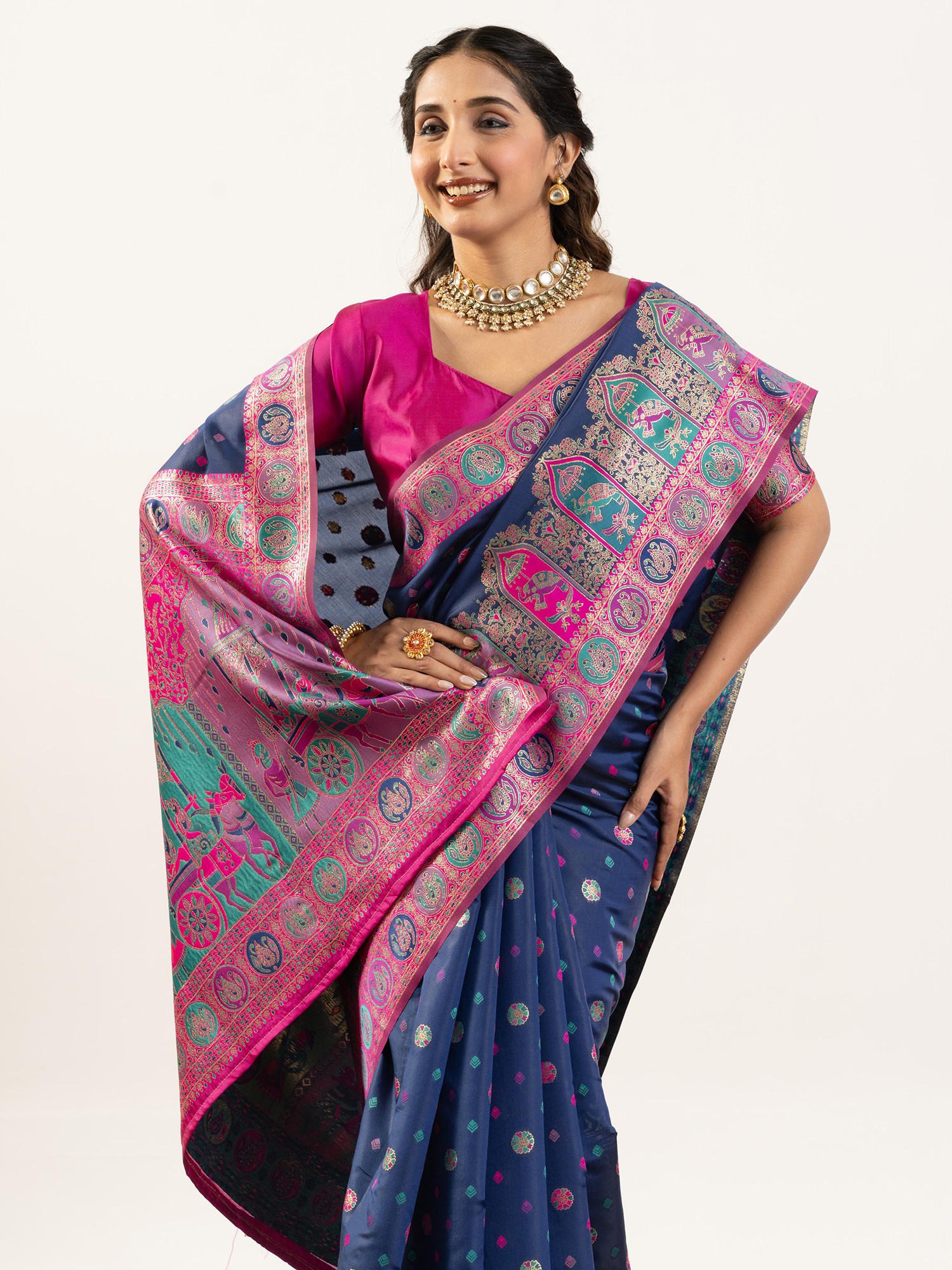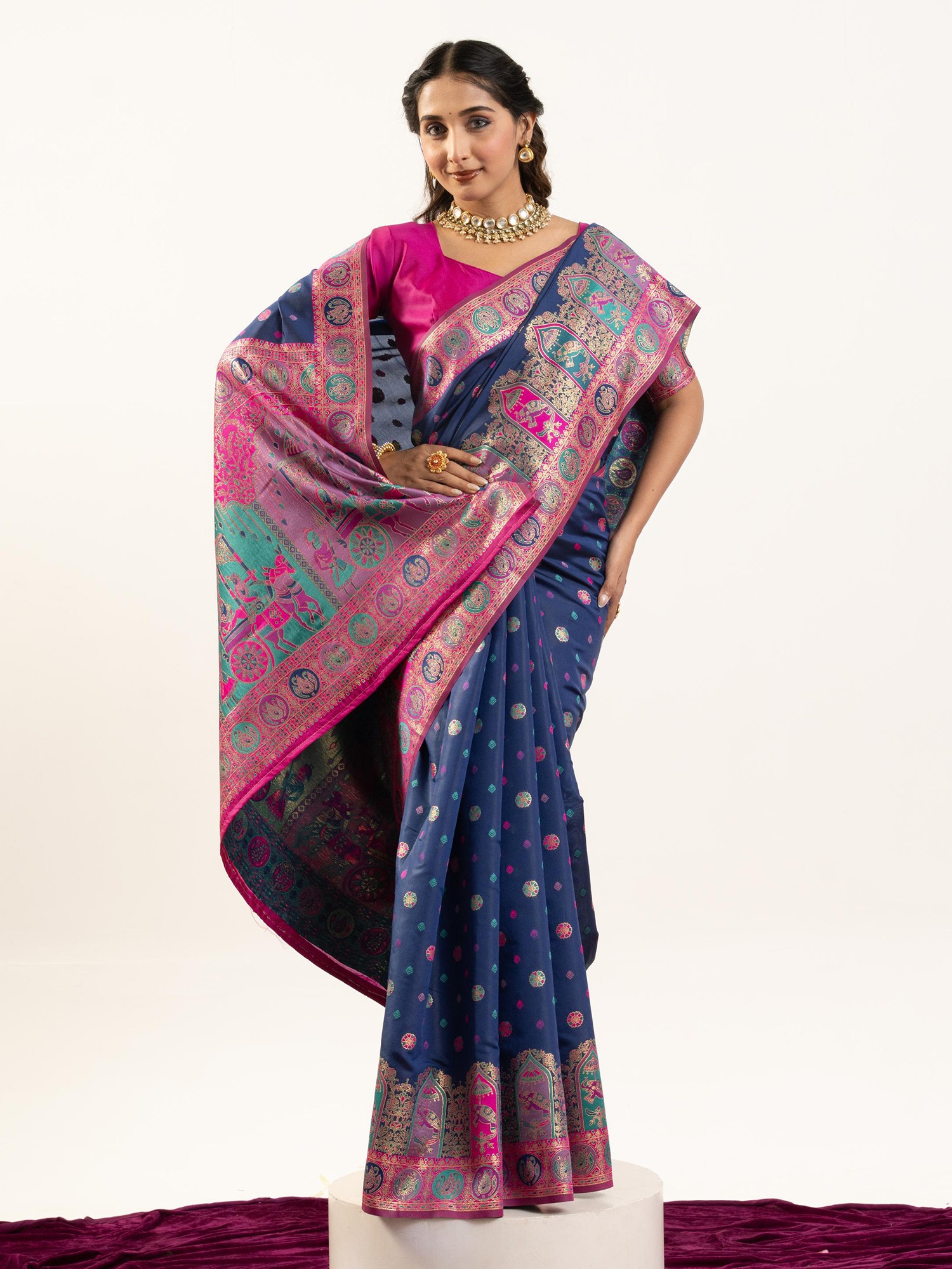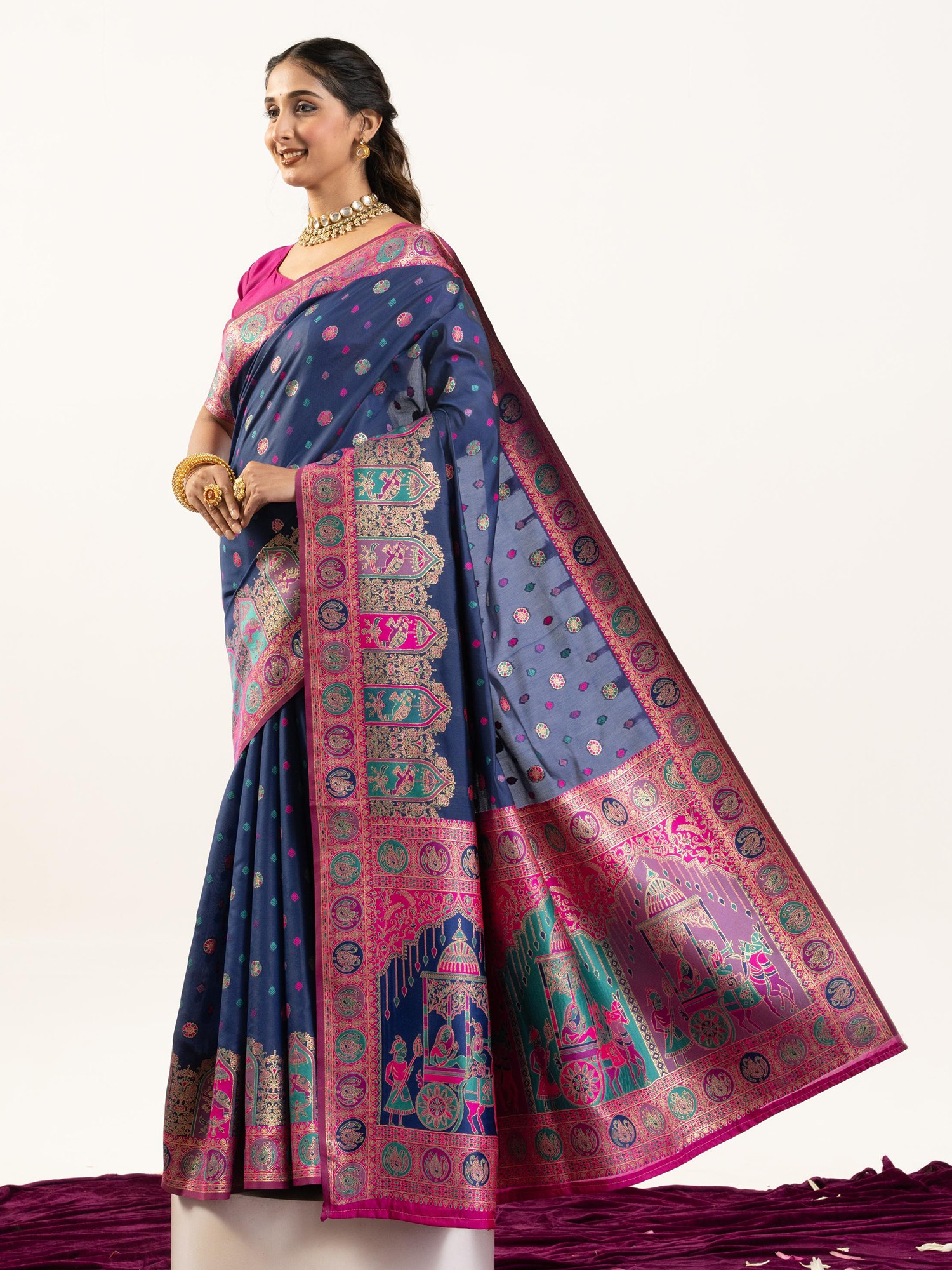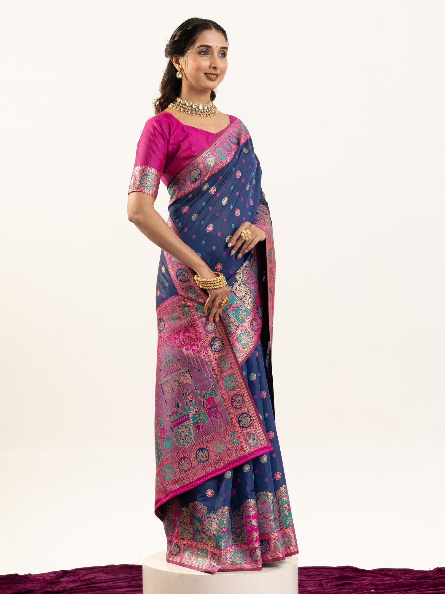 The deep, captivating hue serves as a perfect canvas for the vibrant Meenakari work that adorns its borders and pallu. Intricate motifs, reminiscent of ancient art and regal celebrations, come alive in a symphony of colors, catching the light and drawing the eye. The meticulously woven patterns create a rich texture that is both visually striking and delightful to the touch. The accompanying blouse and underskirt are custom-tailored to ensure a flawless fit, enhancing the overall silhouette and your comfort.