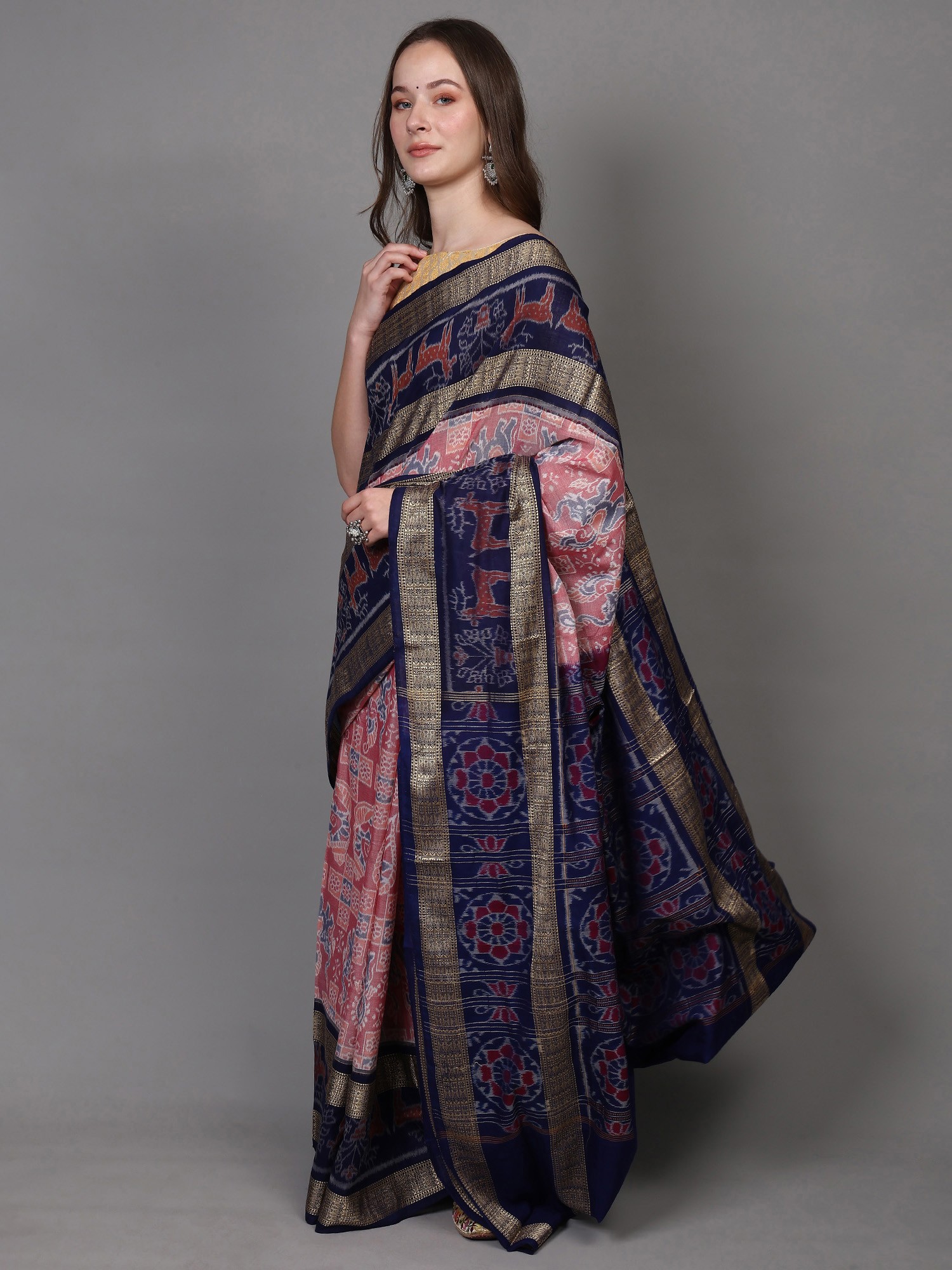 Whitecap-Gray Ikat Handloom Pure Cotton Saree with Contrast Blue Temple Border from Sambalpur