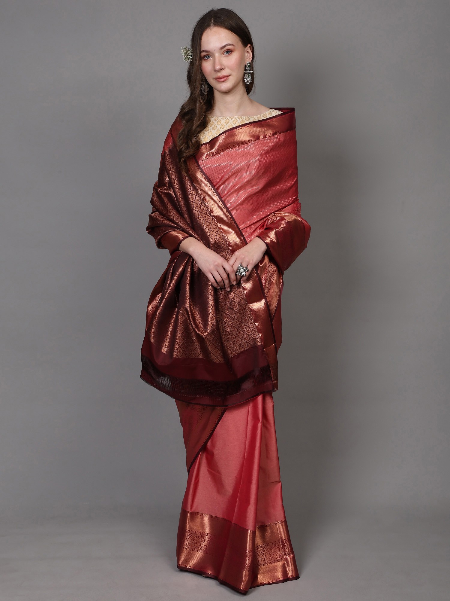 Dual Shade Pure Silk Saree with Golden Zari Woven Peacock-Elephant Motif Broad Border and Bold Aamra Motif on Pallu